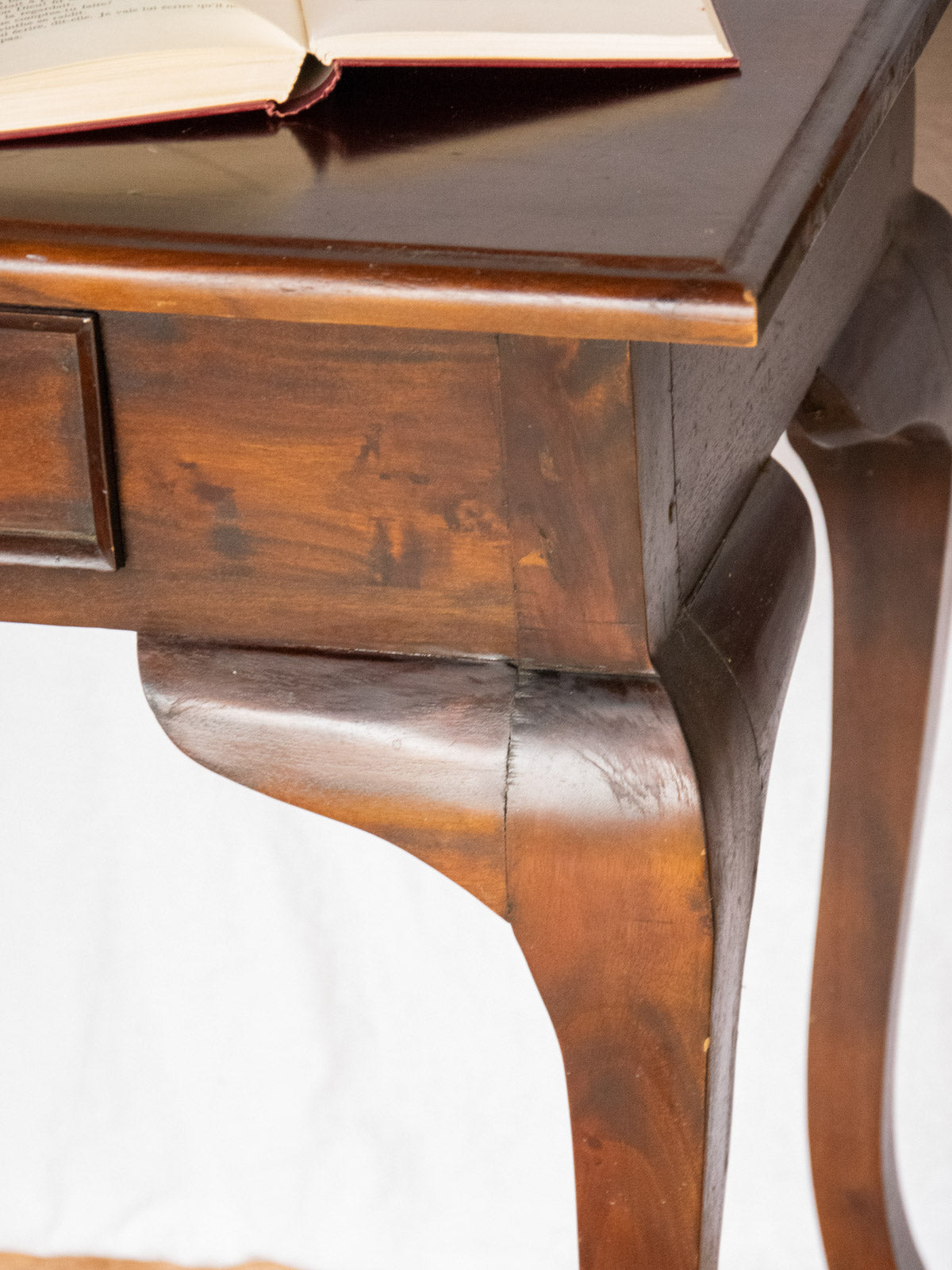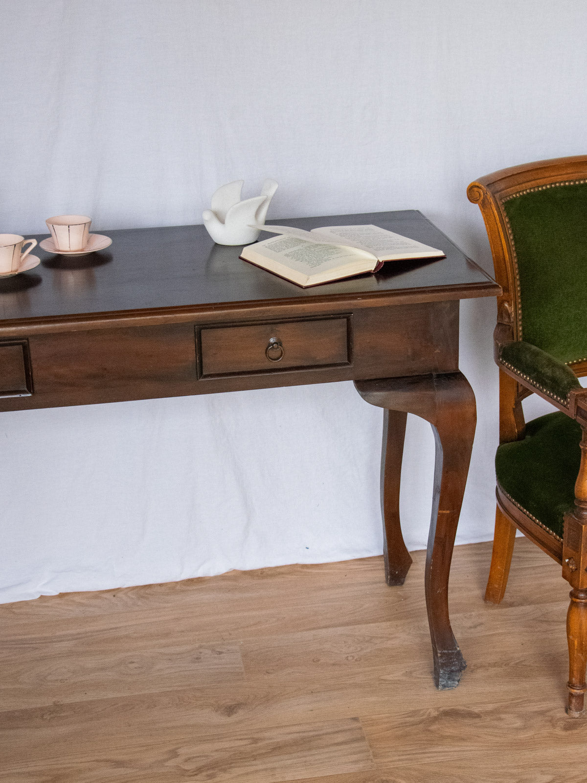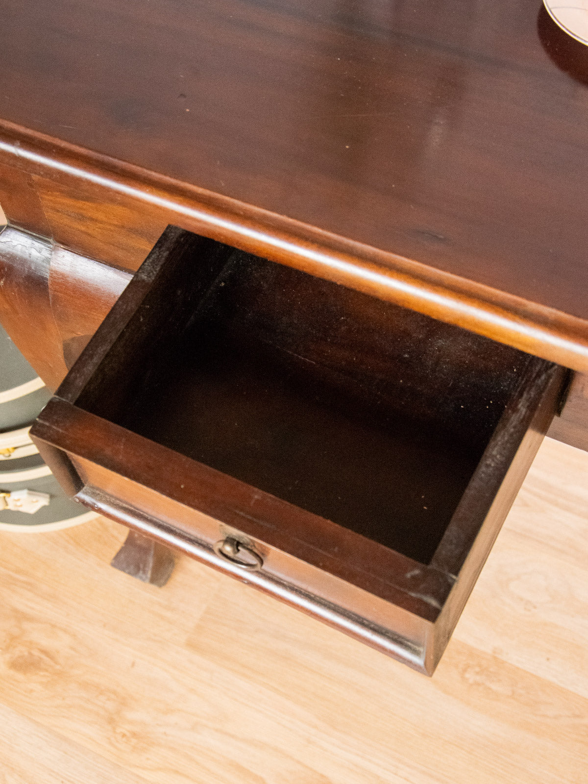 Apportez une touche chaleureuse et structurée à votre entrée ou salon avec cette console d'appoint en bois foncé, rehaussée de poignées en fer au charme sobre. Ses deux tiroirs offrent un rangement discret pour clés et petits objets, tandis que son plateau accueille lampe et éléments décoratifs grâce à des proportions compactes et harmonieuses. Son style mêle inspiration industrielle et patine accueillante. Traces du temps et rayures présentes.