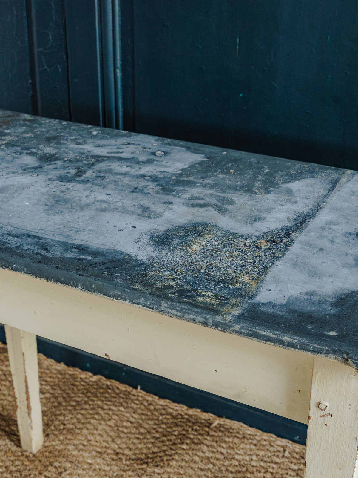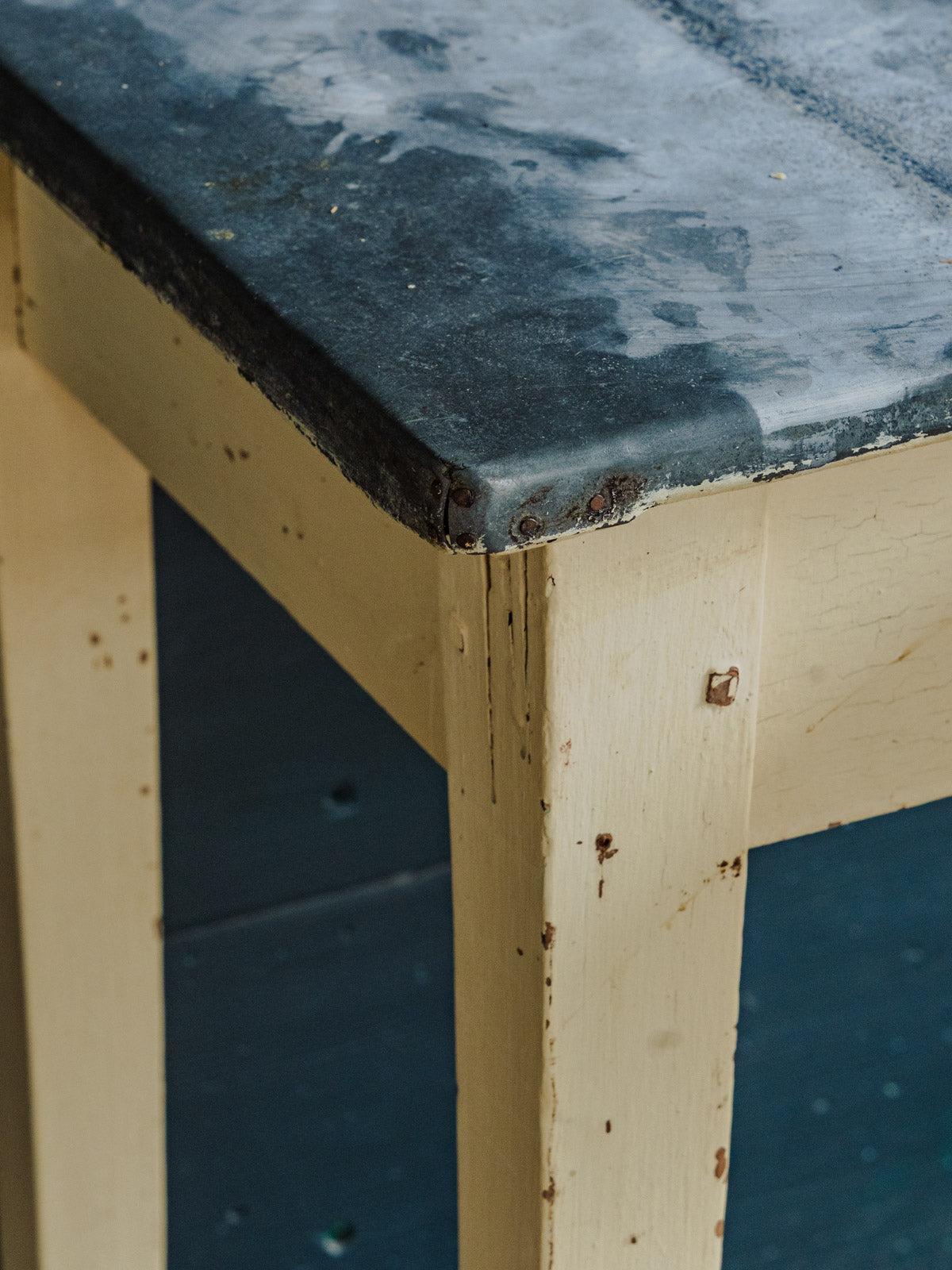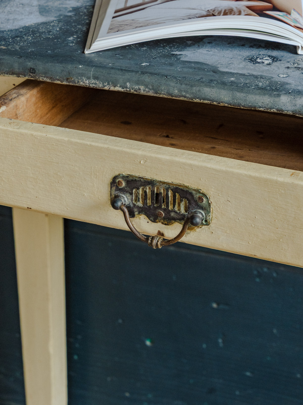 Ajoutez une touche d'atelier chic avec cette table d'appoint aux pieds en bois peint patinés en beige et au plateau en zinc noir, où se mêlent sobriété et caractère. Son format permet un usage polyvalent en entrée, salon ou chambre, offrant une surface stable et élégante. Un tiroir, équipé de sa poignée d'origine en métal, apporte un rangement pratique tout en soulignant son allure vintage. Quelques traces du temps présentes.