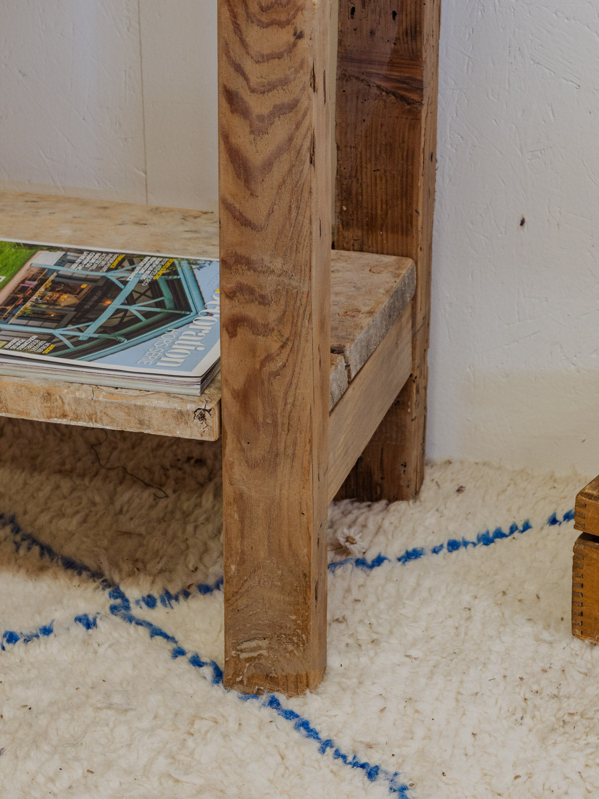 Invitez cette table d'appoint style établi en bois, à la silhouette élancée et au charme discret. Son plateau marqué d'un trou raconte une histoire d'atelier tandis que le sous-plateau offre un rangement discret pour livres ou objets du quotidien, et ses proportions étroites la rendent idéale pour une entrée, une niche ou comme console le long d'un mur. La patine naturelle du bois apporte chaleur et caractère. Quelques traces du temps présentes.