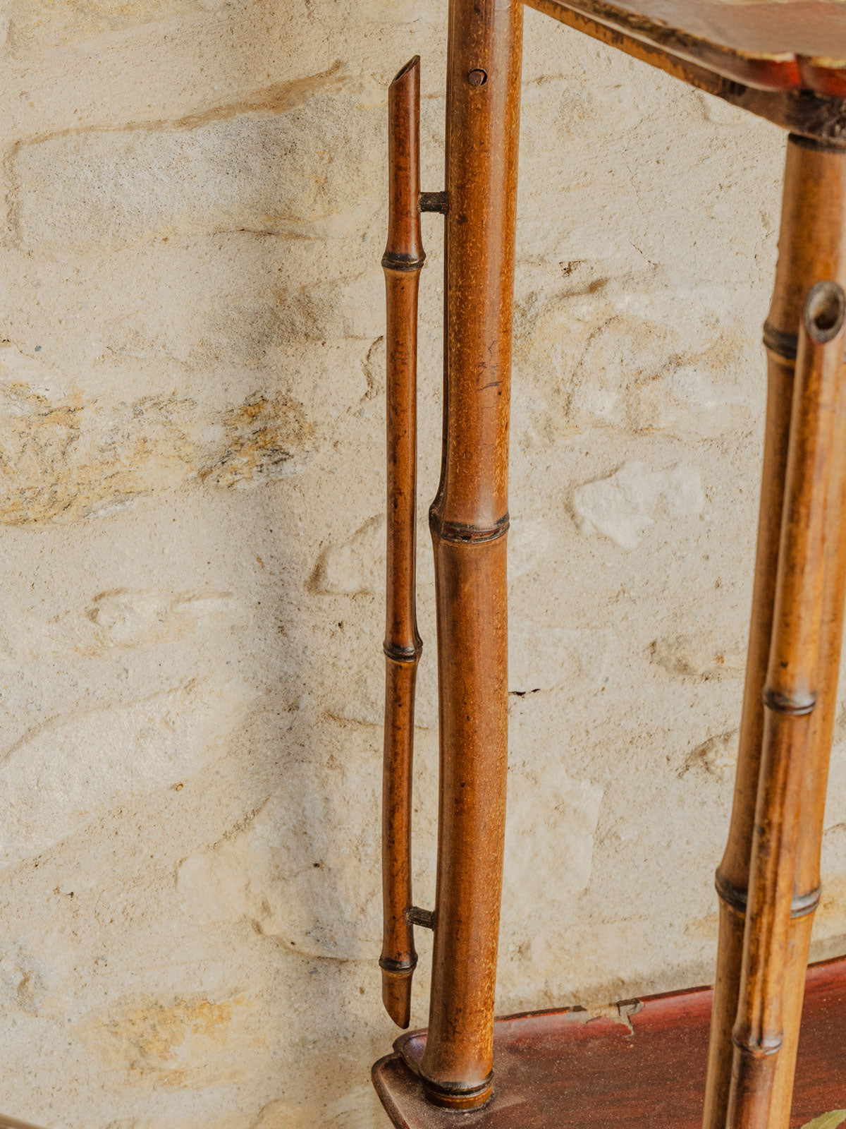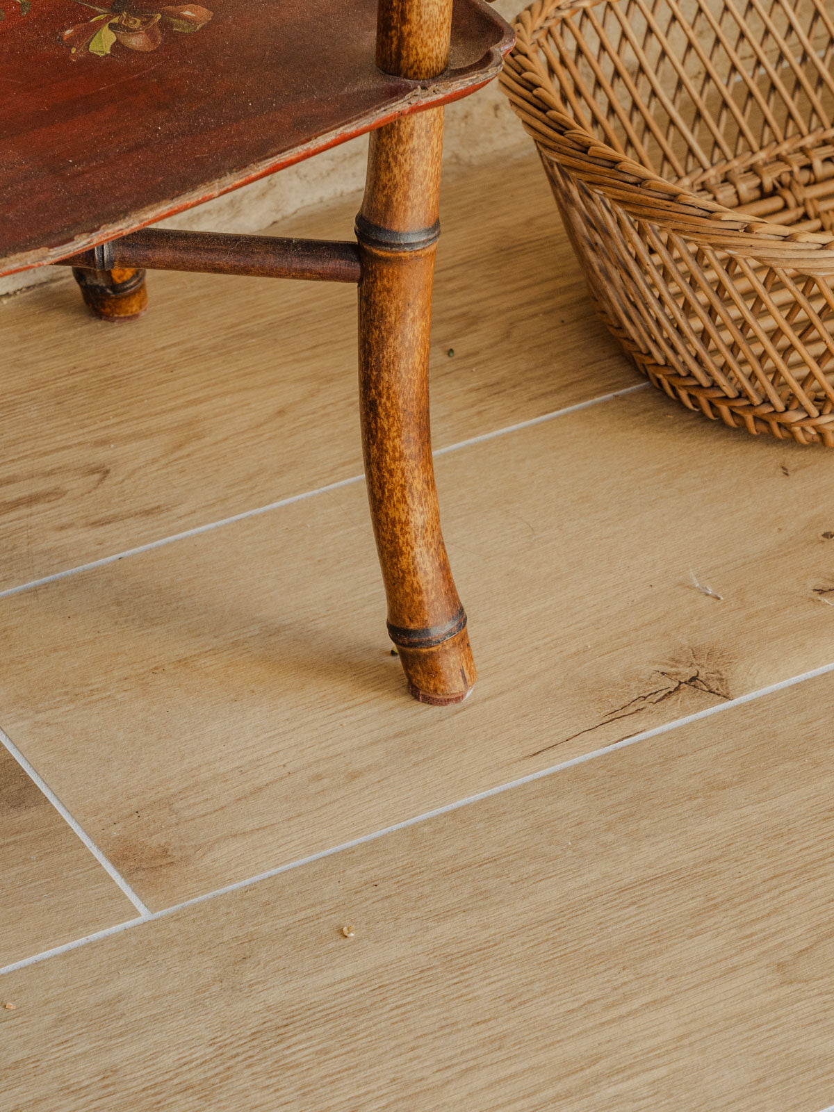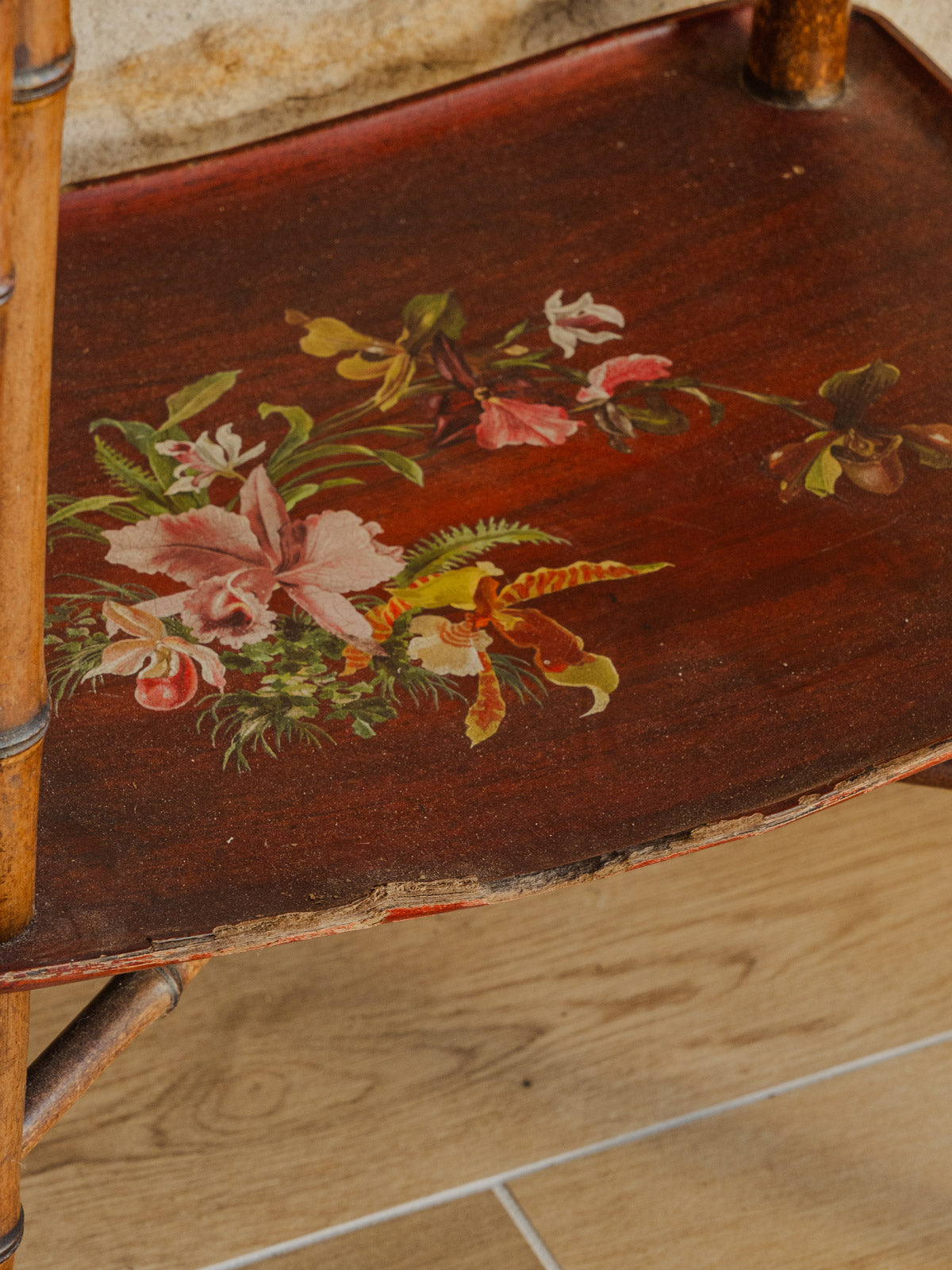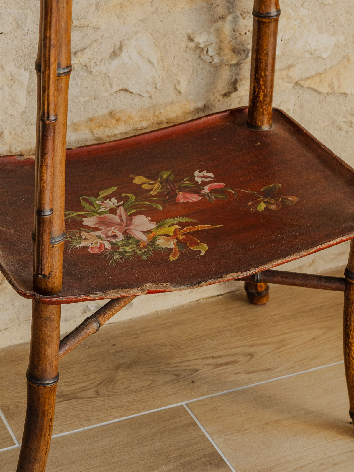 Sublimez votre intérieur avec cette sellette en bois et bambou, ornée de dessins floraux délicats sur ses plateaux. Sa silhouette et ses proportions offrent un support parfait pour une plante, une lampe ou vos objets d'appoint, à glisser dans une entrée, un coin salon ou près du lit. Le contraste des matériaux apporte une élégance sobre et une atmosphère chaleureuse et authentique. Quelques traces du temps présentes.