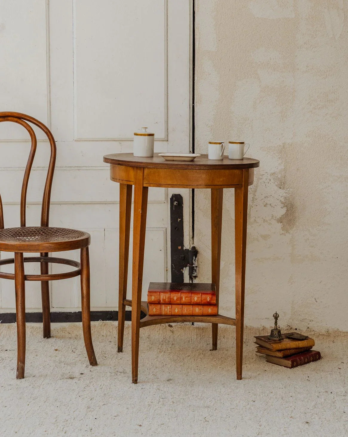 Ajoutez une touche chaleureuse avec cette table d'appoint en bois au plateau rond et au liseré orné, qui capte le regard sans alourdir l'espace. Pensée pour les coins lecture ou comme guéridon près d'un canapé, son sous-plateau offre un rangement discret pour revues ou objets du quotidien, et ses proportions s'adaptent aux intérieurs restraints. Le motif du plateau apporte une note raffinée et intemporelle, idéale pour une ambiance douce et sobre. Quelques traces du temps présentes.