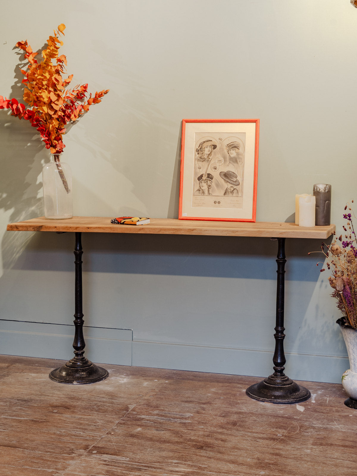 Adoptez cette console ou table d'appoint au plateau en noyer, inspirée du style bistrot, reposant sur des pieds en métal noir pour une allure sobre. Son plateau généreux met en valeur objets décoratifs, lampes ou services et s'intègre naturellement derrière un canapé ou dans une entrée, créant une atmosphère chaleureuse et accueillante. Le contraste du bois chaud et du métal apporte une touche industrielle élégante, parfaitement adaptée aux intérieurs contemporains comme aux espaces plus traditionnels. Quelques traces du temps qui participent à son charme.