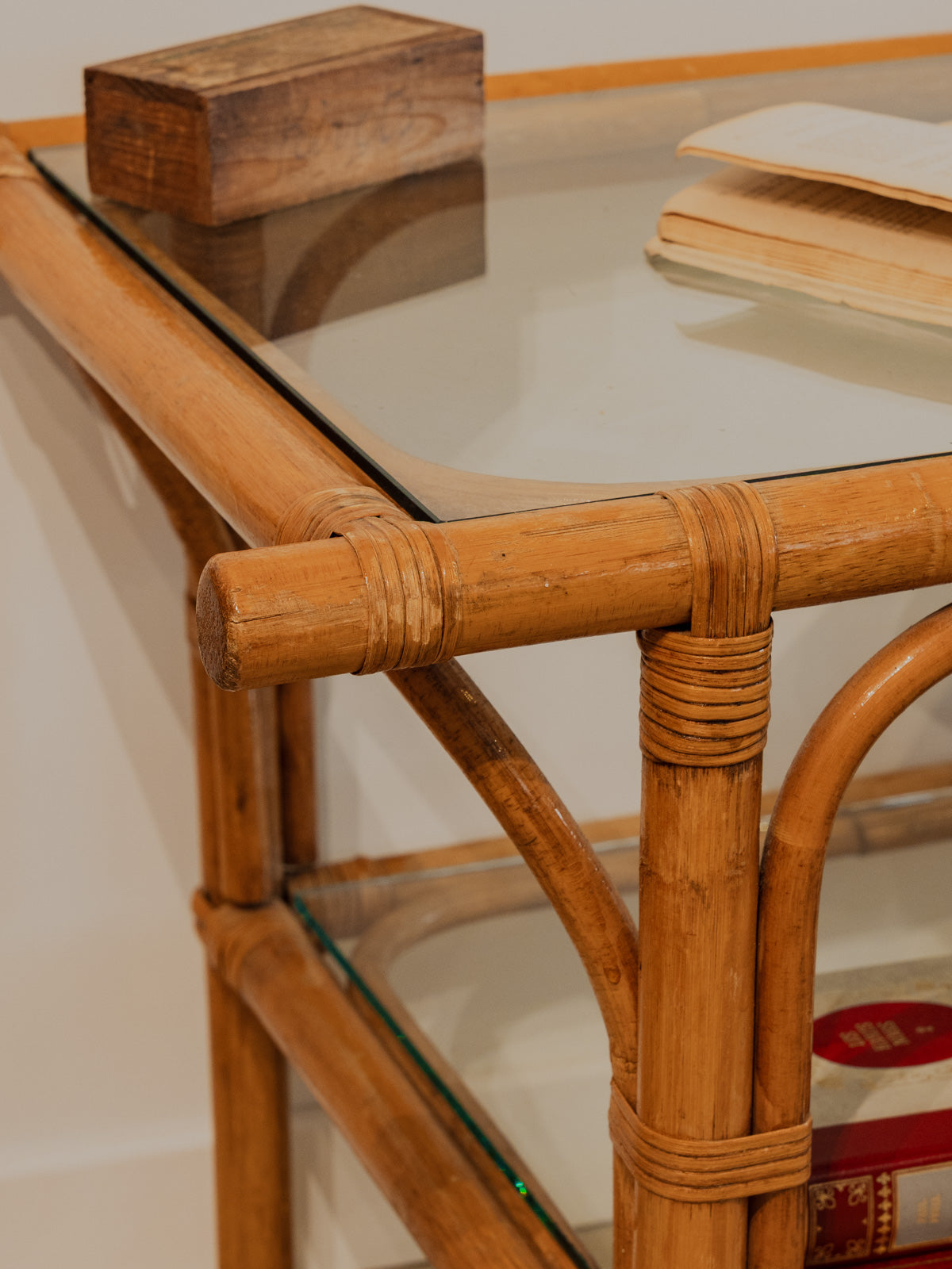 Ajoutez une touche naturelle à votre intérieur avec cette table d'appoint en rotin et plateaux de verre rectangulaires, dont l'assemblage fin révèle un équilibre élégant entre transparence et chaleur organique. Ses deux niveaux offrent une surface idéale pour accueillir plantes, livres ou un plateau d'apéritif, tandis que ses proportions se glissent facilement près d'un canapé ou d'une entrée. Quelques traces du temps présentes.