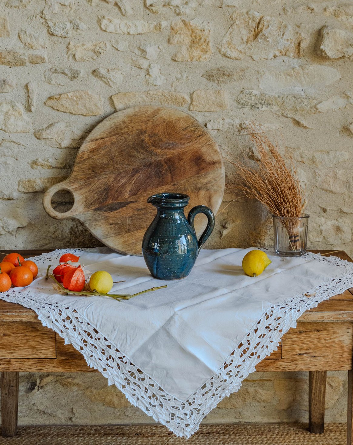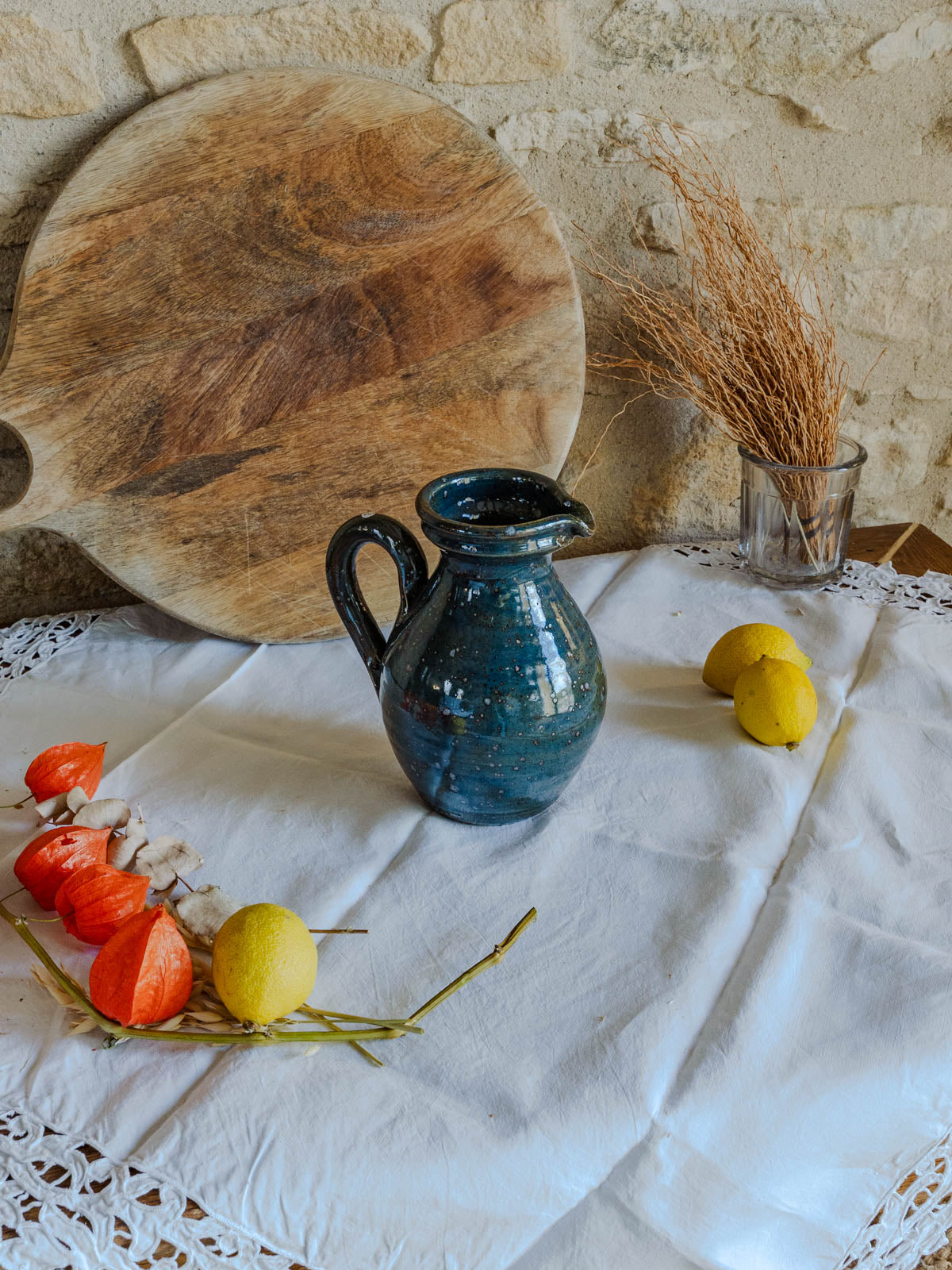 Adoptez cette carafe en grès vernissé bleu profond, signée Bandat, qui révèle un charme vintage et un savoir-faire artisanal. Sa contenance d'un litre et sa silhouette harmonieuse la rendent idéale pour servir eau, jus ou infusions à table, tout en apportant une présence équilibrée sur un buffet ou une étagère. La glaçure brillante met en valeur les variations de bleu et la matière poterie confère une texture chaleureuse, parfaite pour instiller une ambiance conviviale et élégante.