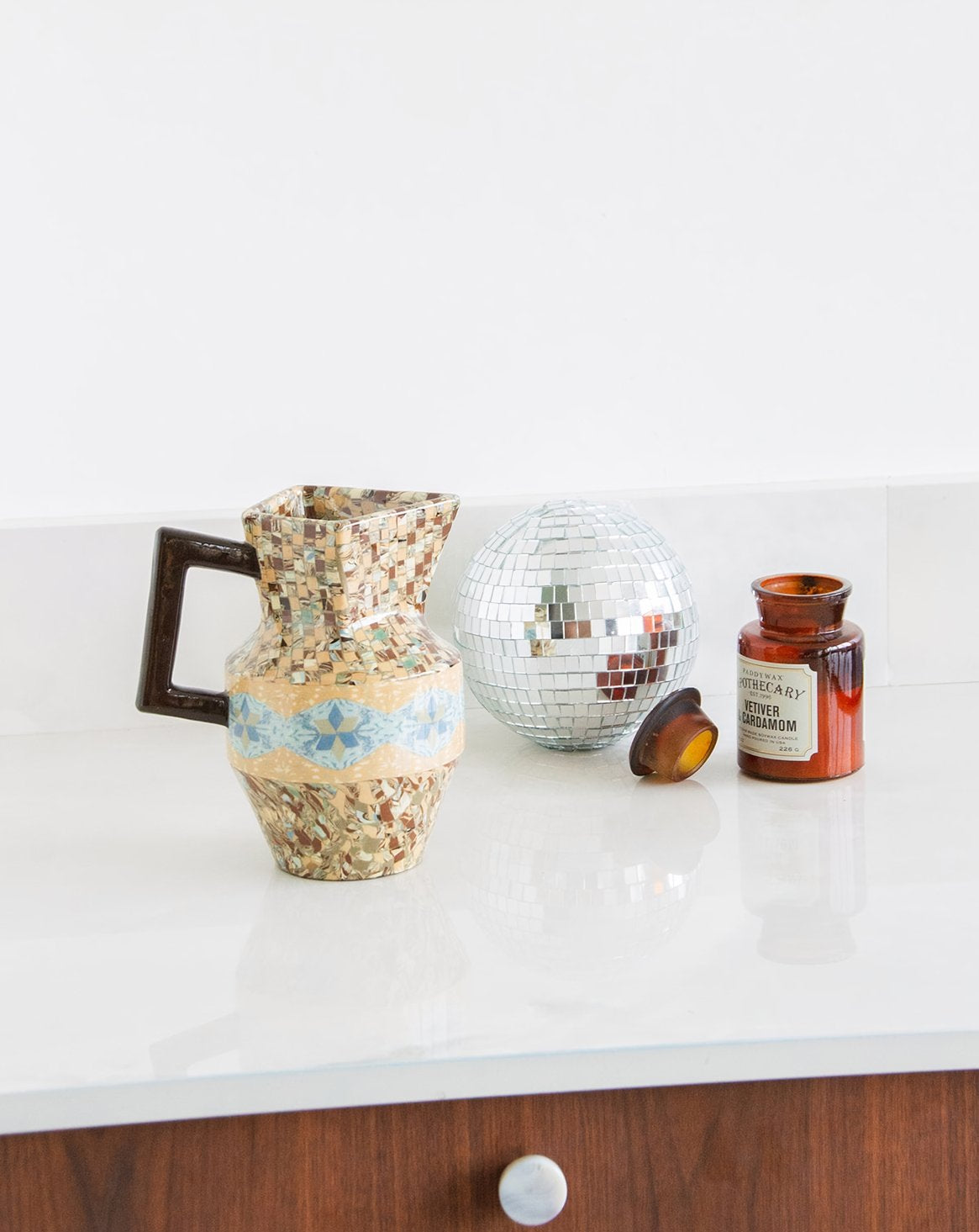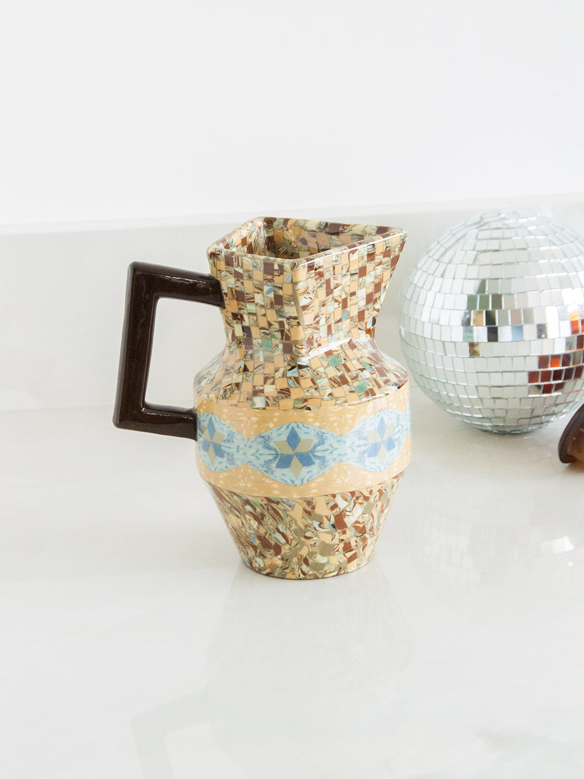 Découvrez ce pichet Art déco des années 30, signé Gerbino, réalisé en mosaïque de terres colorées aux tons bruns et bleus. Sa technique artisanale — assemblage de tesselles à plat, moulage, double cuisson et glaçure transparente — lui offre une surface riche et une profondeur de teinte subtile. Son format sculptural et ses proportions équilibrées en font un objet à la fois décoratif et fonctionnel, idéal sur une console ou en centre de table pour une ambiance chaleureuse et authentique. Héritage de Vallauris, savoir-faire transmis de génération en génération.