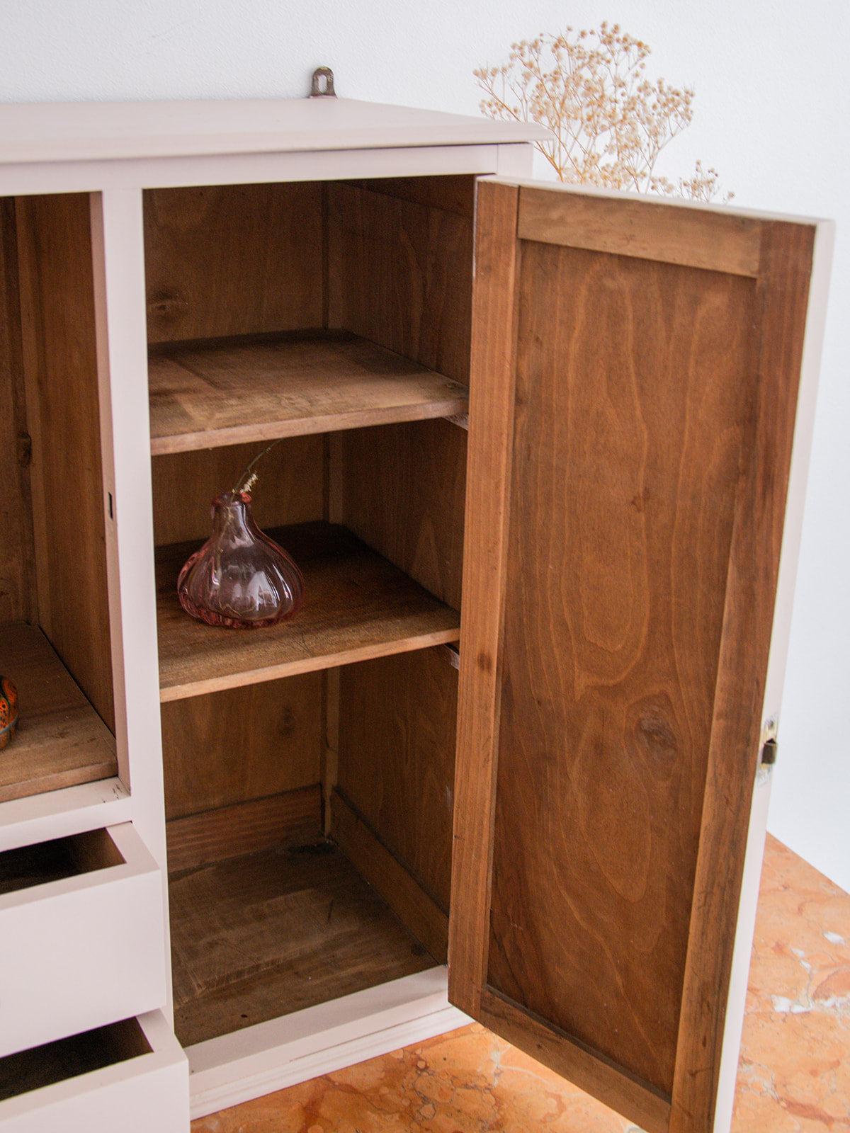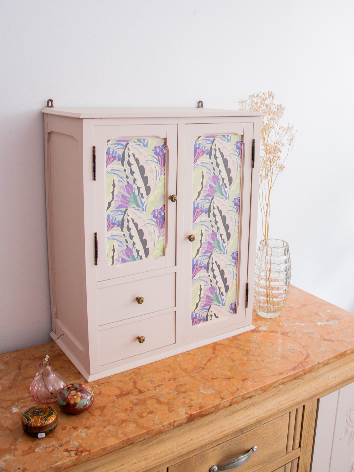 Apportez une touche de raffinement à votre salle de bains avec cette armoire de toilettes en teinte rose Setting, inspirée du nuancier Farrow & Ball. Son design Art déco est agrémenté de deux tiroirs pratiques et de deux placards avec étagères, offrant une belle capacité de rangement. Les poignées en métal et les crochets à l'arrière pour un accrochage facile complètent ce meuble élégant, parfait pour ajouter à la fois style et fonctionnalité à votre espace.