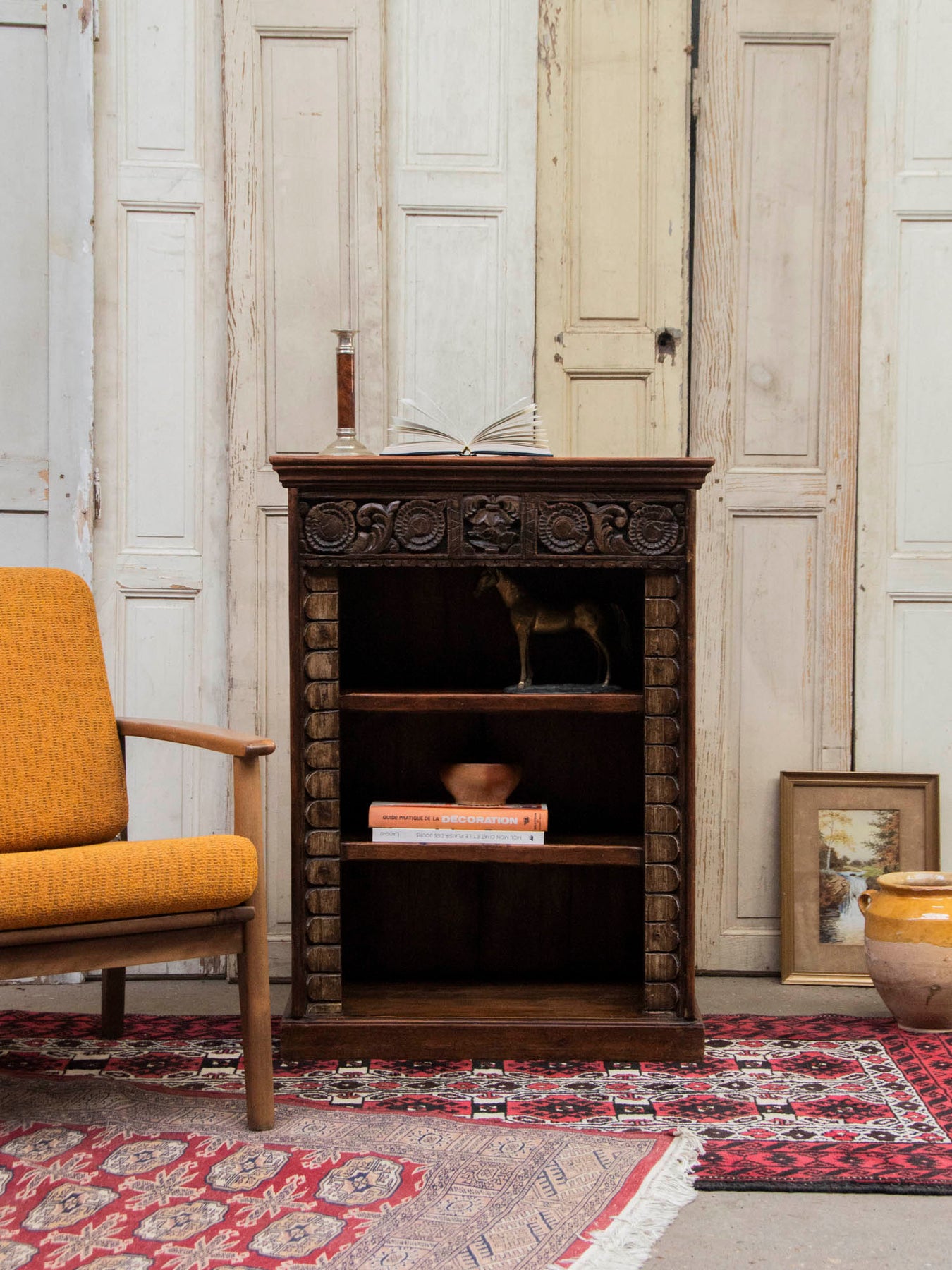 Adoptez cette étagère au caractère brutaliste, façonnée en bois creusé où des dessins gravés animent la matière. Son plateau supérieur légèrement plus généreux et ses trois étagères offrent un rangement vertical pensé pour exposer livres, objets et plantes avec organisation et élégance. Les proportions compactes la rendent adaptée aux intérieurs contemporains cherchant une note sculpturale et graphique, tandis que la chaleur du bois apporte une ambiance atelier raffinée et accueillante.