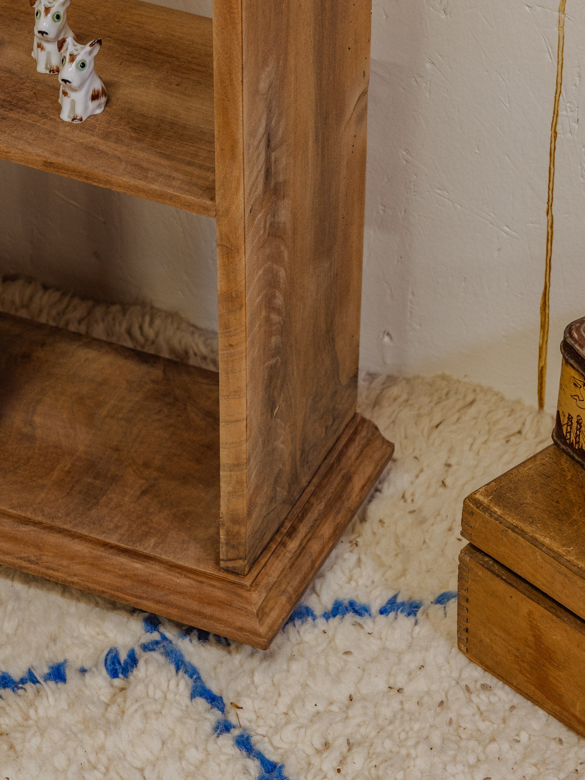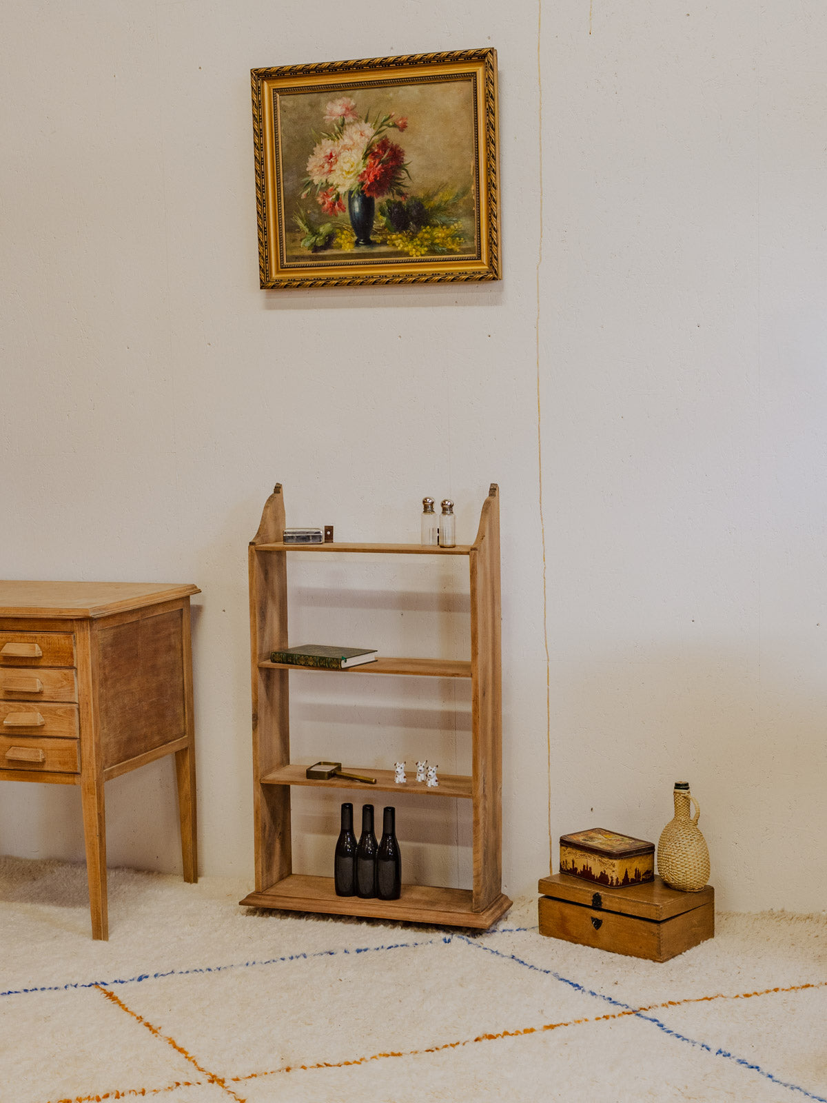 Adoptez cette étagère murale en bois aux lignes simples et aériennes, qui apporte une touche naturelle et lumineuse à vos murs. Ses trois étagères offrent un rangement vertical idéal pour livres, plantes et objets décoratifs, et ses proportions étroites s'intègrent facilement dans un coin lecture ou une entrée. Le bois révèle une belle chaleur et une patine discrète qui créent une ambiance sereine. Instable à poser par terre, elle penche. Quelques traces du temps.