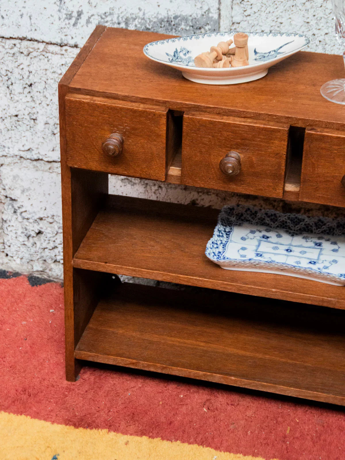 Découvrez cette étagère en bois foncé, pensée pour se poser au sol ou se suspendre au mur et offrir une présence chaleureuse et structurée. Ses trois petits tiroirs supérieurs apportent un rangement discret pour petits objets, tandis que l'étagère basse accueille livres, plantes ou accessoires; son format compact s'intègre aisément à une entrée, une salle de bains ou un coin bureau. Le veinage du bois met en valeur une allure sobre et élégante, idéale pour une décoration accueillante.