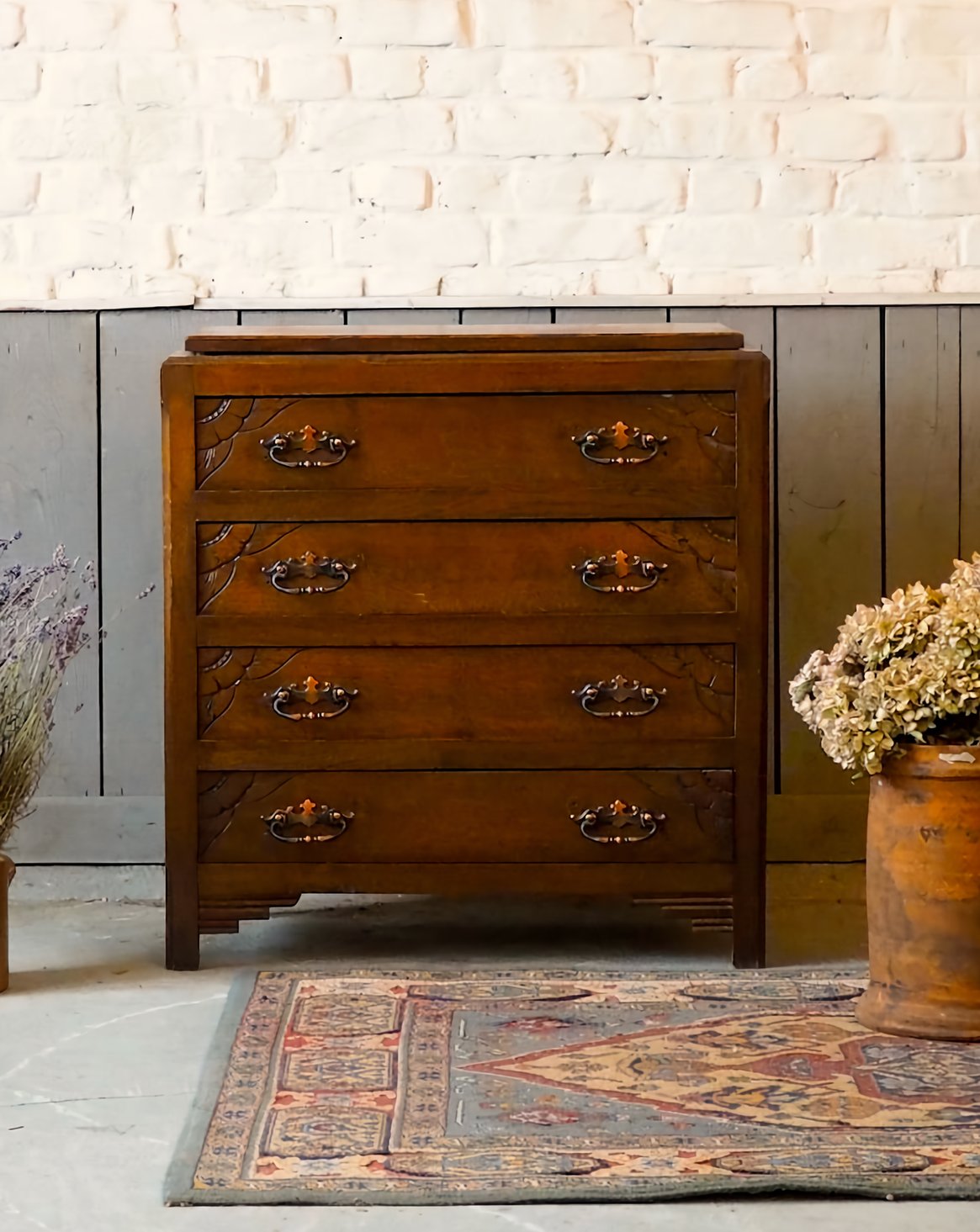 Adoptez cette commode rustique du XXème siècle en bois, qui mêle simplicité et caractère grâce à sa patine chaleureuse. Ses proportions généreuses et ses plusieurs tiroirs mettent en valeur un motif sérrusé le long des côtés, offrant un rangement fonctionnel pour le linge, les accessoires ou les objets du quotidien. Installée dans une chambre ou une entrée, elle instaure une atmosphère authentique et feutrée, invitant à la mise en scène d’un intérieur à la fois pratique et élégant.