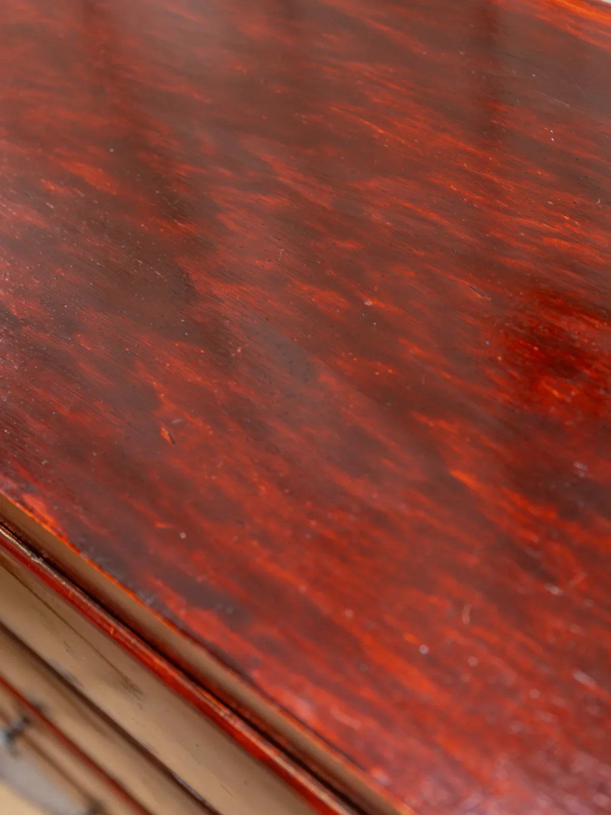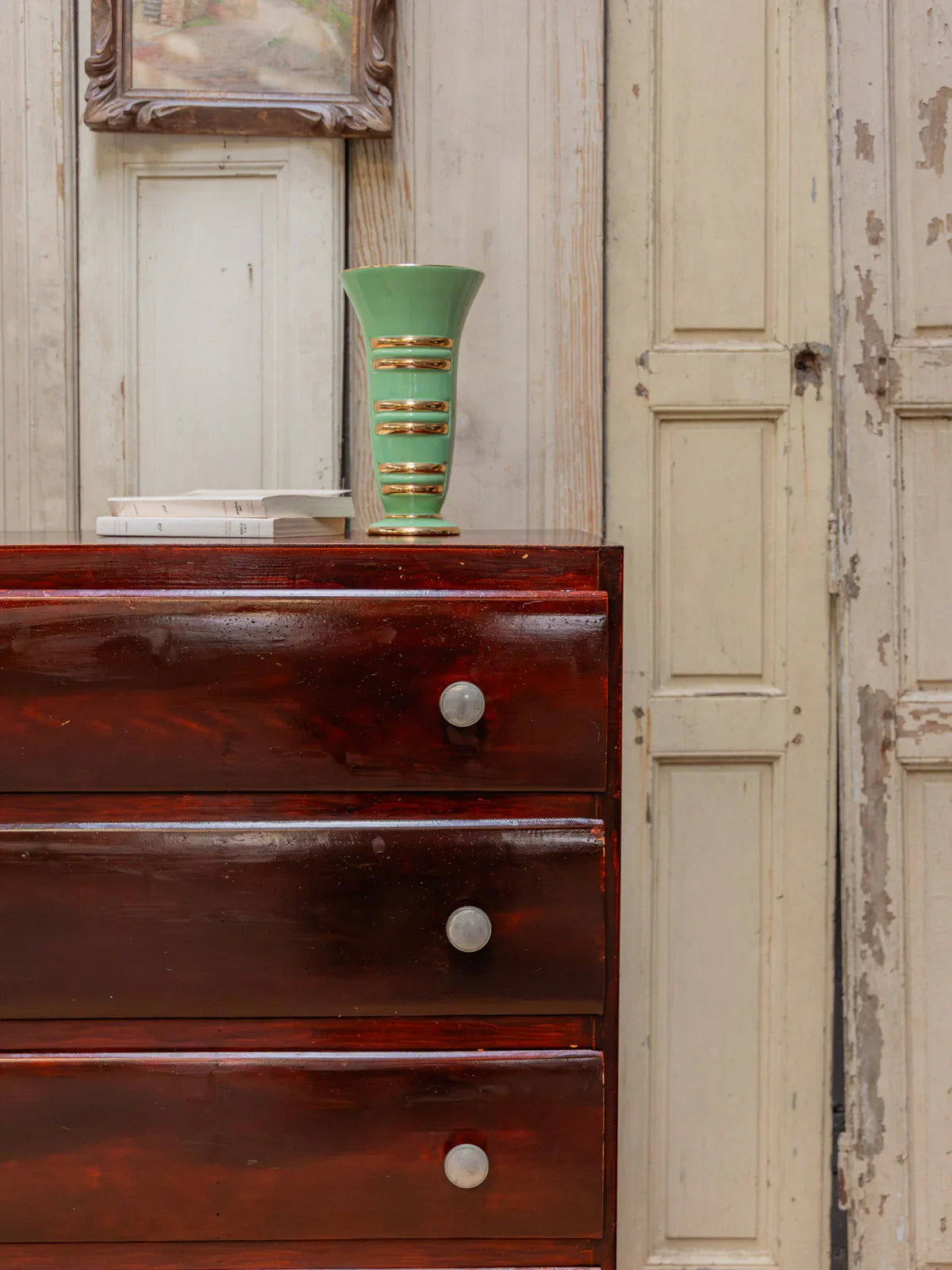 Adoptez cette commode des années 50 à la peinture d'origine, habillée d'un acajou chaleureux qui souligne ses lignes rétro et élégantes. Son gabarit offre un beau volume de rangement discret, avec ses 4 tiroirs, idéale pour une chambre ou une entrée, et les boutons en aluminium apportent une touche graphique et contemporaine. Sa patine naturelle révèle une histoire douce et s'intègre dans une ambiance sobre et raffinée. Légères traces du temps présentes.