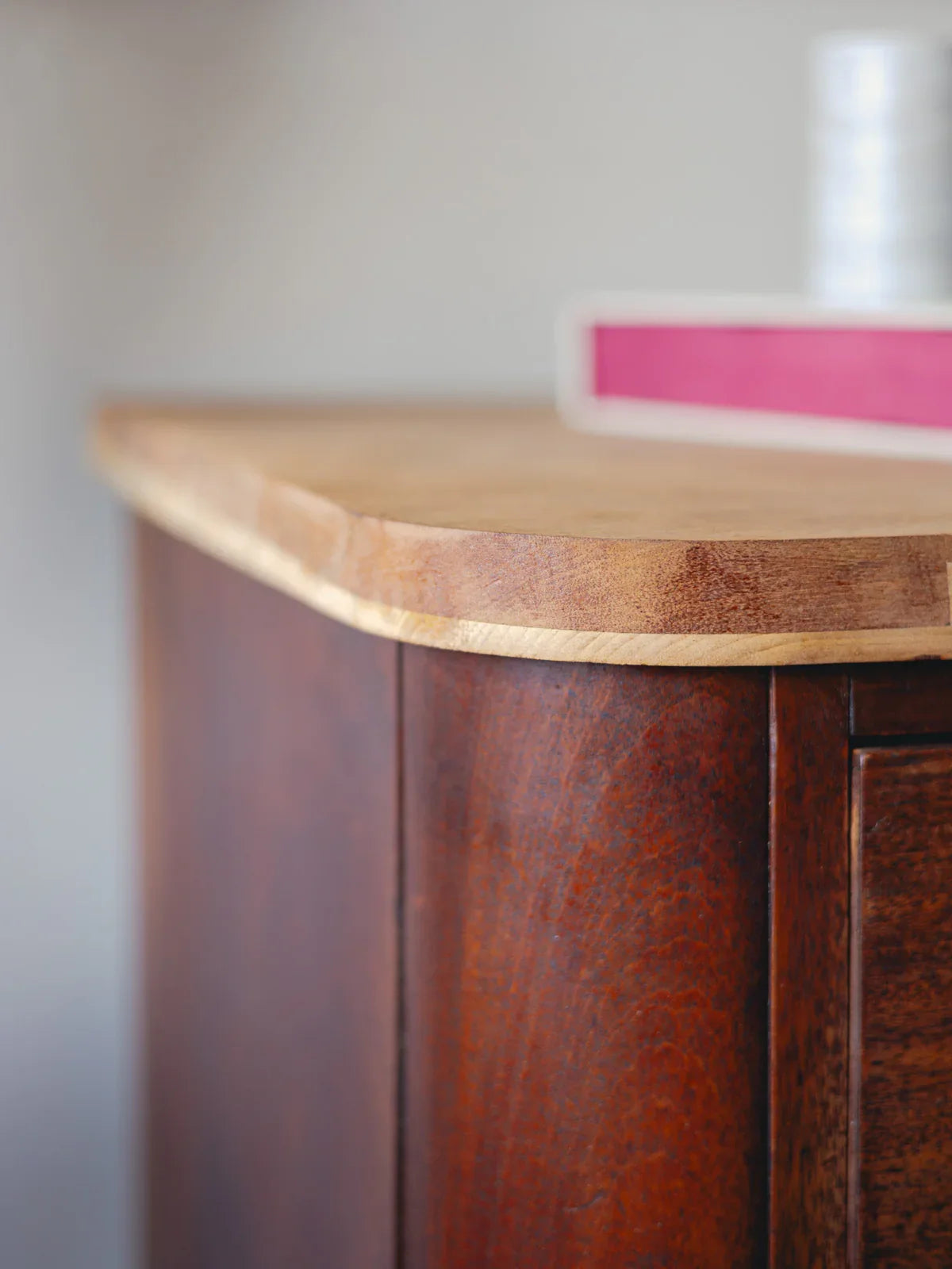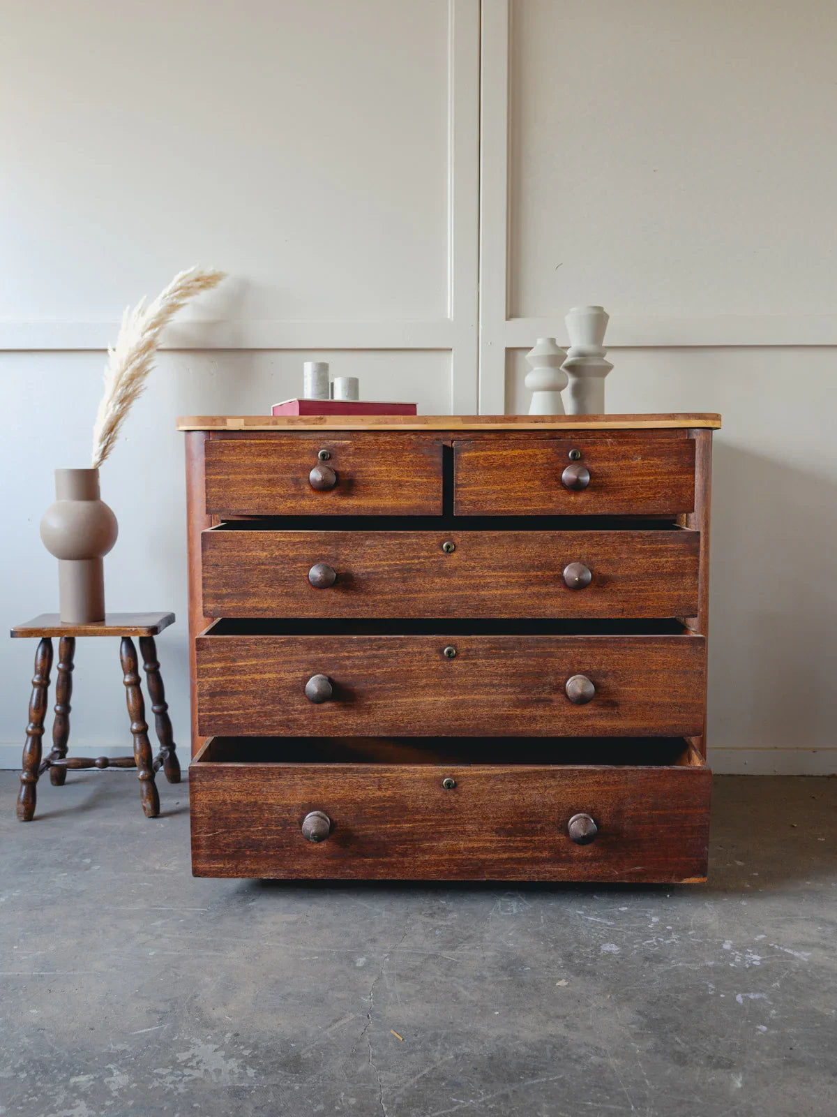 Découvrez cette commode en bois foncé au plateau récemment remplacé par une planche de bois massif clair, créant un contraste de teintes tout en renforçant sa solidité. Ses trois grands tiroirs à doubles poignées et ses deux petits tiroirs à poignée simple offrent un rangement organisé et généreux, parfait comme buffet dans une salle à manger ou comme meuble de chambre. Le mélange des essences et la silhouette sobre instaurent une atmosphère chaleureuse et authentique, adaptable aux intérieurs contemporains ou classiques.
