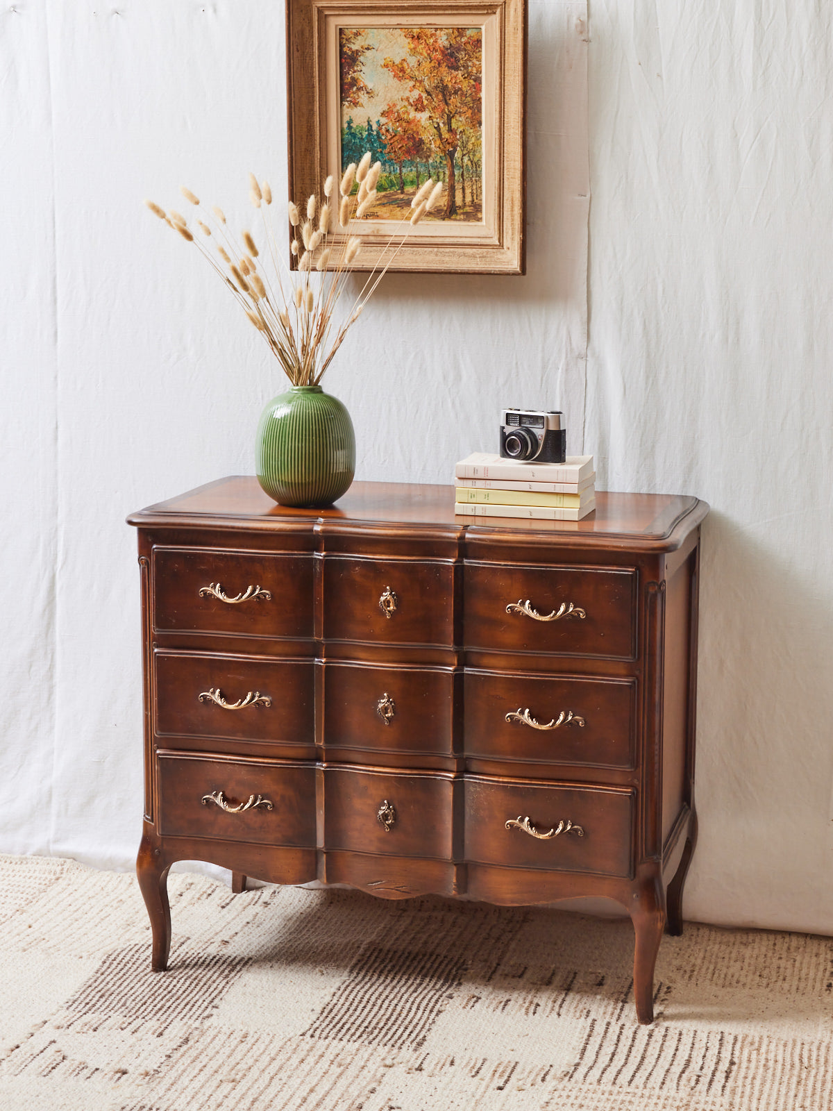 Sublimez votre intérieur avec cette commode en bois massif, où la chaleur des veines du bois se marie aux poignées et détails en laiton. Ses proportions équilibrées offrent un rangement pratique pour la chambre ou l'entrée, tandis que la finition naturelle souligne un style à la fois élégant et sobre. Elle apporte une atmosphère accueillante et raffinée, idéale pour compléter une décoration chaleureuse et contemporaine.