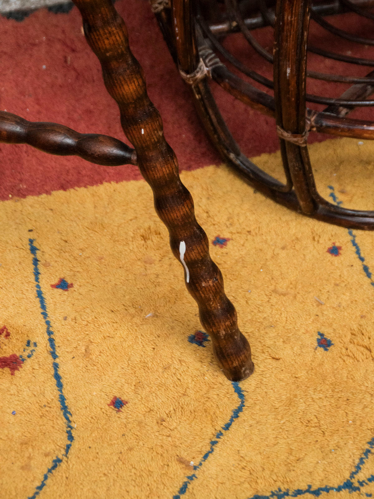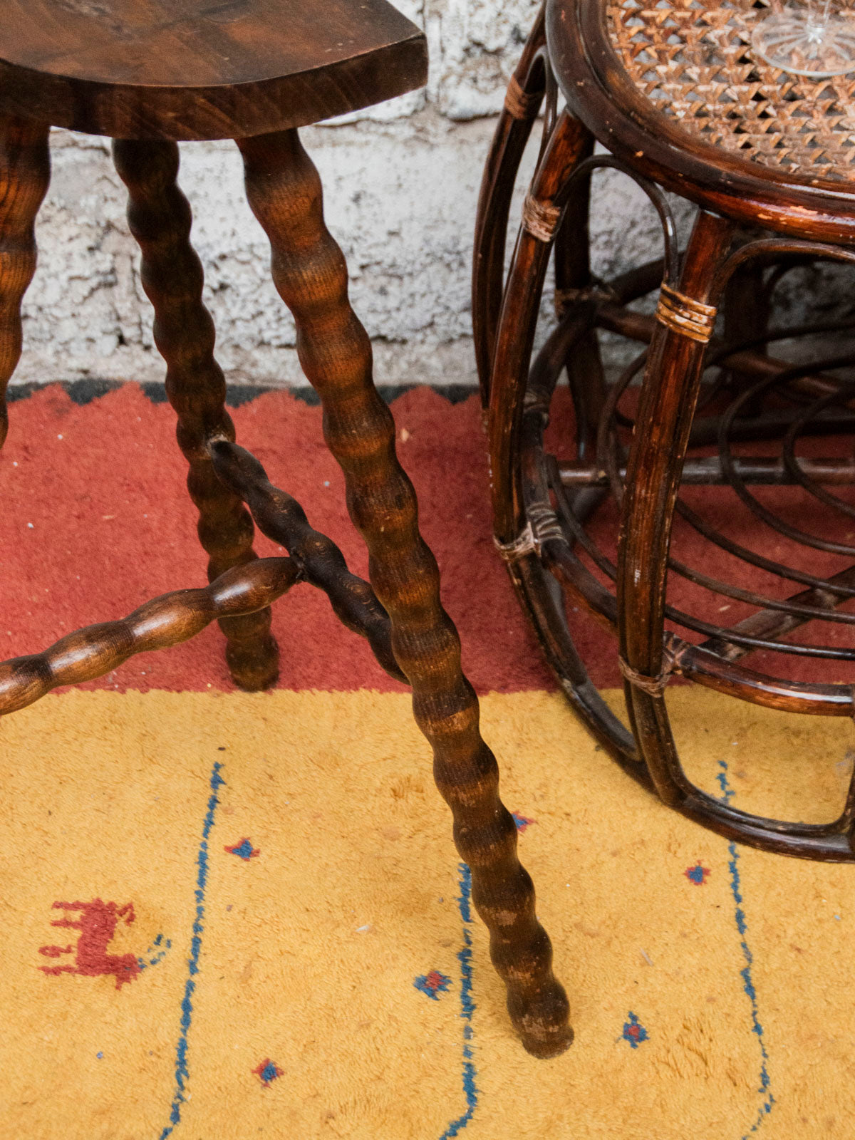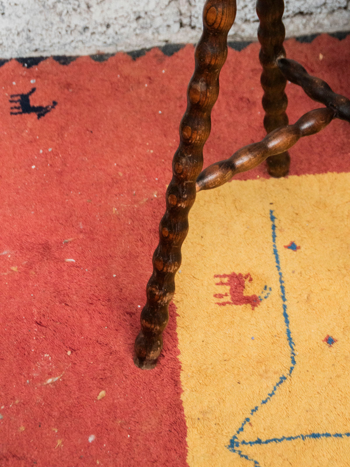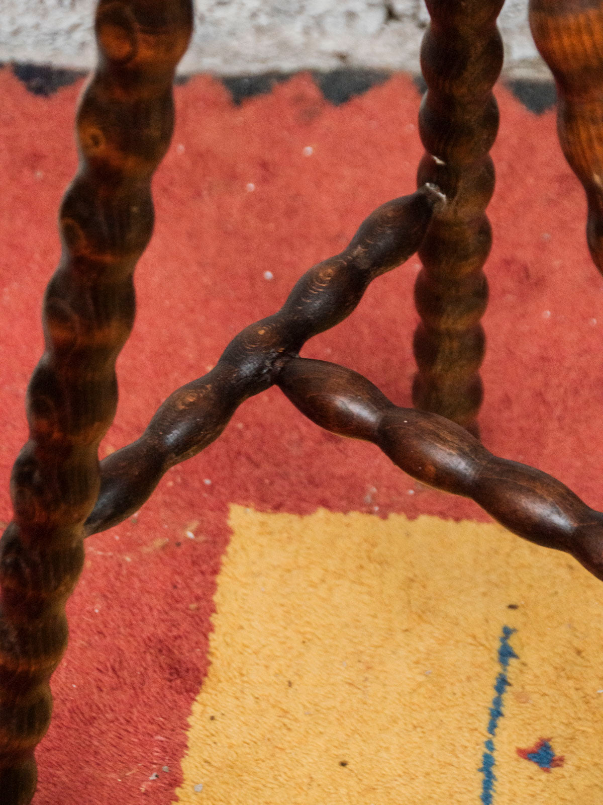 Adoptez ce tabouret en bois foncé à l'allure tripode, dont les pieds tournés témoignent d'un savoir-faire artisanal et d'une élégance discrète. L'assise demi-lune enveloppante et ses proportions compactes offrent une assise confortable, idéale pour un coin bar, une entrée ou comme siège d'appoint. Sa patine profonde et ses lignes classiques apportent une atmosphère chaleureuse et accueillante, capable de dialoguer aussi bien avec un intérieur contemporain qu'avec un décor plus rustique.