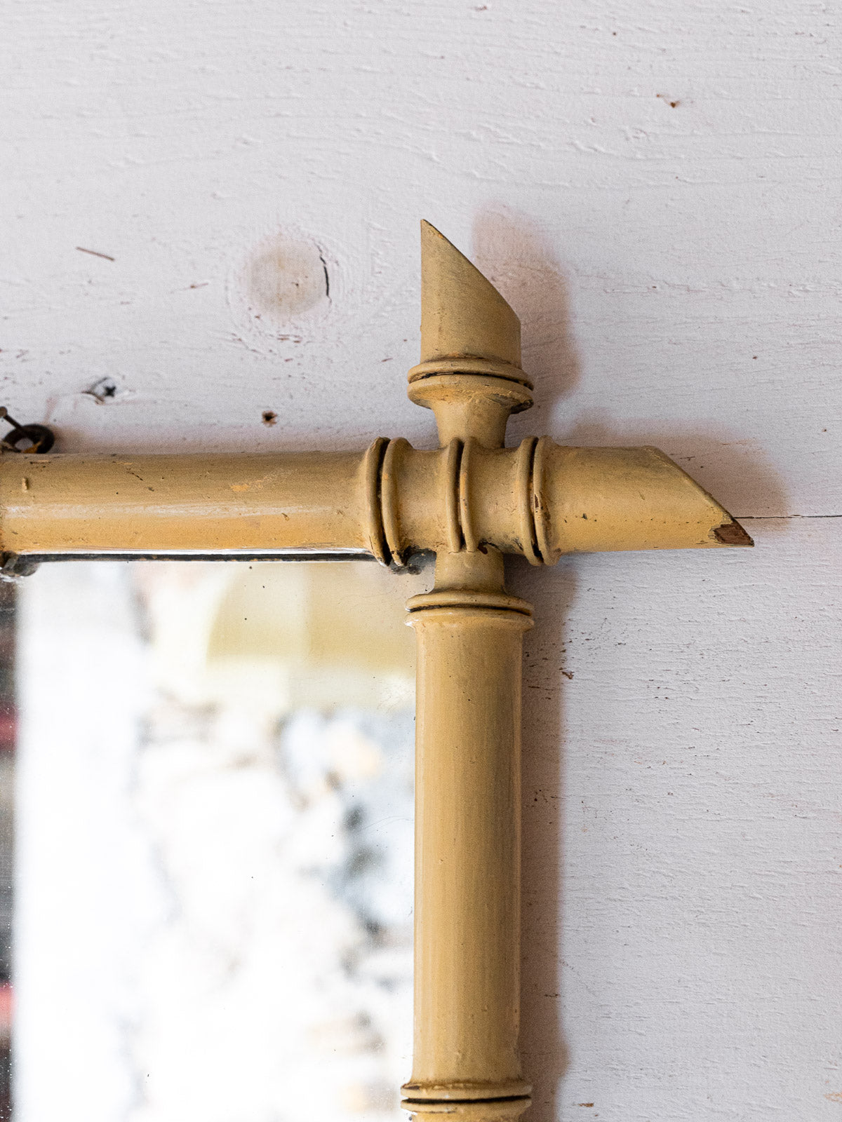 Découvrez ce miroir en bambou, repeint d'une couche de beige doux, dont la structure naturelle apporte une note chaleureuse et végétale à votre intérieur. Son format et ses proportions en font un accessoire idéal pour l'entrée, la salle de bain ou une chambre, offrant une présence élégante sans encombrer l'espace. Sa finition patinée lui confère un charme discret, qui installe une atmosphère sereine et invitante. Quelques traces du temps sont présentes.