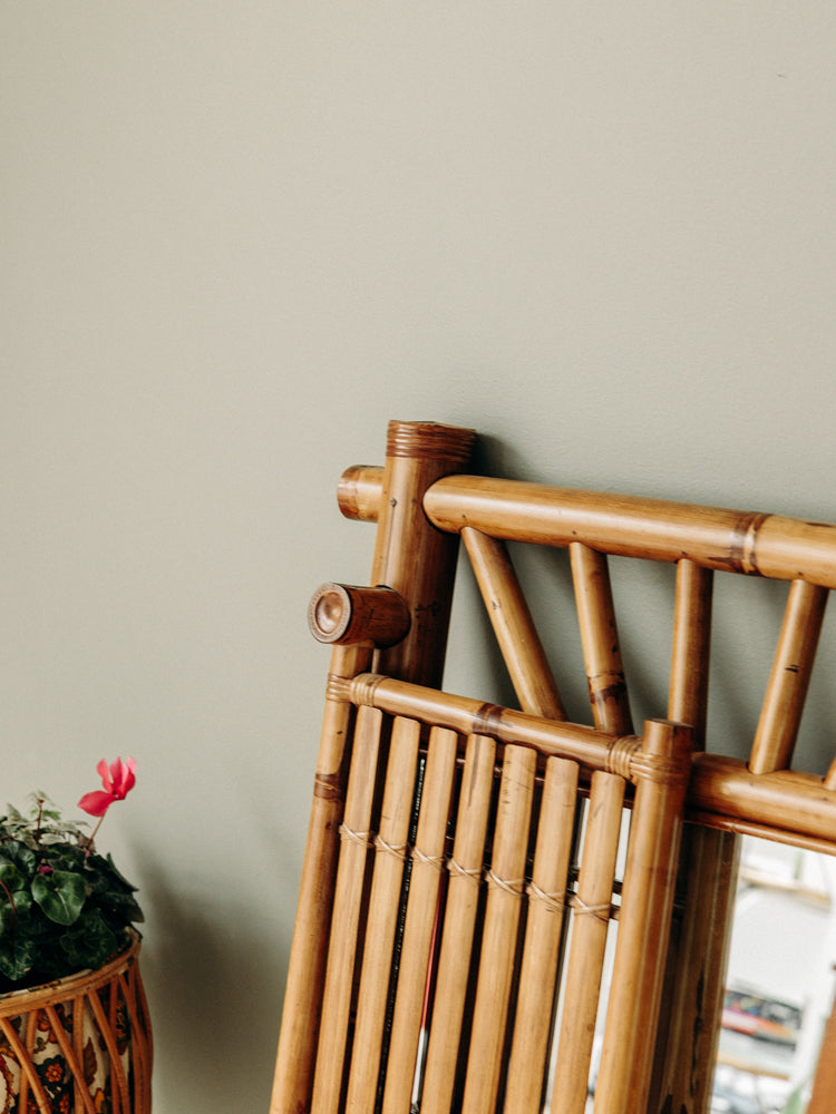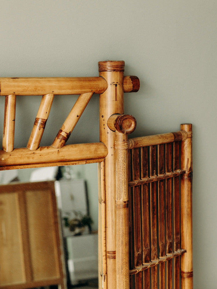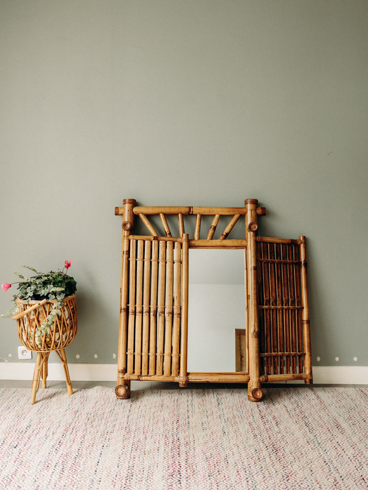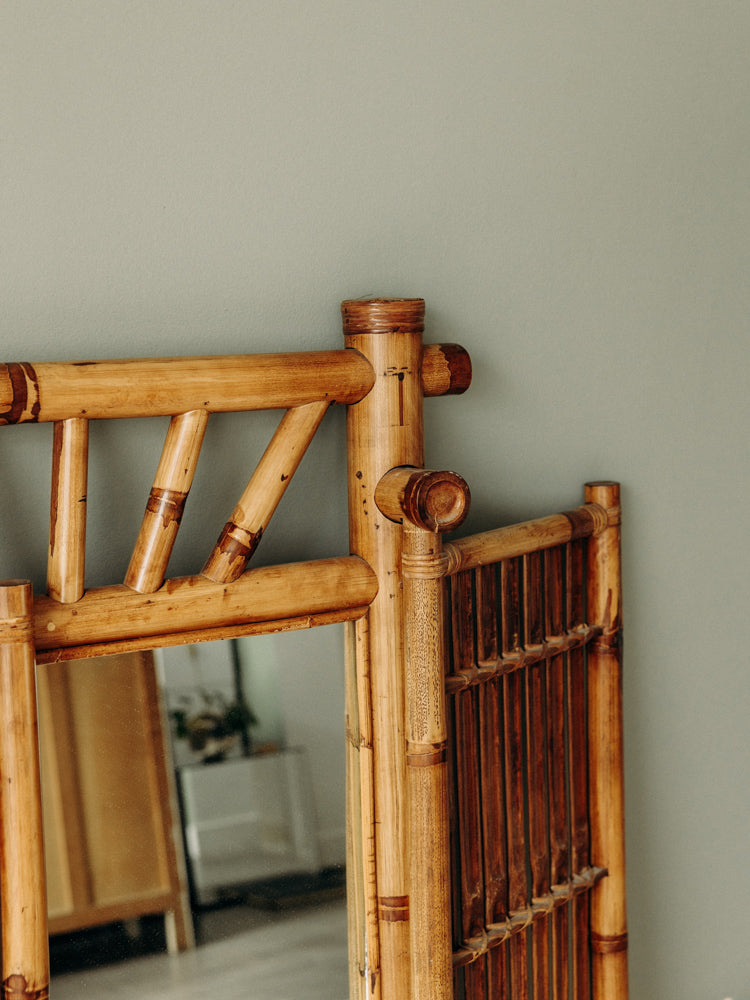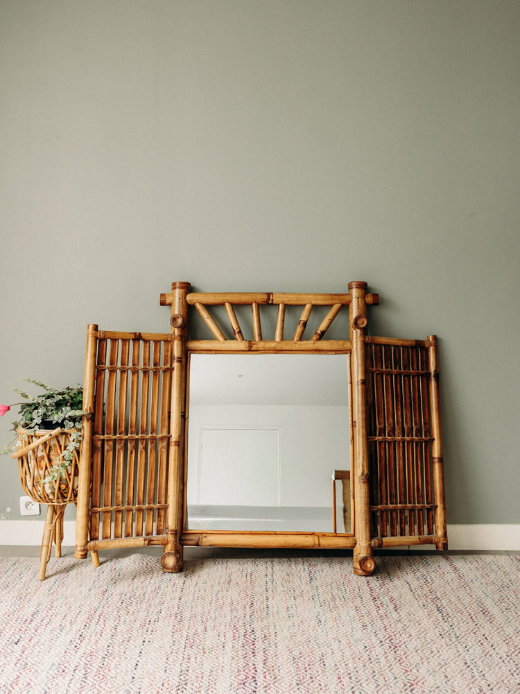 Découvrez ce miroir à double battant en bambou et verre, inspiré du style asiatique, dont le cadre en matériaux naturels révèle de belles teintes chaudes. Les deux portes offrent une large surface réfléchissante et des proportions élancées qui habillent une entrée, un couloir ou apportent de la profondeur à une chambre. L'association du bambou et du verre crée une ambiance zen et raffinée, idéale pour composer un intérieur sobre et accueillant.