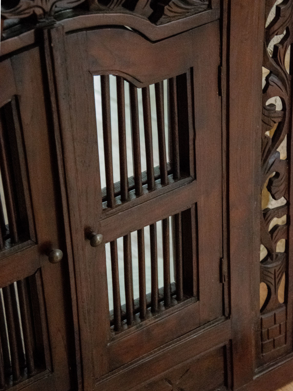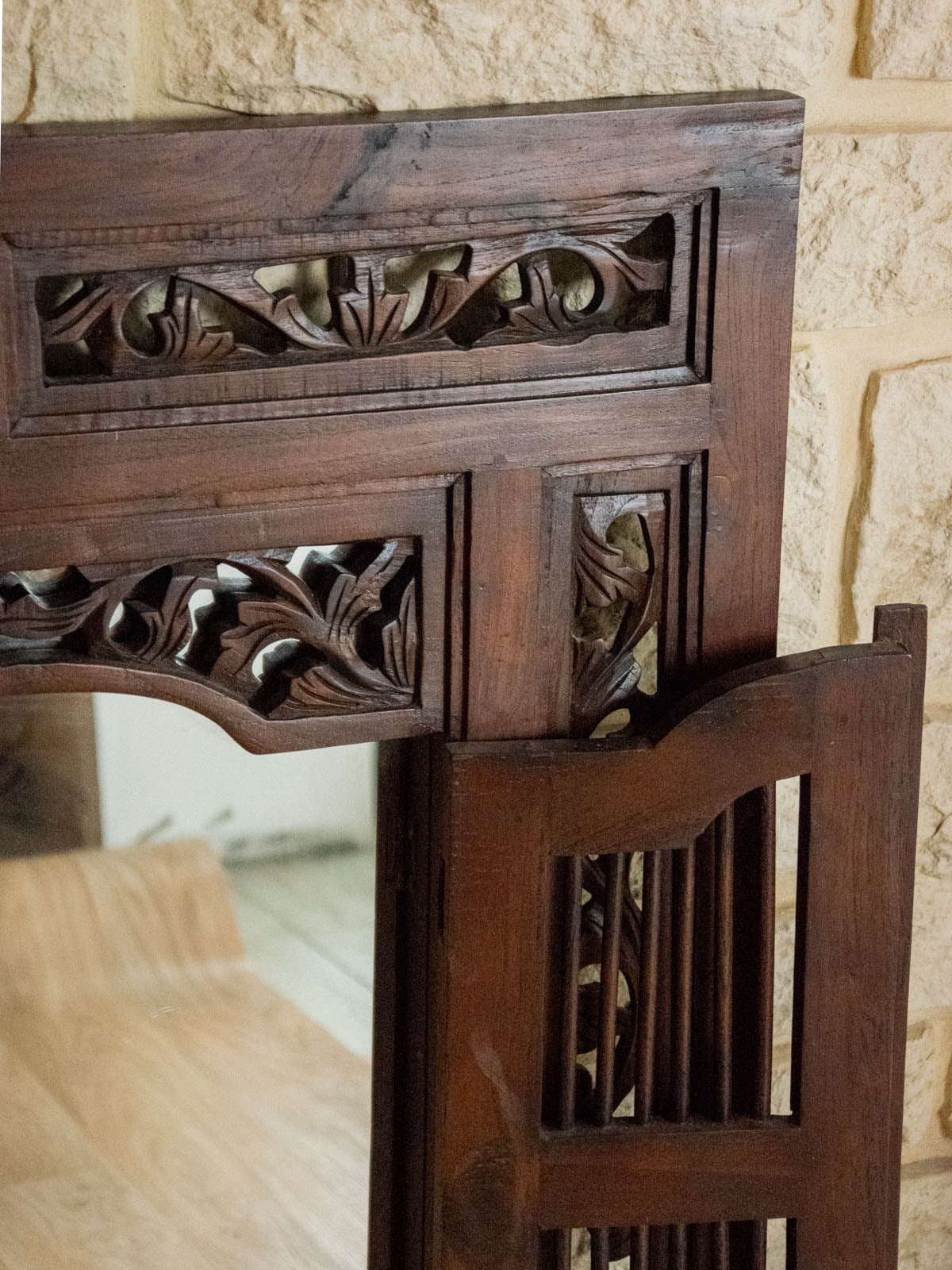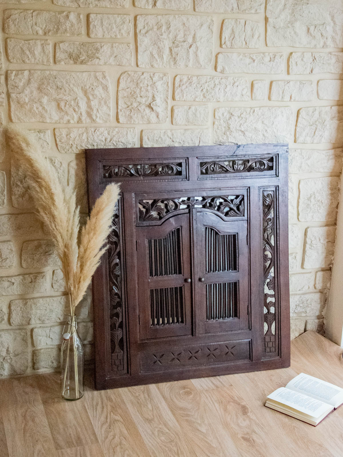 Sublimez votre intérieur avec ce grand miroir en bois foncé au style "effet fenêtre", qui apporte une présence architecturale et une profondeur lumineuse tout en évoquant une esthétique classique. Ses vantaux rabattables permettent de dissimuler complètement la surface réfléchissante, protégeant le verre et modulant la lumière selon l'ambiance désirée, tandis que les détails floraux sculptés soulignent le savoir‑faire artisanal. Idéal au‑dessus d'une console dans une entrée ou pour agrandir visuellement un salon ou une chambre.