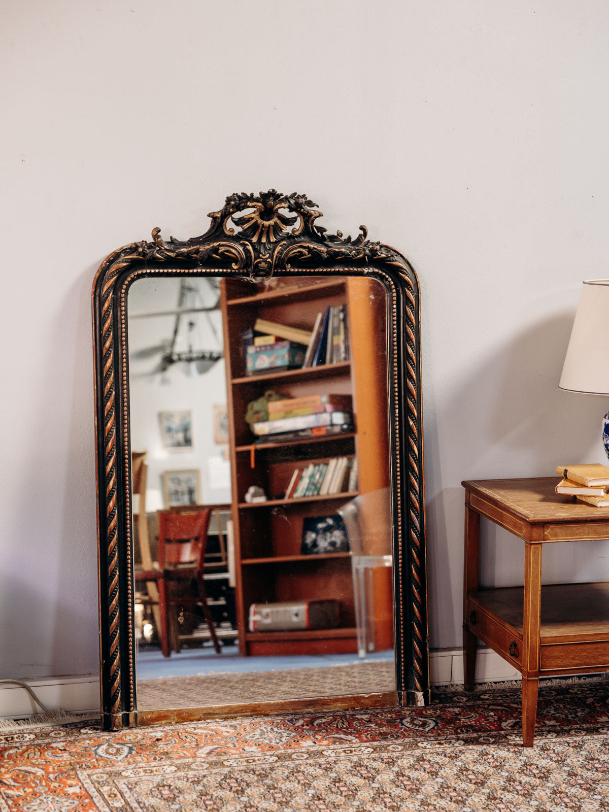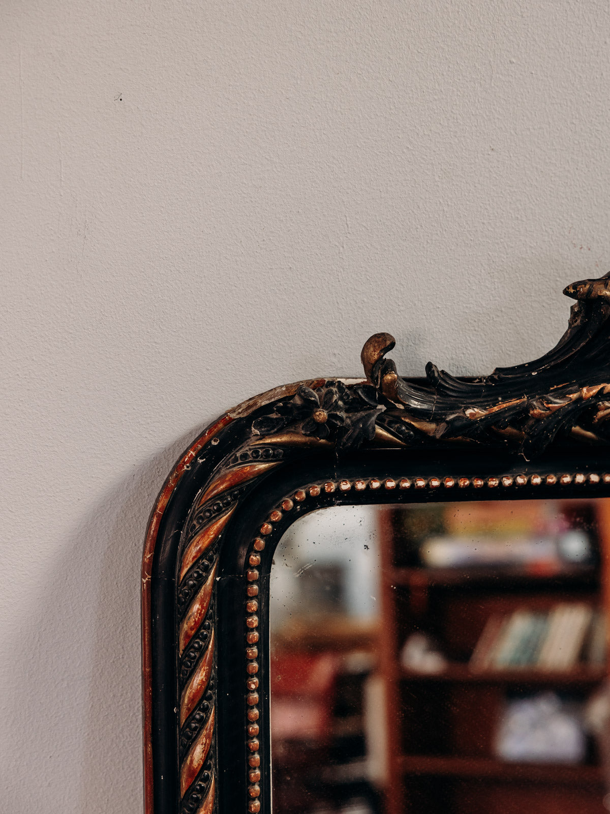 Sublimez votre intérieur avec ce grand miroir au cadre en bois richement sculpté, orné de coquilles, feuillages et volutes, rehaussé d'une finition sombre et de dorures typiques de la seconde moitié du XIXᵉ siècle. Sa forme rectangulaire surmontée d'un fronton mouvementé lui confère une belle présence verticale, idéale pour une entrée, un salon ou une chambre où le style bourgeois se mêle à des décors contemporains ou éclectiques. Objet à la fois décoratif et fonctionnel, il apporte chaleur et caractère à la pièce. Légères traces du temps présentes.