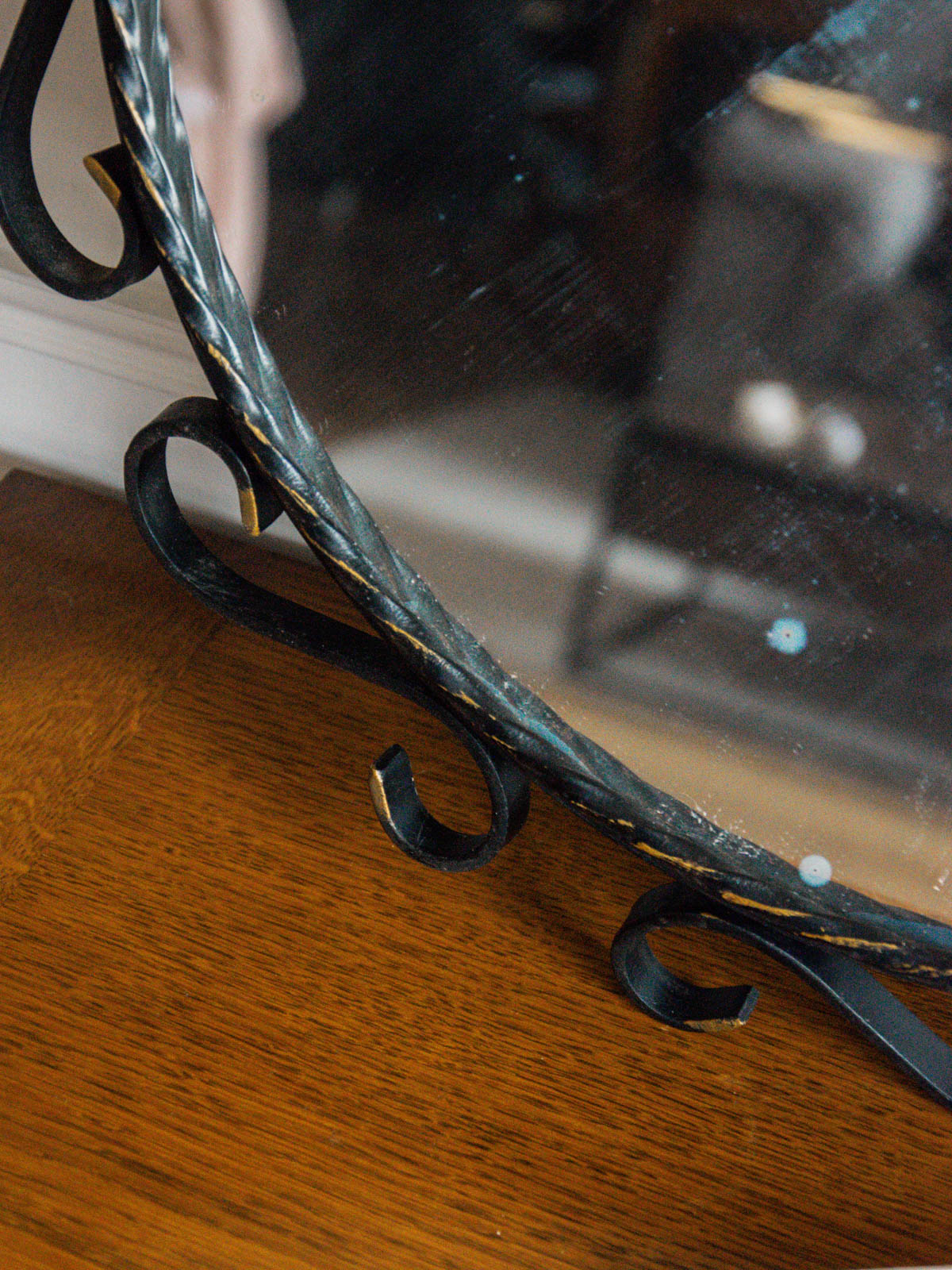 Apportez une touche d'élégance à votre intérieur avec ce miroir en fer forgé noir, sublimé par de délicates touches de doré. Son design raffiné et son cadre en fer forgé ajoutent du caractère à n’importe quelle pièce. Le miroir piqué reflète subtilement la lumière, créant une ambiance chaleureuse. Pratique, il est doté de deux accroches à l'arrière pour une installation facile. Un choix parfait pour allier esthétique et fonctionnalité dans votre décoration.