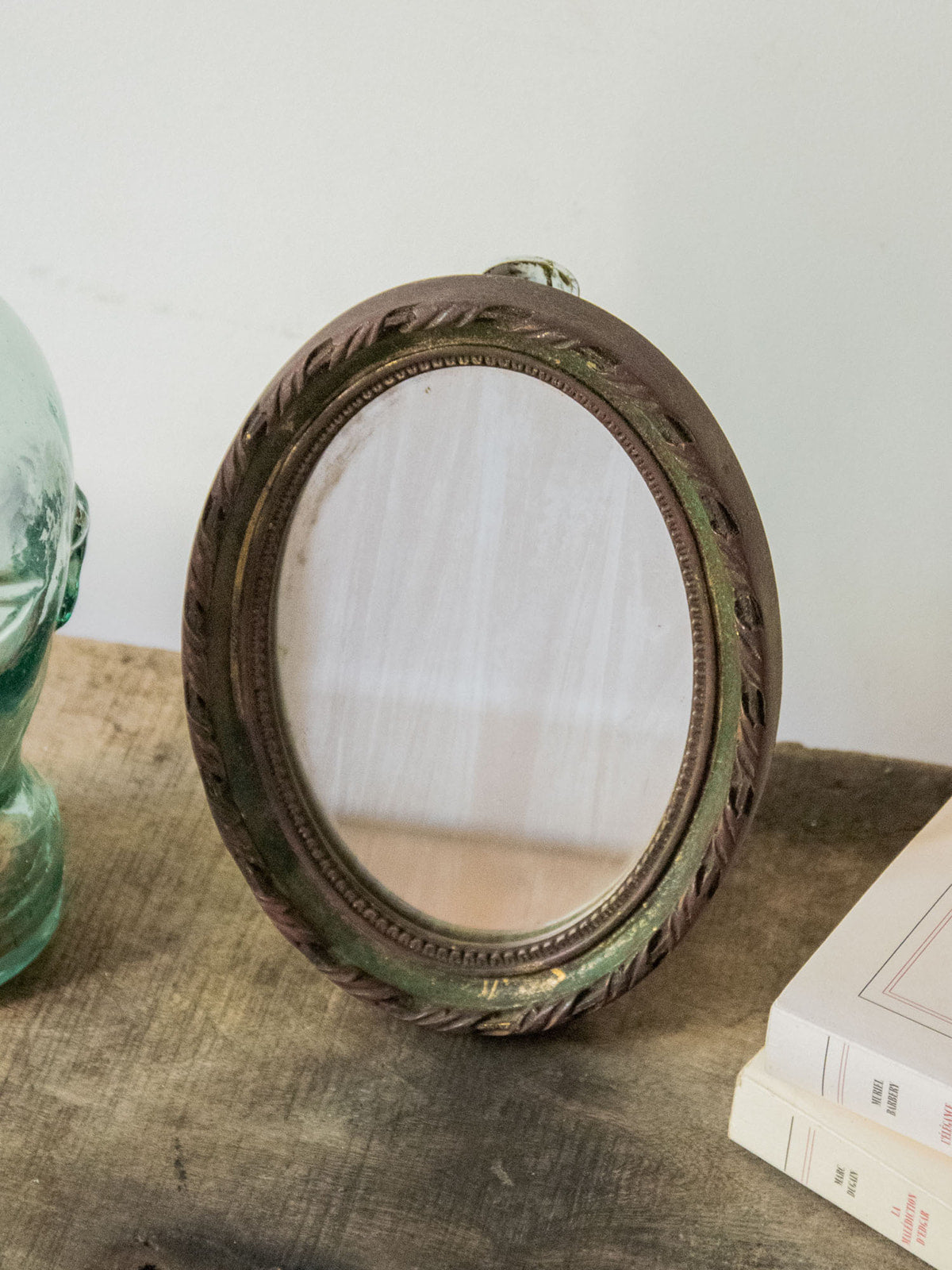 Ce miroir ovale se pare d’une délicate frise, mêlant élégance et charme discret. Les petites traces d’usure sur sa surface racontent son histoire et apportent une authenticité chaleureuse à votre intérieur. Facile à accrocher, il sublime vos murs ou accompagne votre quotidien avec poésie, offrant une note raffinée et intemporelle à votre décor.