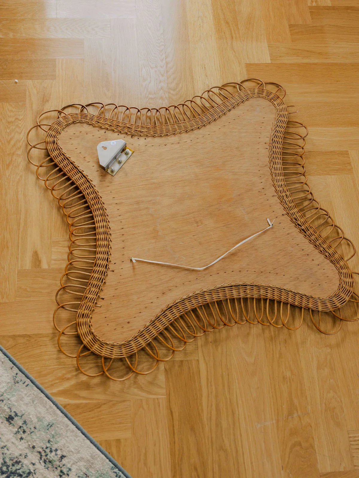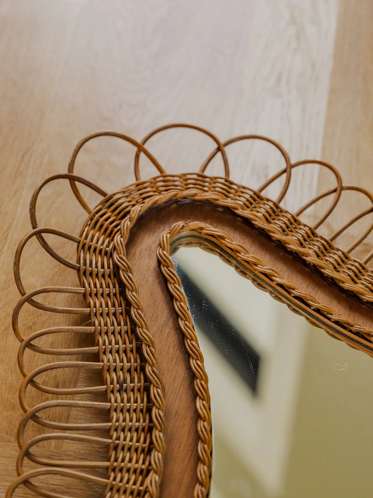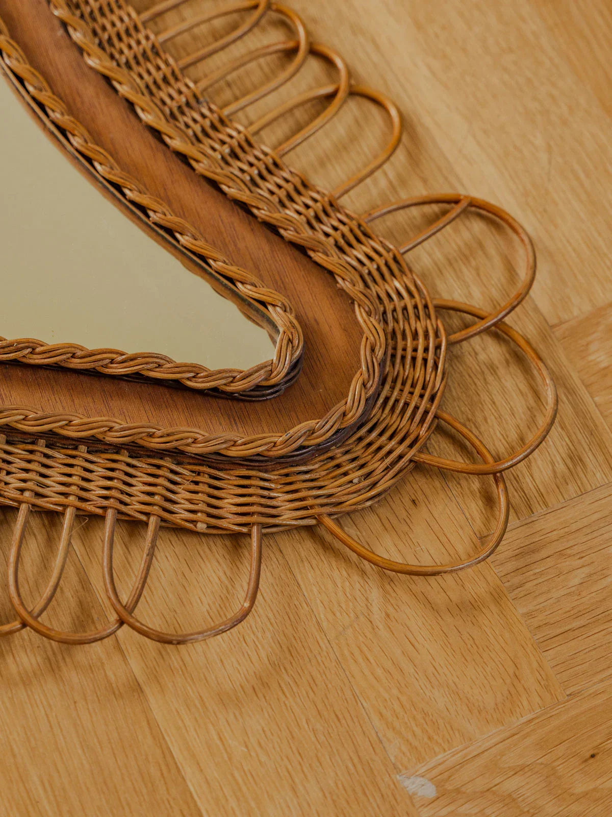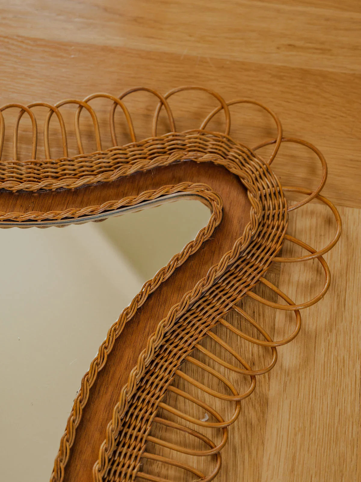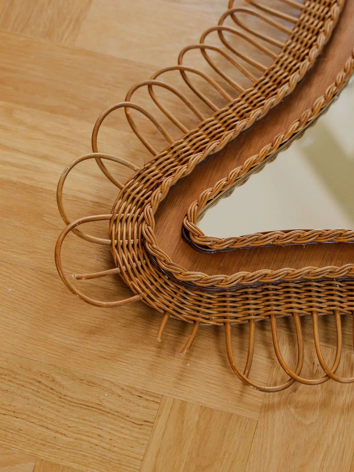 Découvrez ce miroir en rotin au format généreux, sa forme triangulaire apporte une silhouette singulière et graphique. Le tressage artisanal souligne la matière naturelle et crée une texture chaleureuse, idéale pour une entrée, un salon ou une chambre. Placé face à une fenêtre, il capte la lumière et agrandit visuellement l'espace tout en instaurant une ambiance bohème et élégante. Quelques traces du temps présentes.
