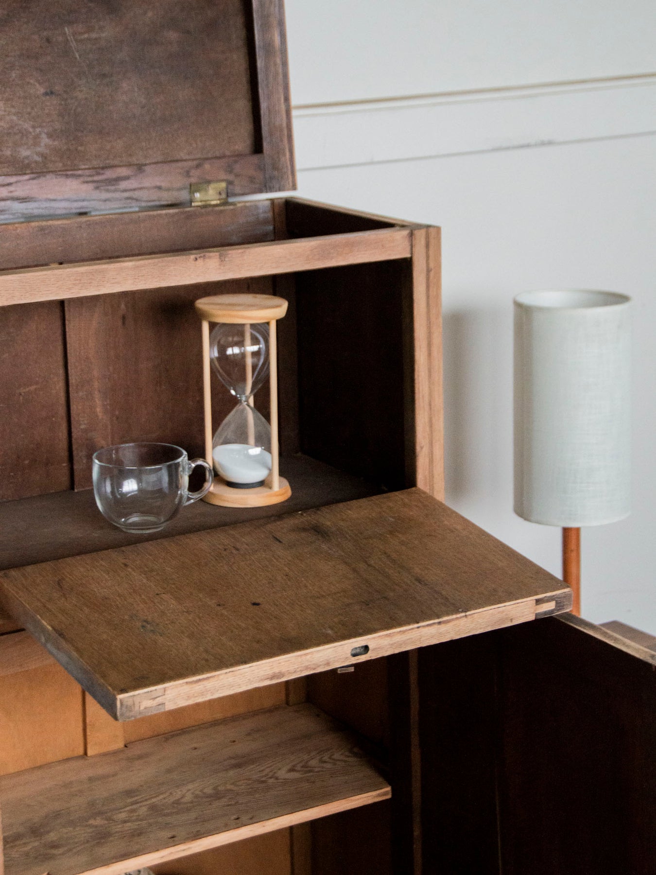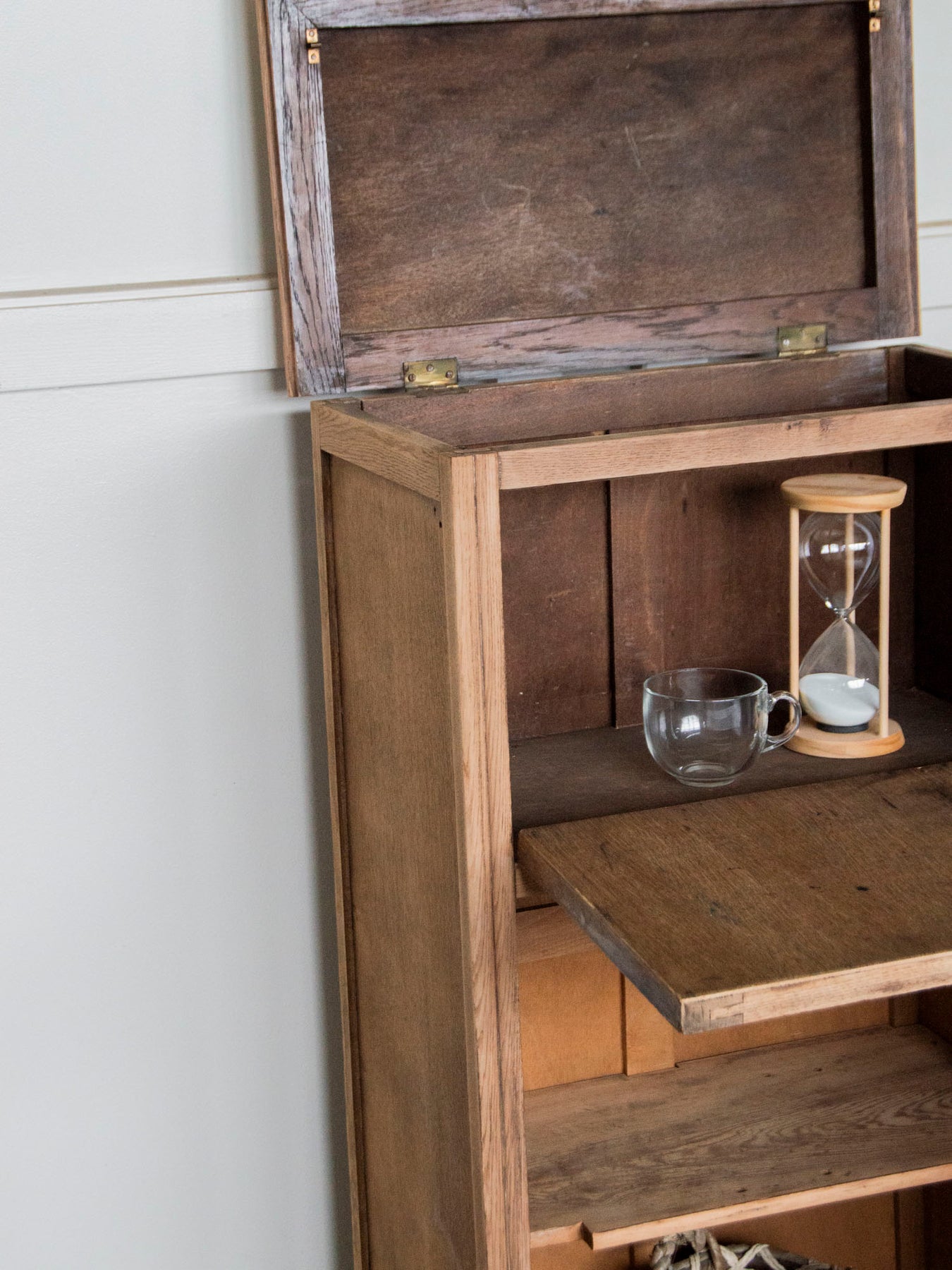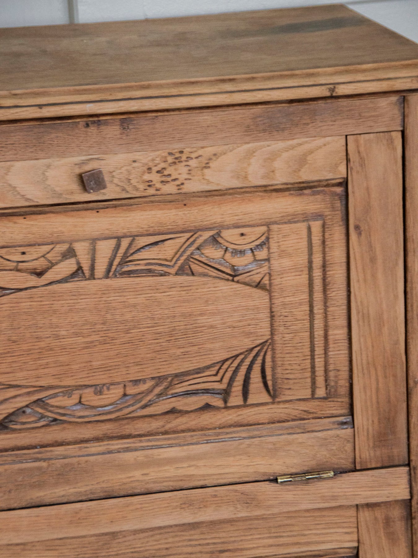 Découvrez ce petit buffet à musique en bois sculpté, aux dessins délicats qui racontent son histoire. Sa porte rabattante s'ouvre vers le haut et révèle une niche aux proportions idéales pour accueillir vinyles, vaisselle ou accessoires, tandis que les petits pieds travaillés lui offrent une silhouette élégante et légère. Fermé par une petite clé d'origine, il diffuse une note rétro raffinée et crée une ambiance chaleureuse et organisée dans l'entrée ou le salon.