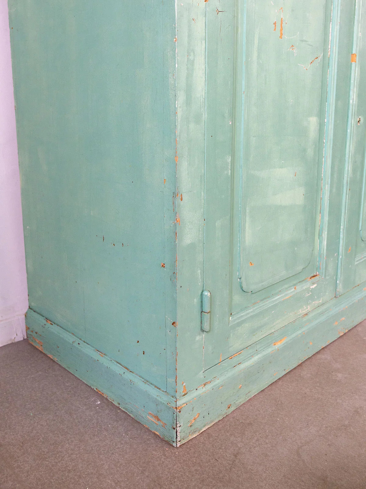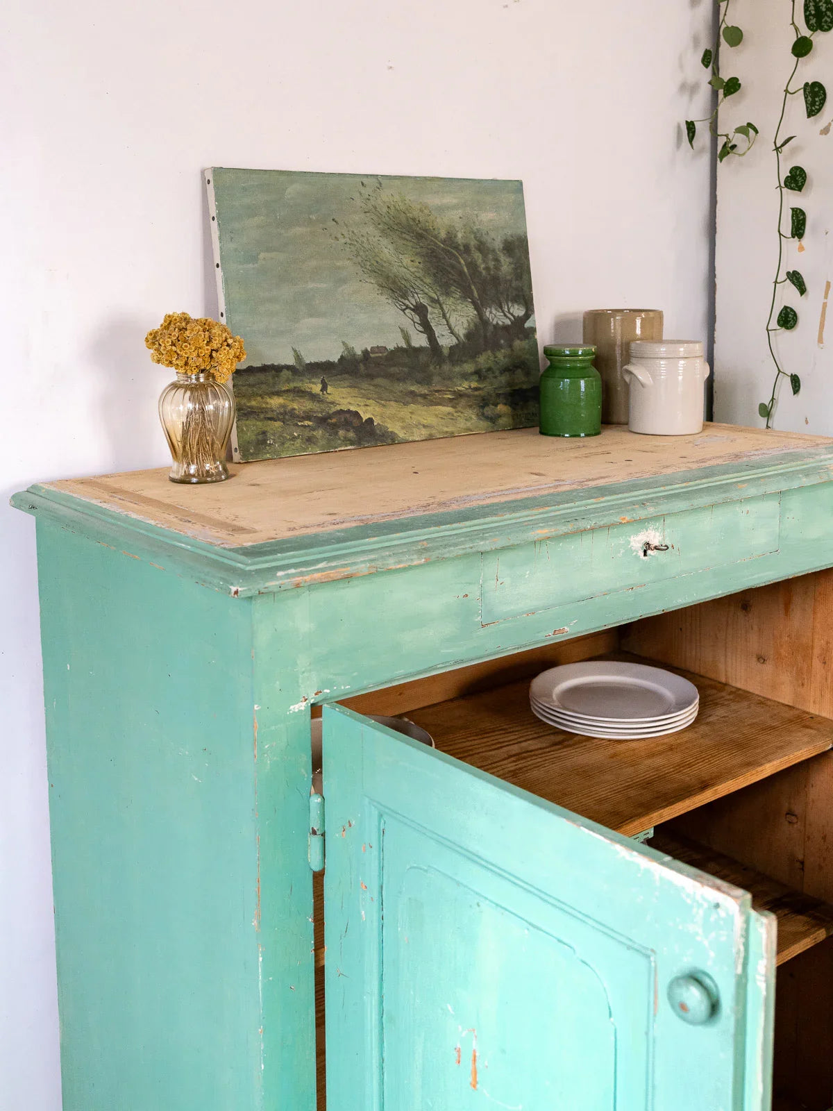 Adoptez ce buffet en bois peint d'un vert menthe pétillant, doté d'un tiroir central verrouillable avec serrure et clé et de deux portes à poignées. Son plateau en bois crée un joli contraste et offre une surface d'exposition idéale pour lampes ou objets, tandis que son volume permet de ranger vaisselle et linge. Il apportera une touche vintage et joyeuse à une cuisine ou une entrée, conciliant praticité et caractère. Quelques traces du temps et d'usage.