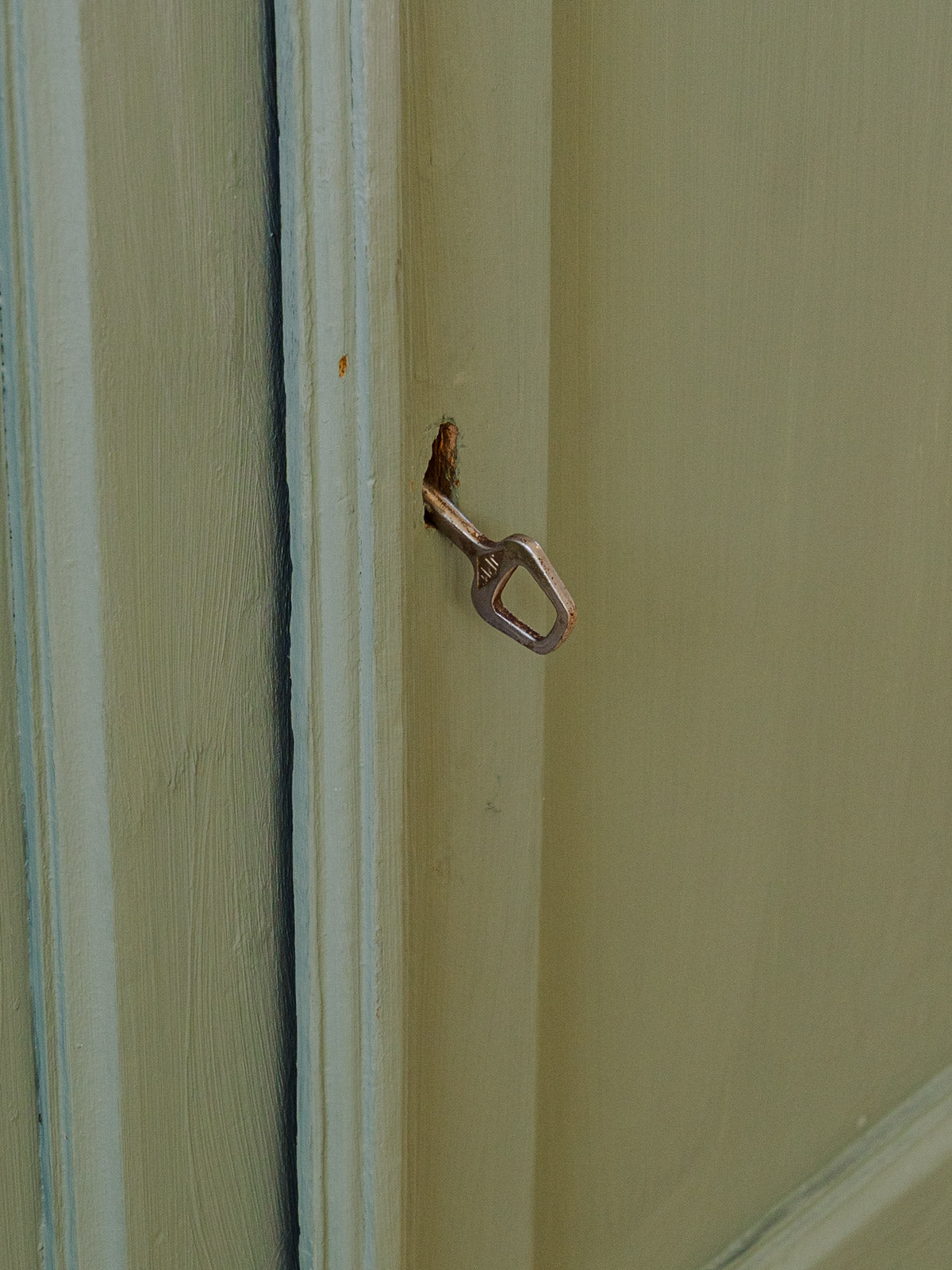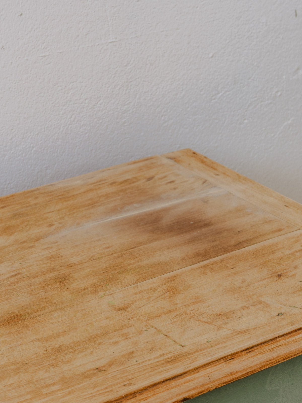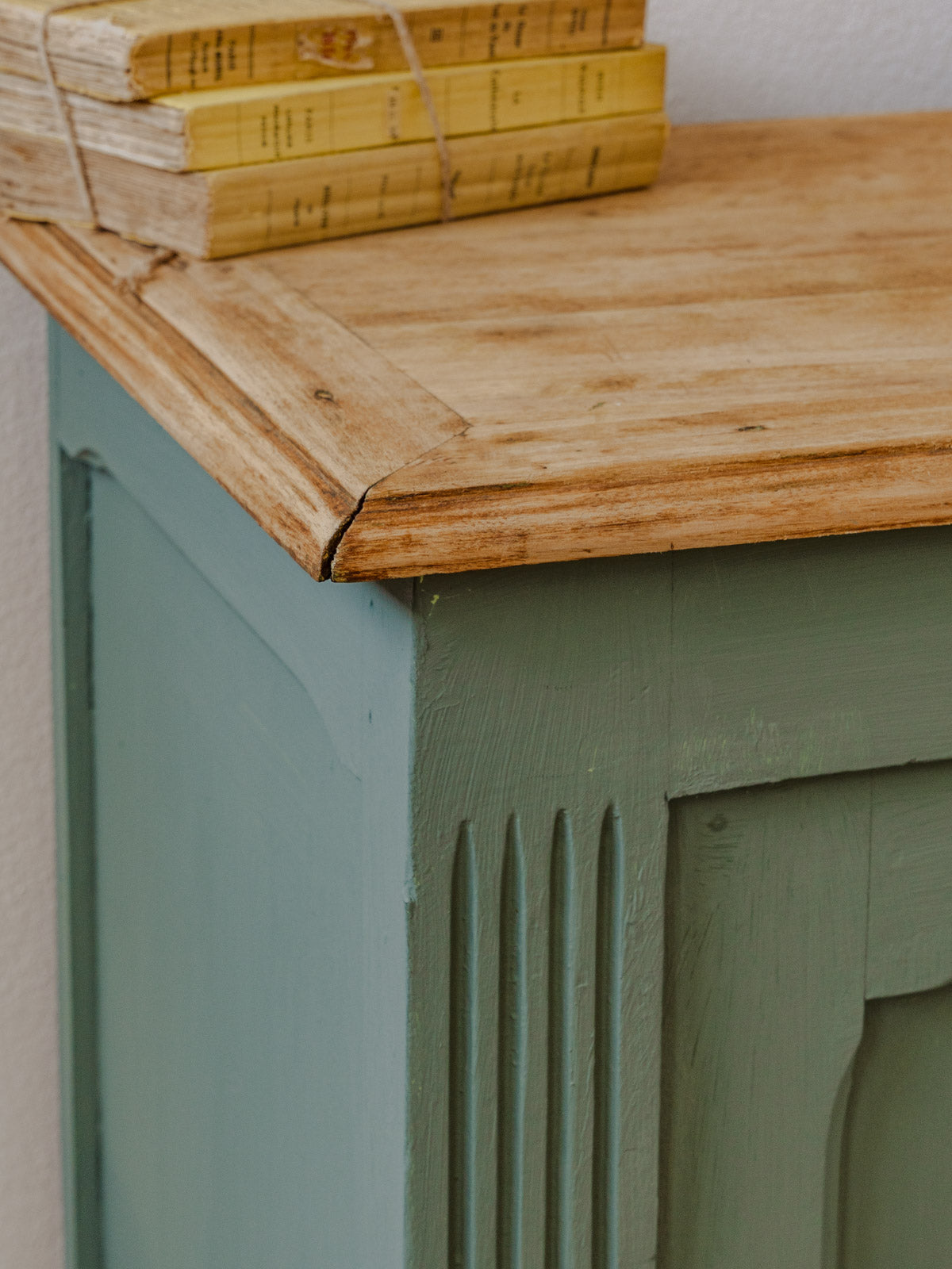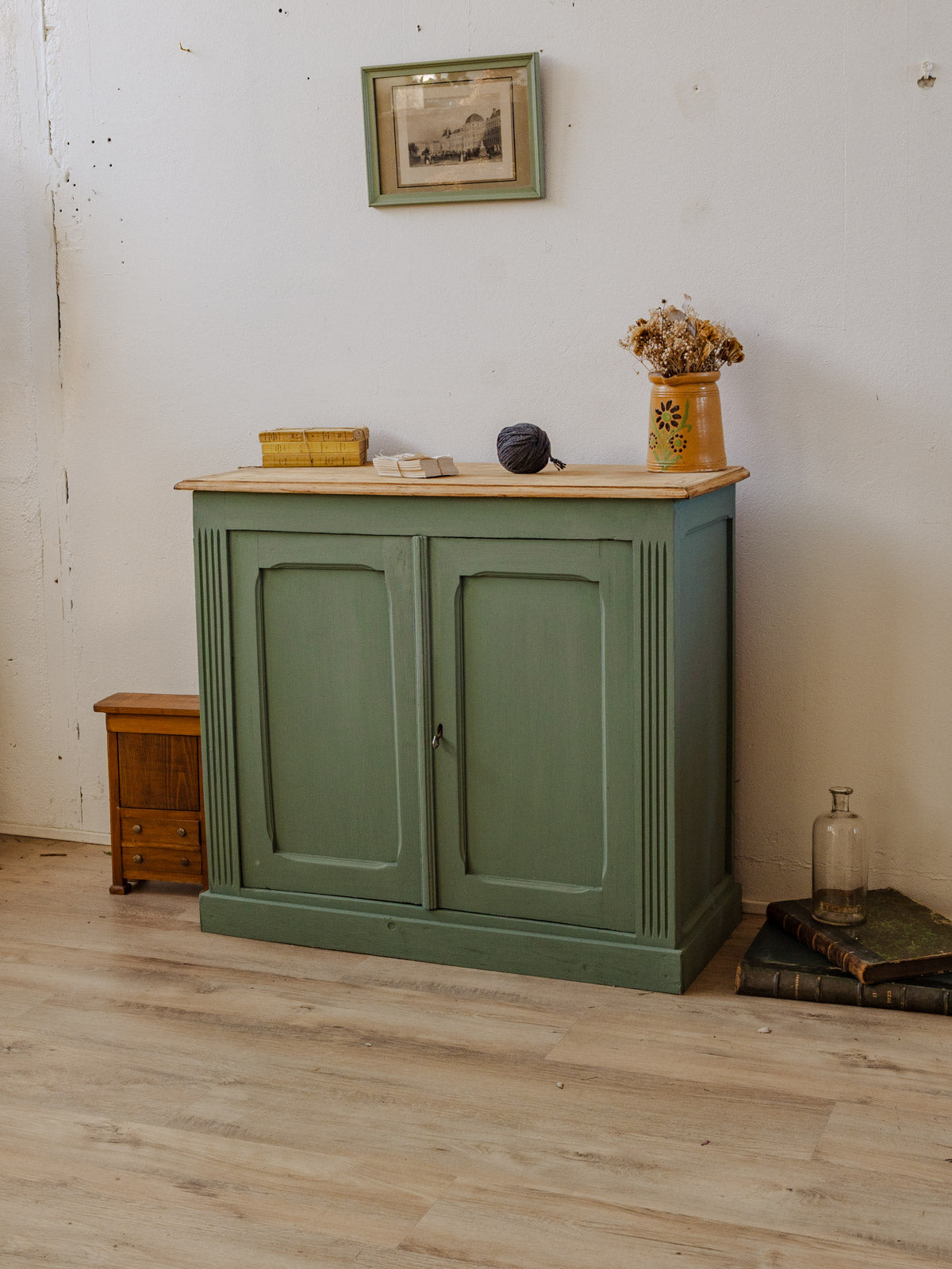 Sublimez votre intérieur avec ce buffet de campagne en bois peint d'un vert élégant, son plateau en bois apporte un contraste chaleureux. Son volume et son étagère intérieure offrent un rangement malin pour la vaisselle ou le linge de table, tandis que la serrure et la clé fonctionnelle soulignent son caractère authentique. Parfait pour une cuisine ou une entrée, il instille une ambiance champêtre et accueillante. Quelques traces du temps présentes.