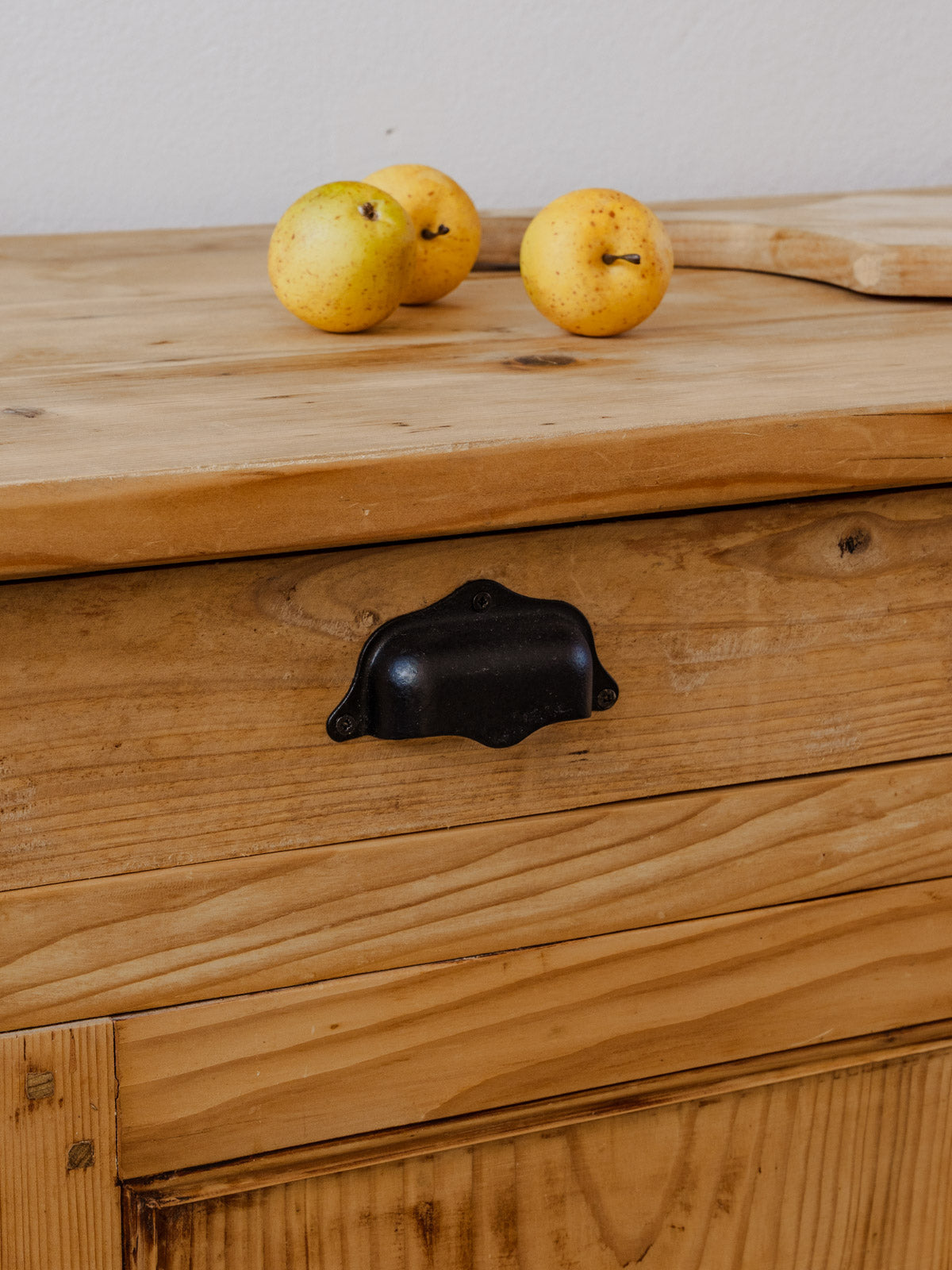 Apportez ce buffet de campagne en bois aux lignes chaleureuses et raffinées, doté de trois tiroirs garnis de poignées coquillage noires et d'une étagère intérieure aménageant un rangement pratique pour vaisselle, linge ou objets de déco. Sa serrure munie d'une clé fonctionnelle souligne son caractère authentique et permet de préserver son contenu, tandis que la teinte claire installe une atmosphère lumineuse et champêtre dans la pièce. Quelques traces du temps présentes.