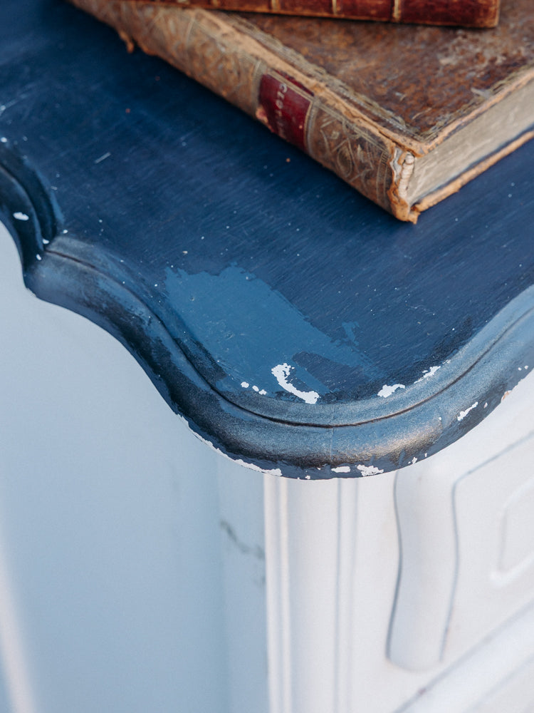 Adoptez ce confiturier en bois au plateau gris et corps peint blanc, qui marie charme rétro et sobriété contemporaine. Équipé d'un tiroir discret et d'une niche généreuse, il accueille bocaux, vaisselle ou linge avec élégance. La poignée en métal et la clé décorative ornée d'un pompon beige ajoutent une note délicate, tandis que les pieds sculptés soulignent son allure authentique et chaleureuse. Traces d'usures visibles.