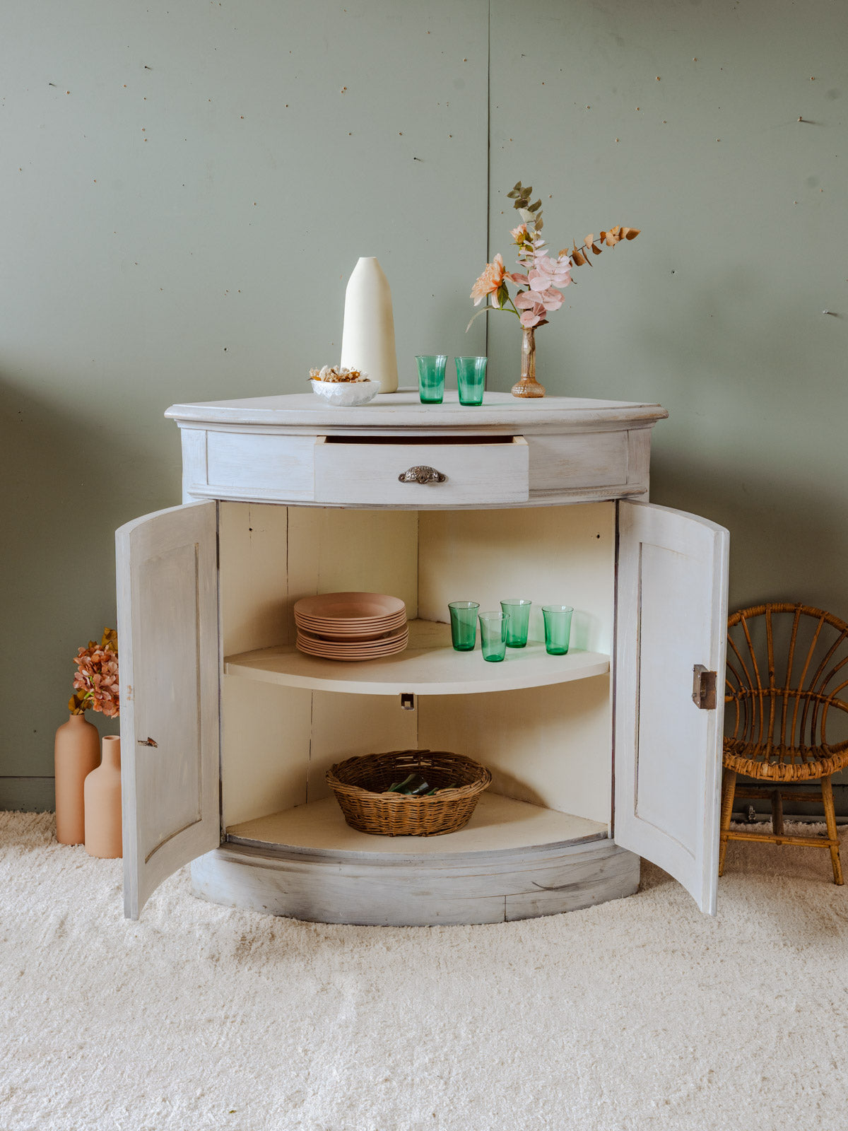 Apportez une touche douce et singulière à votre intérieur avec ce buffet de coin en bois poncé et peint d'un bleu ciel. Sa silhouette révèle un tiroir ponctué d'une poignée argentée d'origine et une porte sécurisée par une serrure fonctionnelle avec clé, idéale pour ranger bouteilles et services tout en restant accessible. Sa couleur lumineuse et le bois lui confèrent un charme rétro-chic qui habille une cuisine comme un salon. Quelques traces du temps présentes.