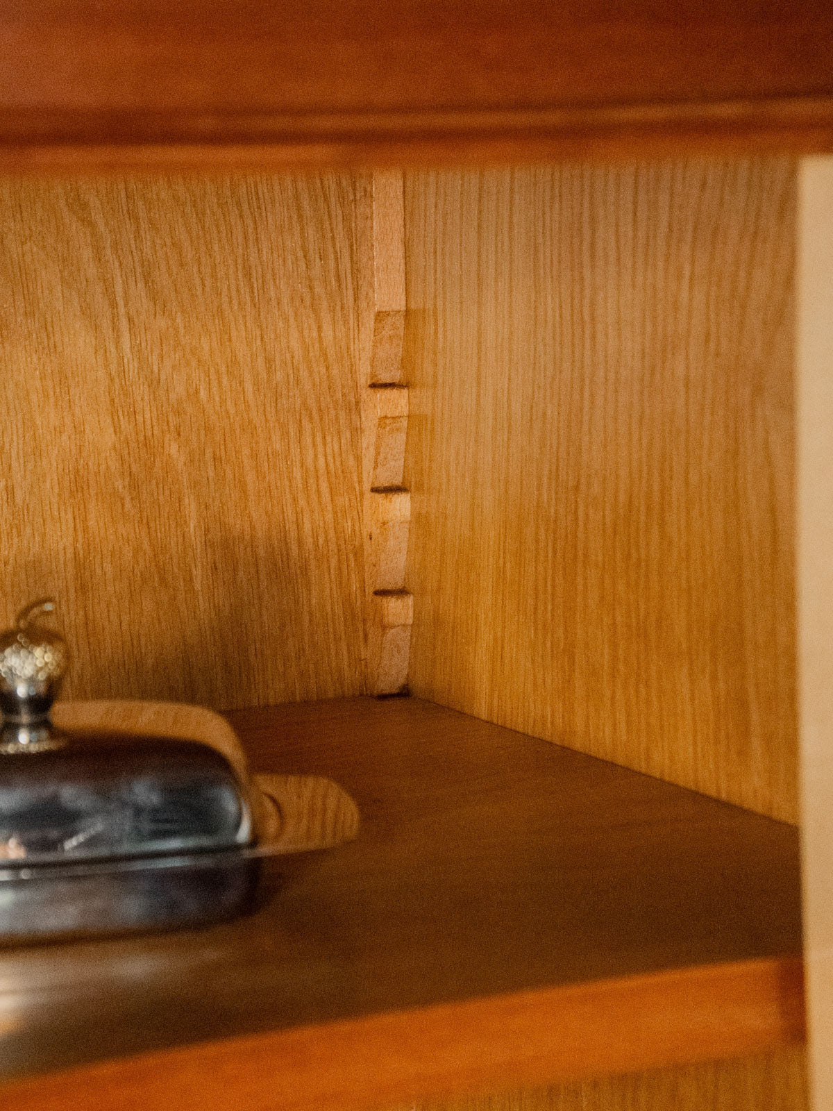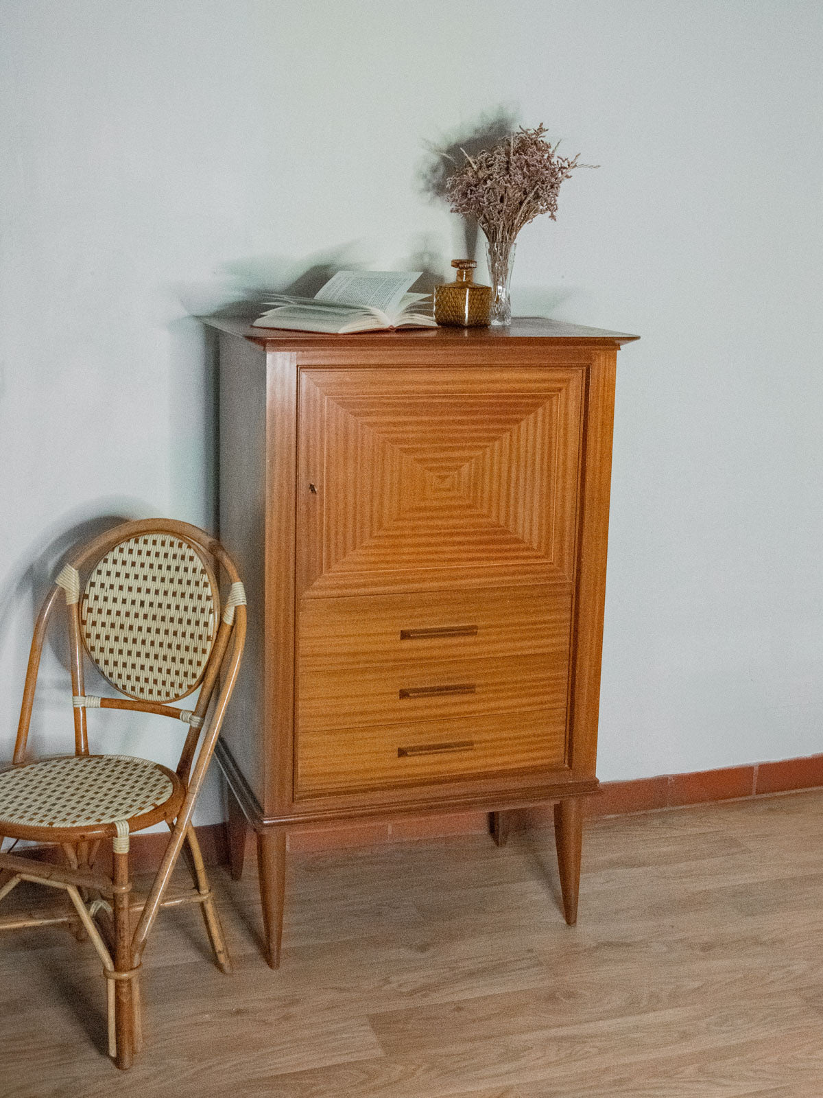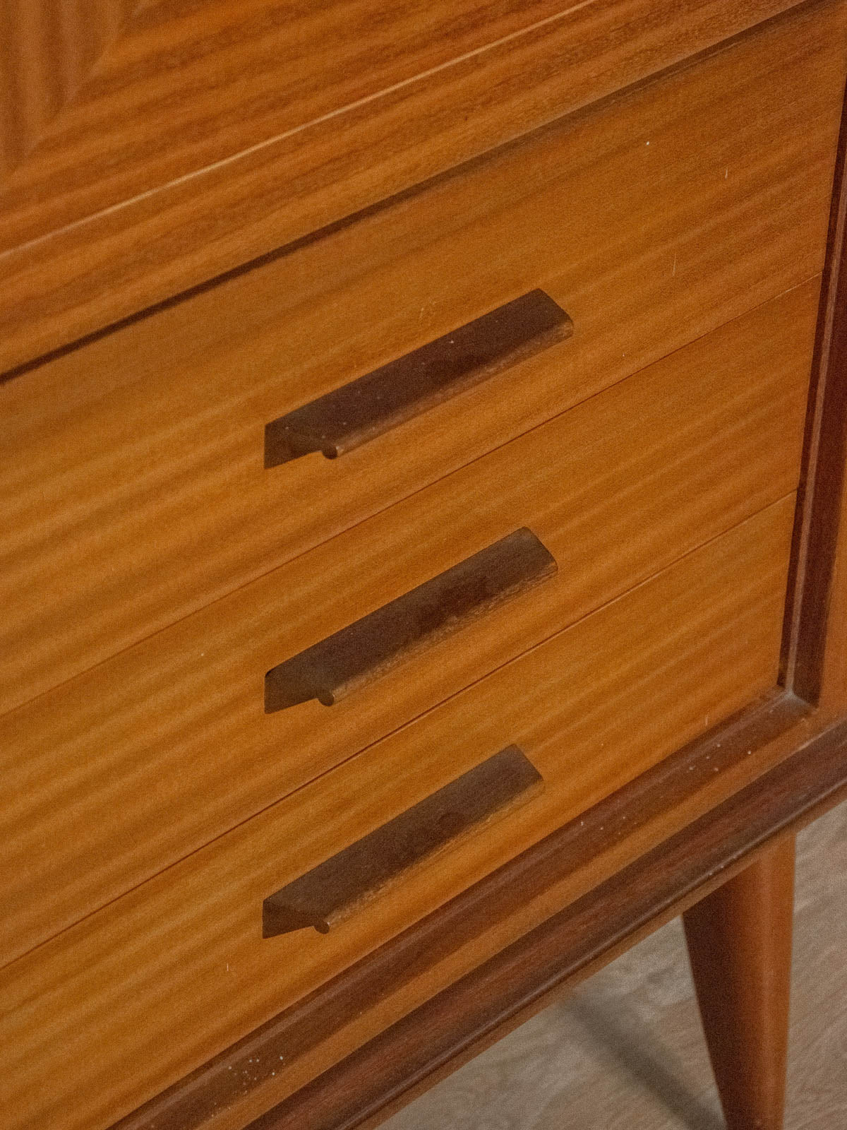 Offrez à votre intérieur ce buffet des années 70 au placage chaleureux, orné de motifs triangulaires graphiques et reposant sur des pieds compas, qui impose un style rétro chic tout en restant résolument fonctionnel. Une porte révèle une étagère réglable pour organiser vaisselle ou livres, tandis que trois tiroirs offrent un rangement instinctif et pratique; le plateau supérieur devient une belle surface d'exposition pour objets et plantes, créant une ambiance chaleureuse et sophistiquée. Quelques accrocs et manques de placage sont présents.