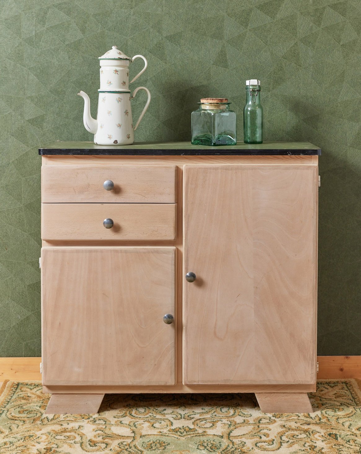 Apportez une touche rétro à votre cuisine avec ce petit buffet mado, au charme des années 50 et aux proportions idéales pour un coin repas ou une petite cuisine. Son plateau vert et ses deux tiroirs, munis de poignées rondes en métal, offrent un rangement modulable et un plan de travail coloré, tandis que les portes dissimulent un espace utile pour vaisselle et bocaux. Le contraste entre le bois chaleureux et les détails métalliques crée une ambiance accueillante et graphique. Traces d'usure présentes sur le plateau.