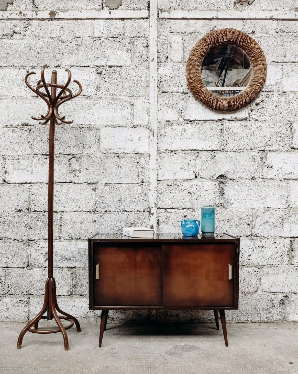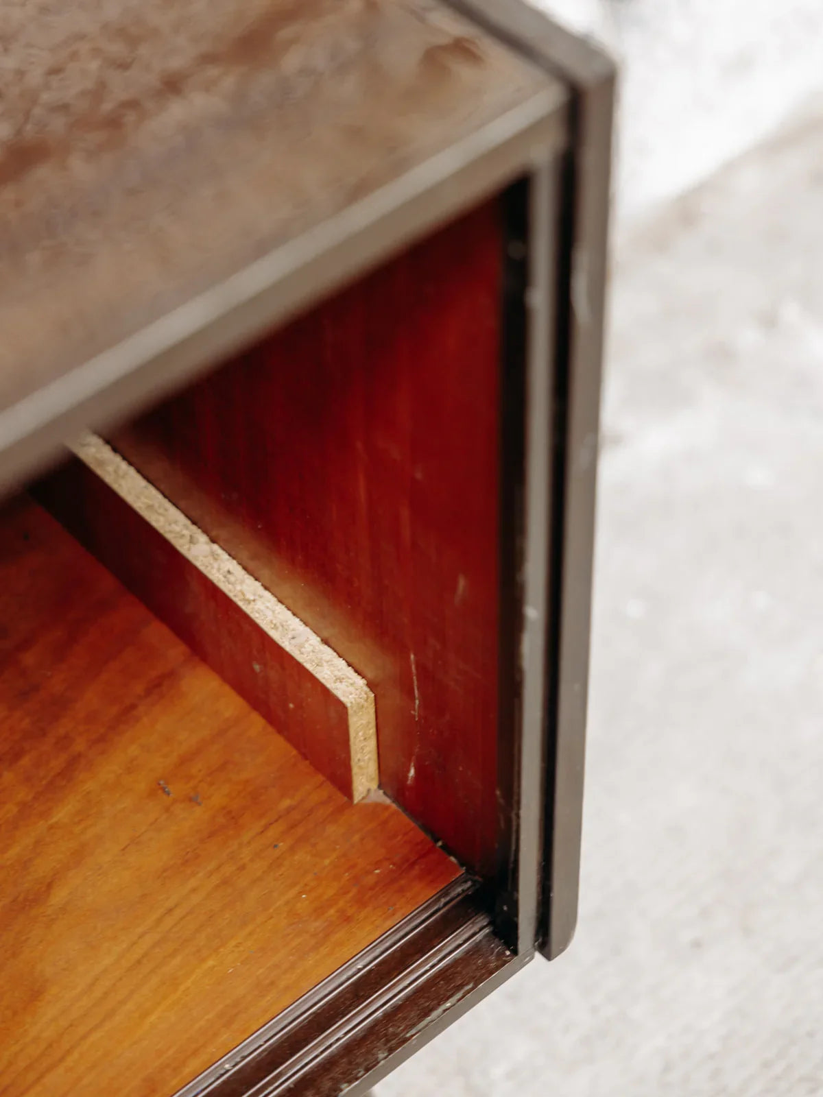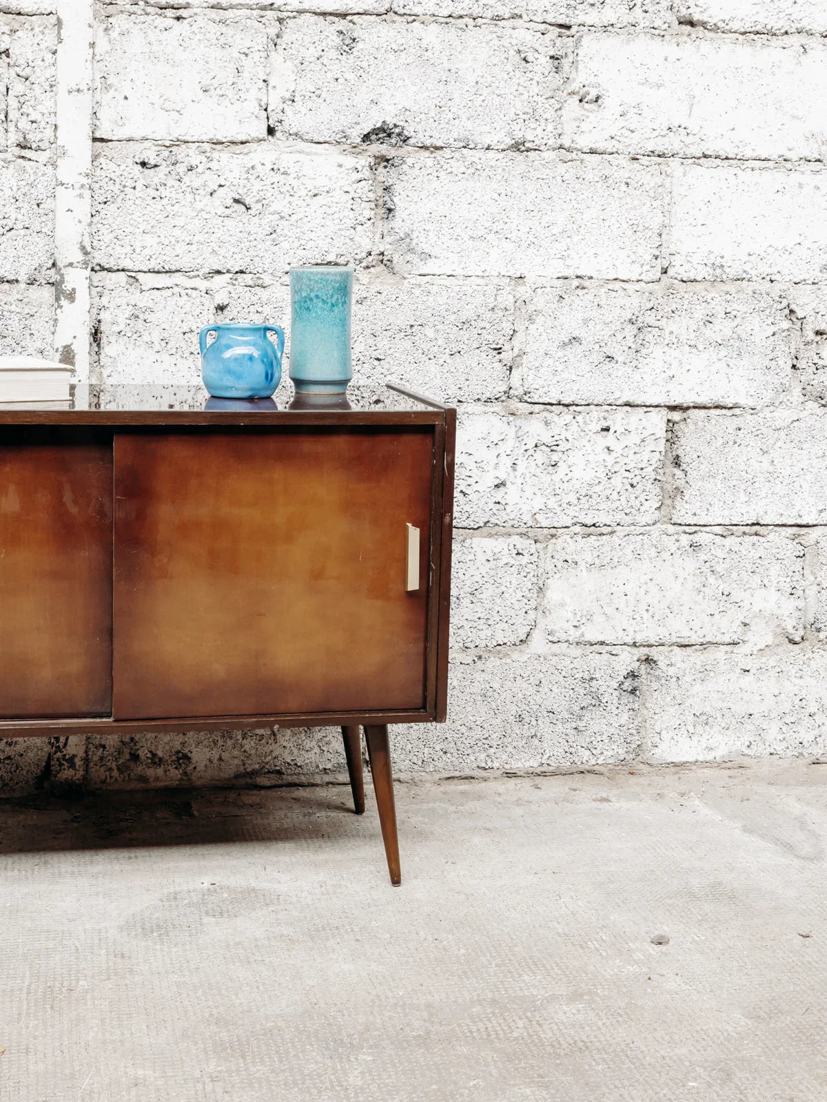 Ce petit meuble en bois vernis avec deux portes coulissantes allie élégance et praticité. Sa finition lisse et brillante met en valeur le grain du bois, tandis que son design compact et fonctionnel permet un rangement astucieux. Parfait pour un salon ou une chambre, il ajoute une touche de sophistication tout en optimisant l'espace avec ses portes coulissantes.