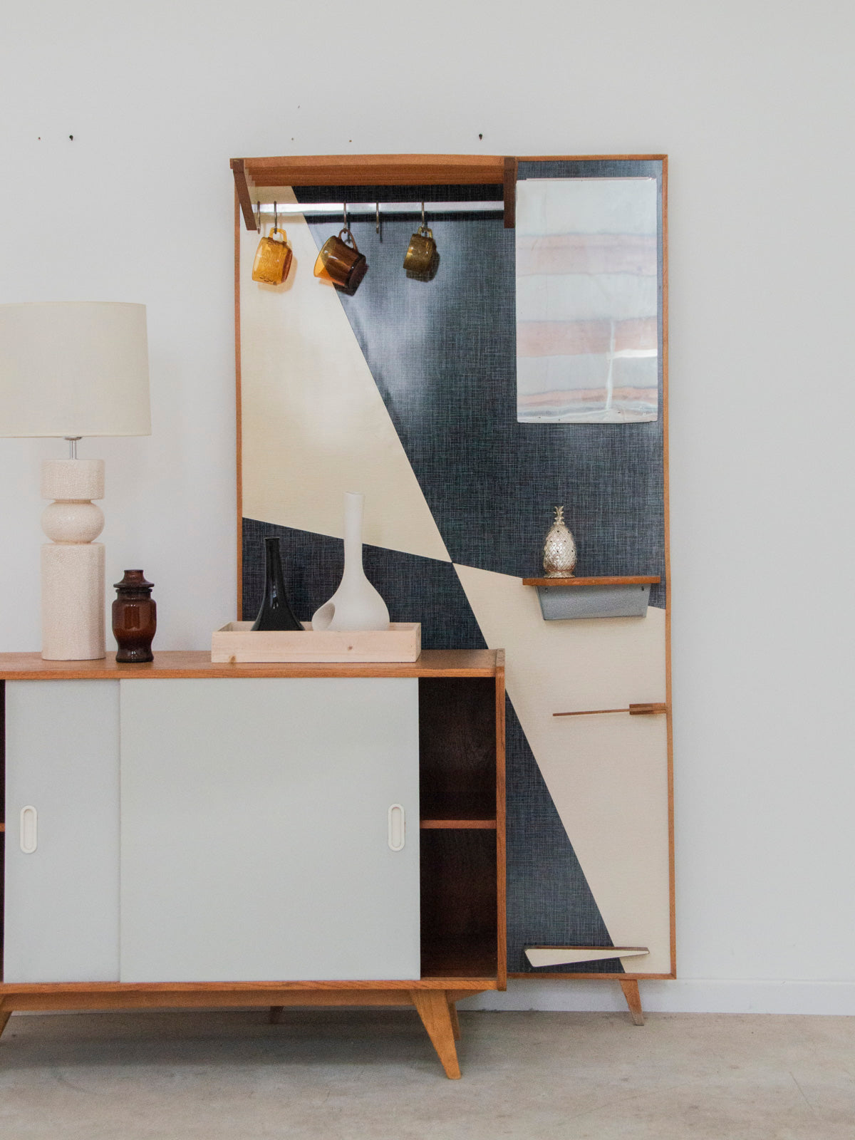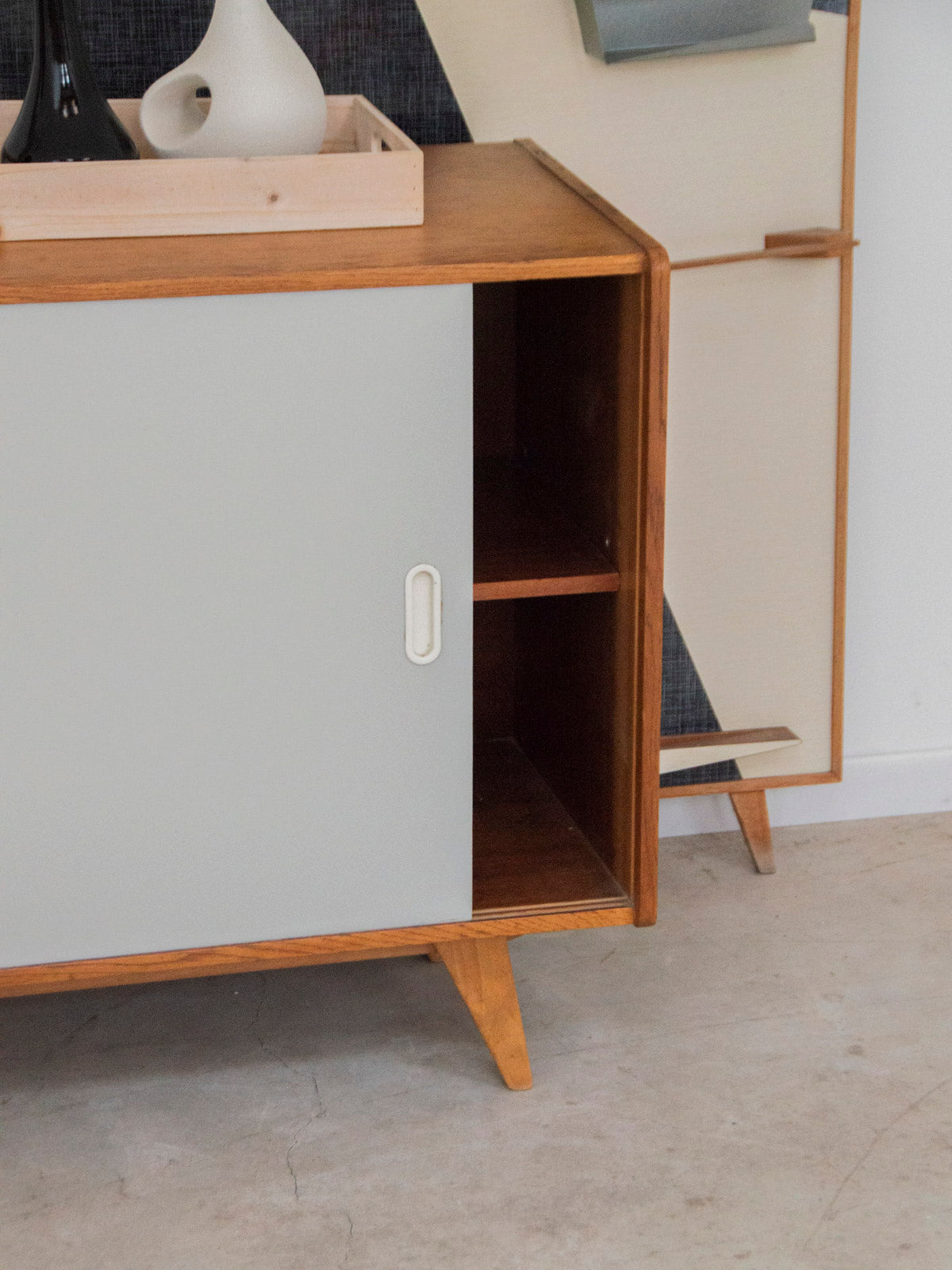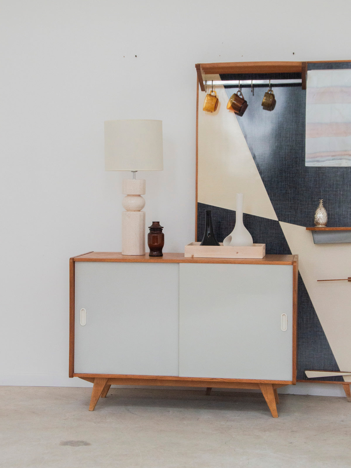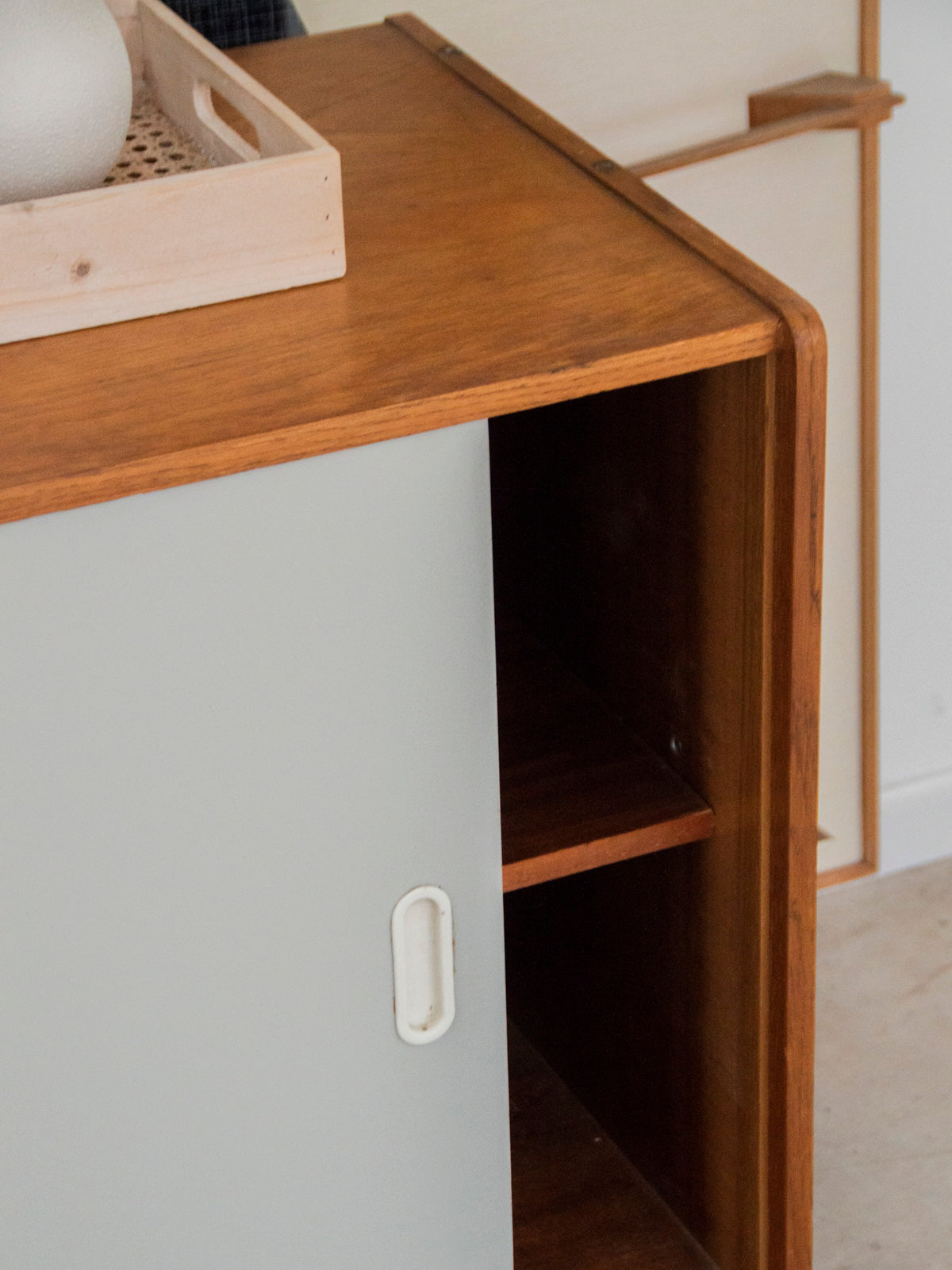 Adoptez ce petit buffet en bois foncé au style sobre et graphique, reposant sur des pieds compas emboîtés qui lui confèrent une allure légère et structurée. Deux portes grisées, ponctuées de petites poignées blanches, ouvrent sur une étagère intérieure idéale pour organiser vaisselle, textiles ou objets du quotidien dans un format compact qui s'intègre aisément à une entrée, une salle à manger ou un salon. Sa silhouette équilibrée et ses contrastes de matériaux dégagent une atmosphère chaleureuse et raffinée.
