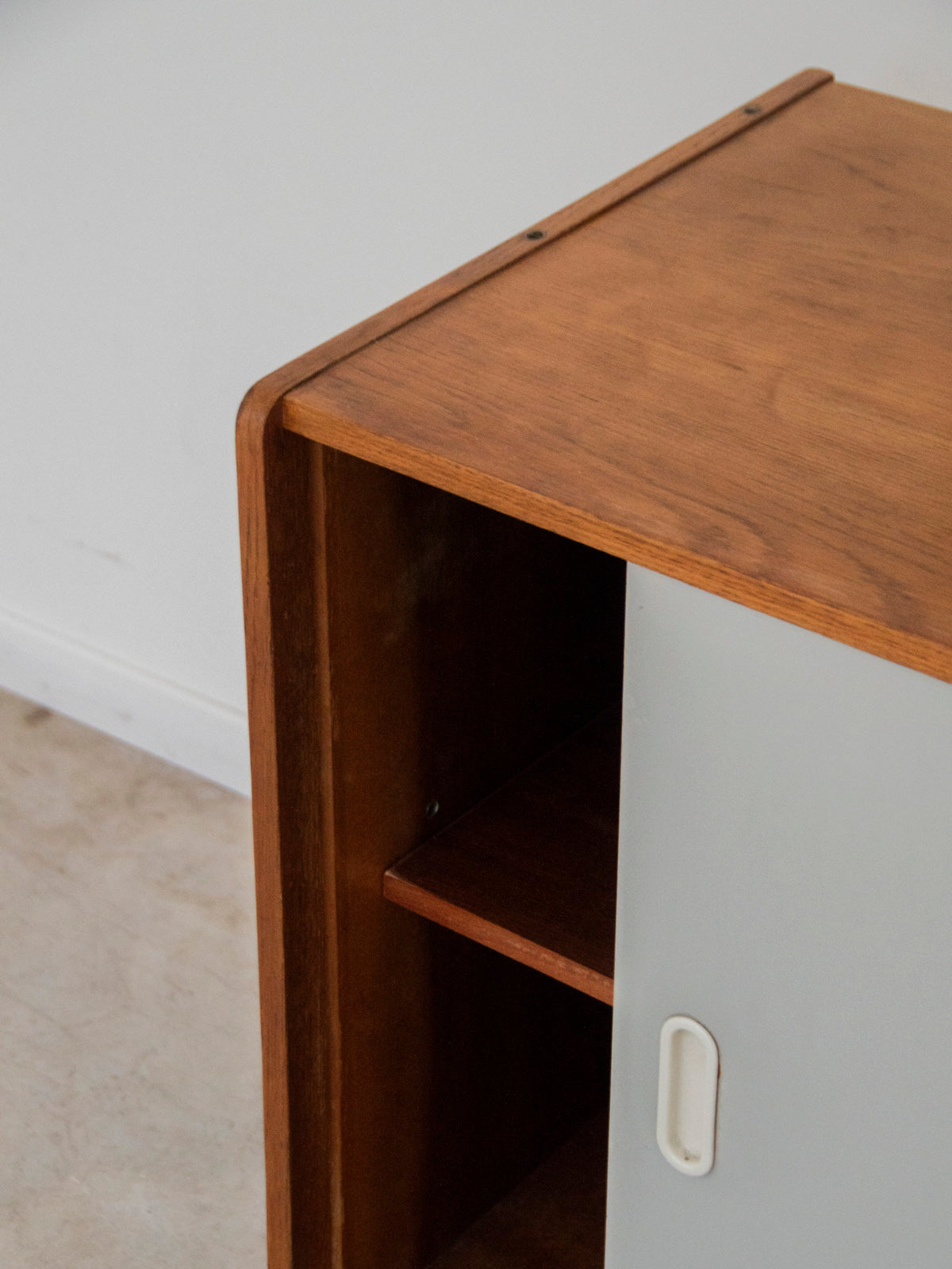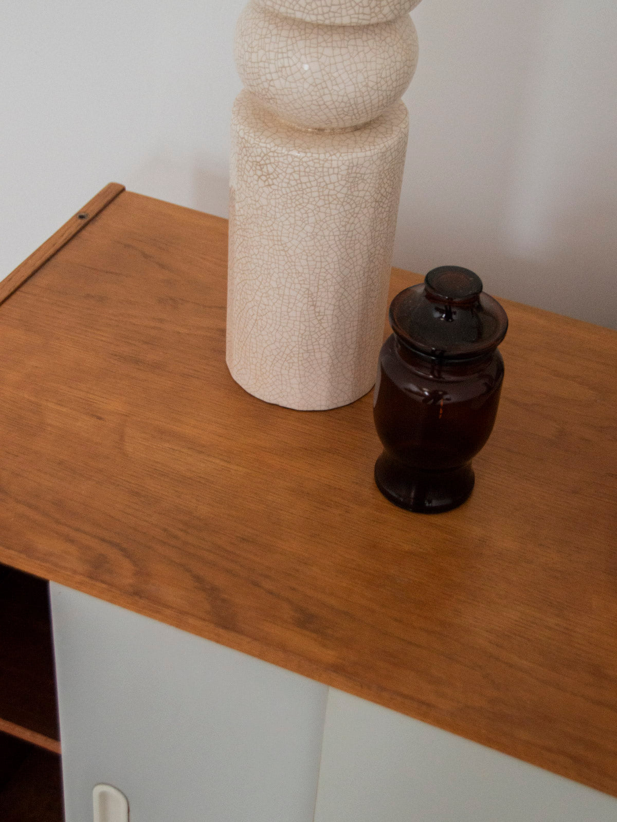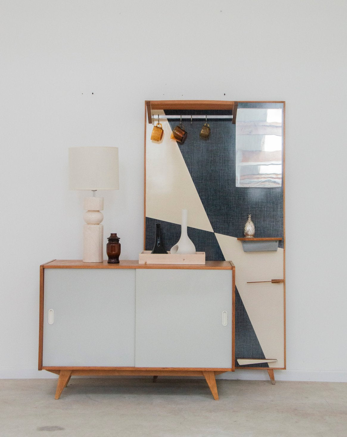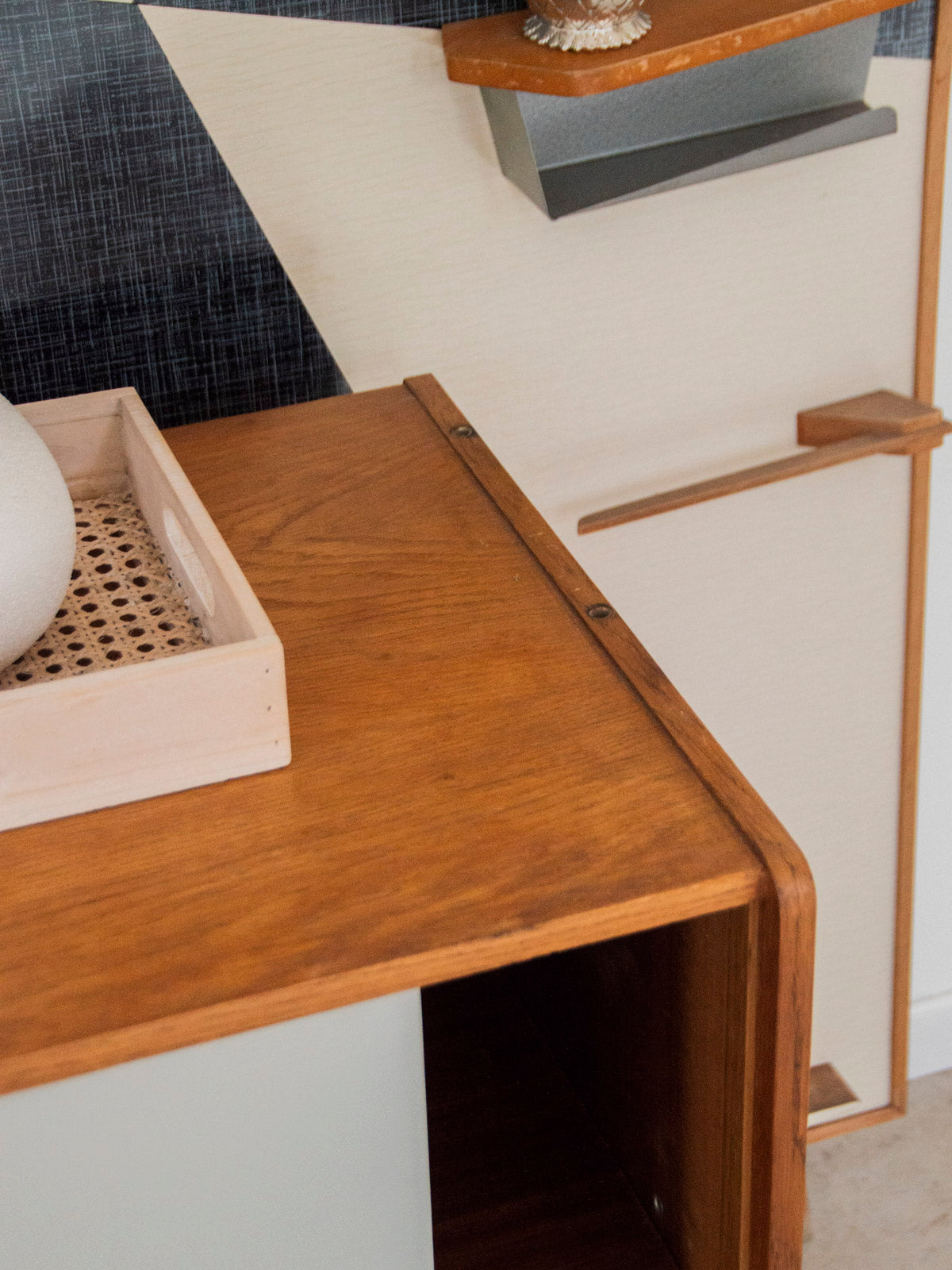 Adoptez ce petit buffet en bois foncé au style sobre et graphique, reposant sur des pieds compas emboîtés qui lui confèrent une allure légère et structurée. Deux portes grisées, ponctuées de petites poignées blanches, ouvrent sur une étagère intérieure idéale pour organiser vaisselle, textiles ou objets du quotidien dans un format compact qui s'intègre aisément à une entrée, une salle à manger ou un salon. Sa silhouette équilibrée et ses contrastes de matériaux dégagent une atmosphère chaleureuse et raffinée.