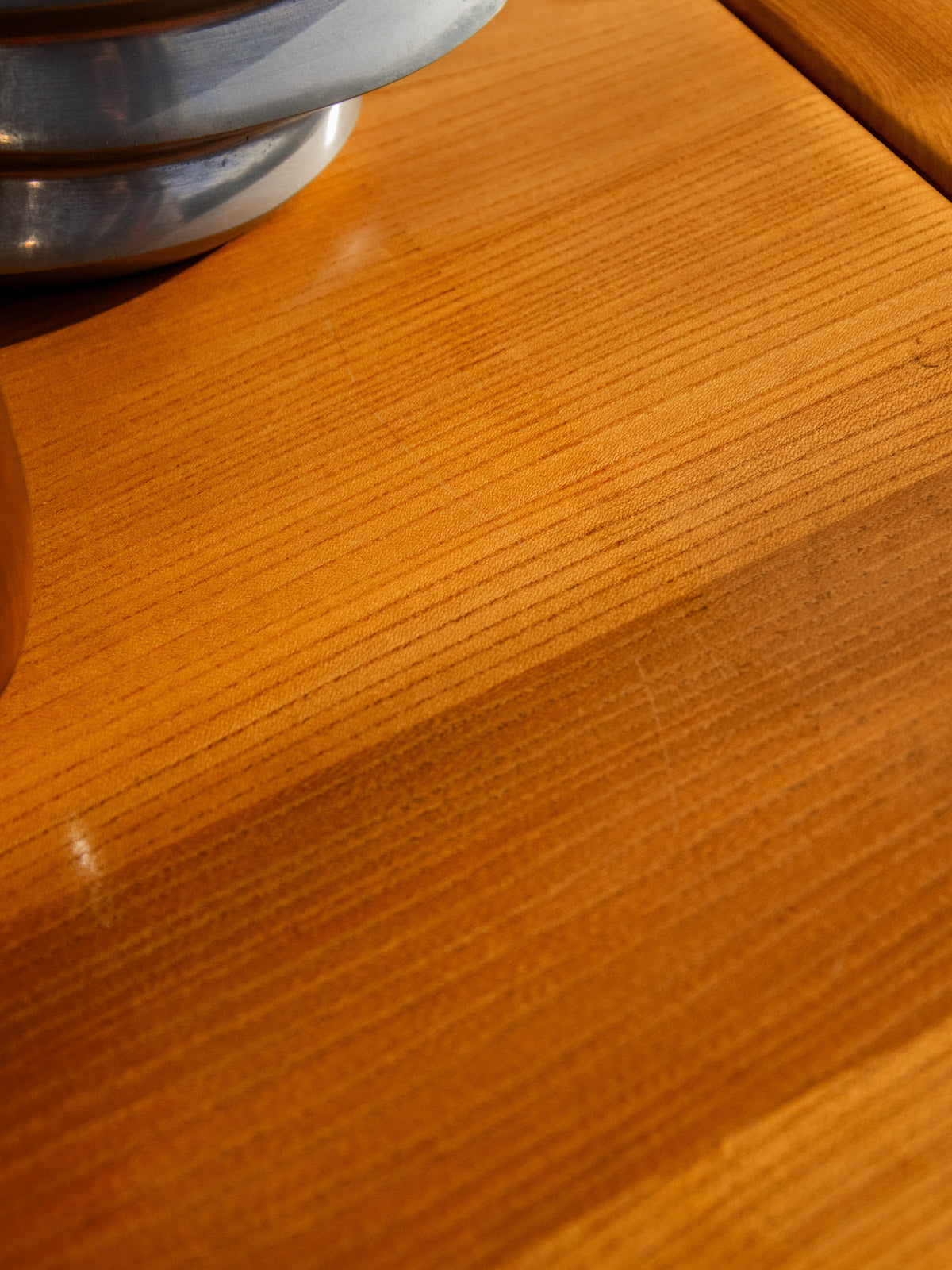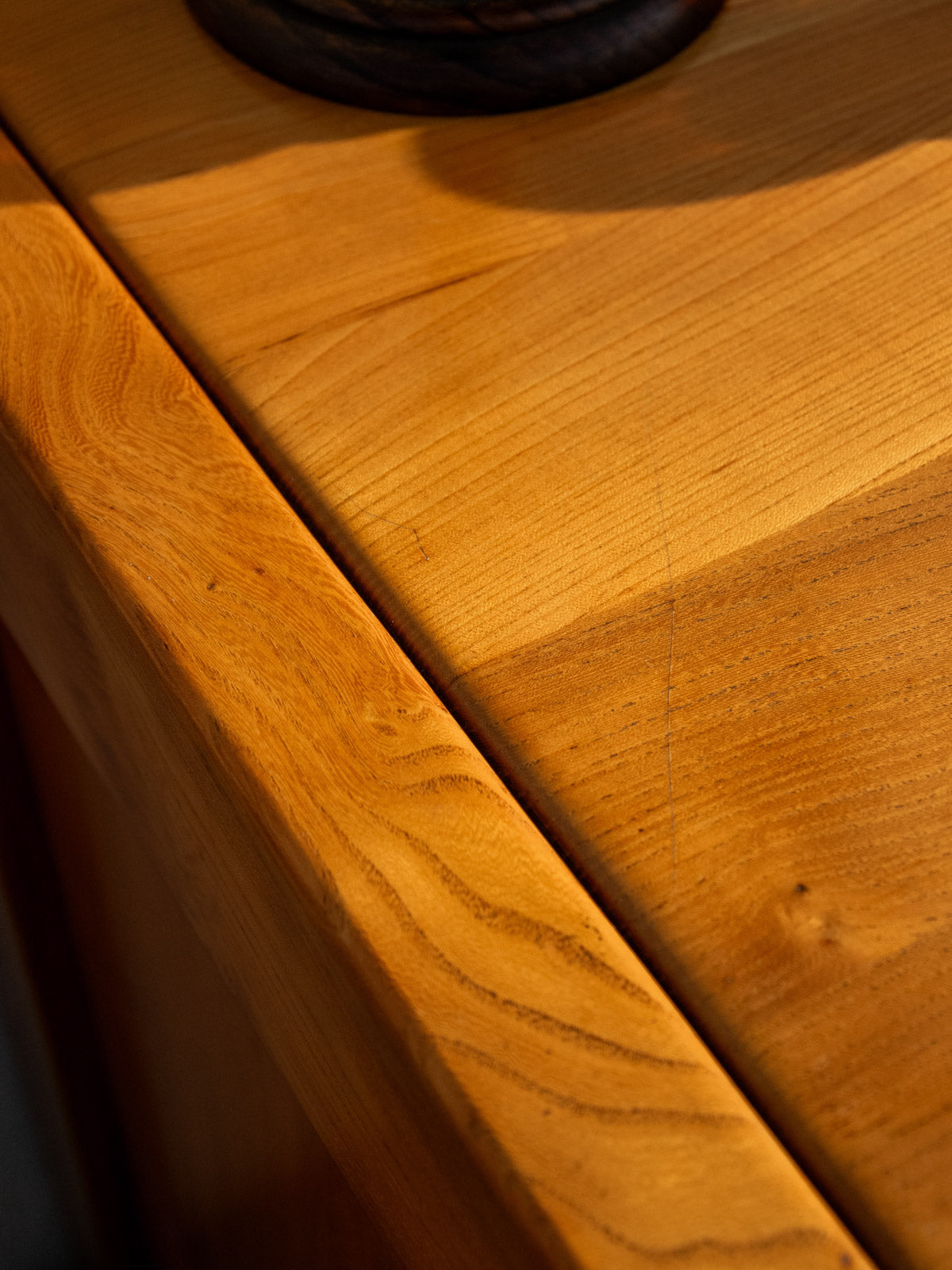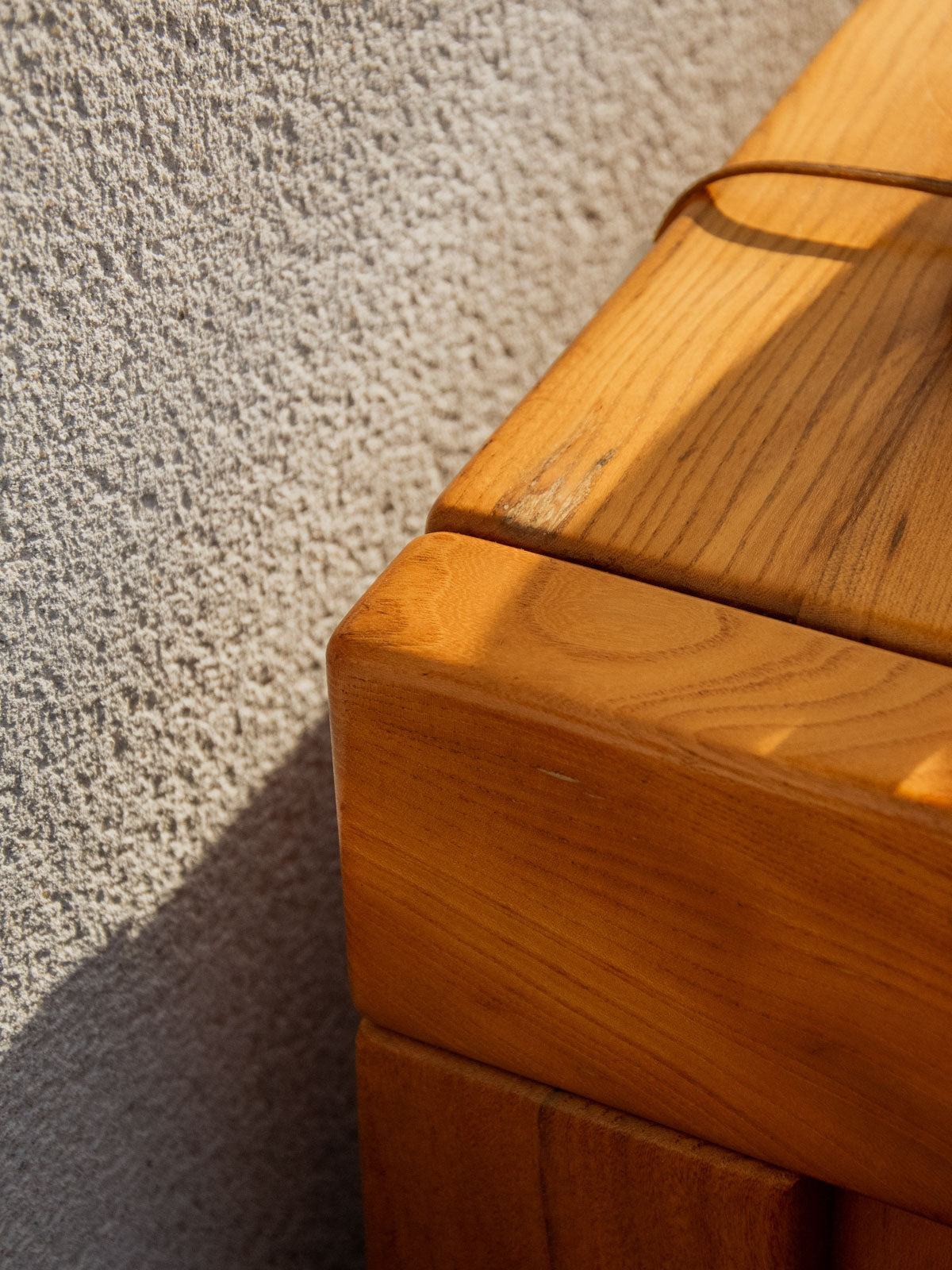 Sublimez votre intérieur avec ce buffet confiturier brutaliste attribué à la Maison Regain, réalisé en orme massif, aux lignes franches et à l'allure résolument architecturée. Solide et en très bon état, ses étagères profondes offrent un rangement généreux pour vaisselle, bocaux ou textiles, tandis qu'une tablette haute accueille objets volumineux. Idéal pour la cuisine, la salle à manger ou l'entrée, il apporte une présence chaleureuse et une matière authentique, prête à structurer un intérieur sobre et inspirant.