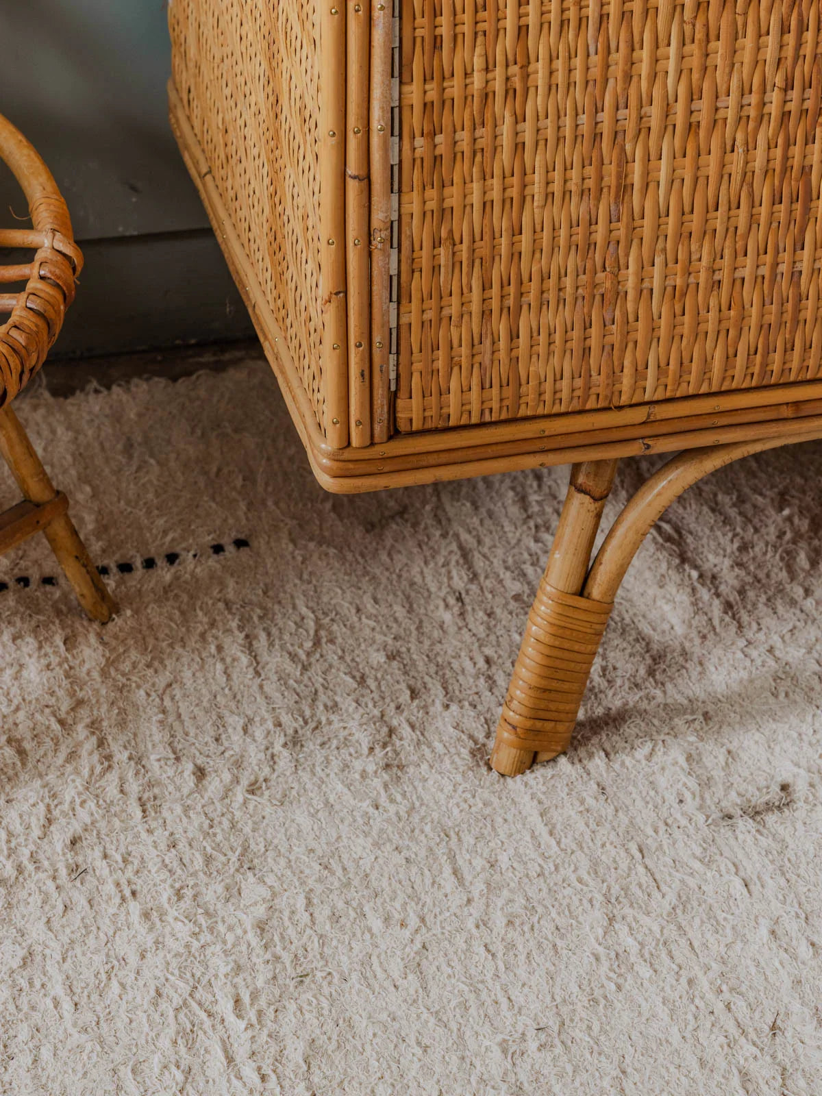 Apportez une touche naturelle et élégante à votre intérieur avec ce buffet canné en osier posé sur pieds en bambou, son plateau beige et ses poignées noires en métal soulignent une alliance de matériaux authentiques. Ses deux étagères offrent un rangement pour vaisselle, linge ou objets décoratifs, et son gabarit s'intègre aussi bien dans une entrée qu'un séjour lumineux. Son esprit artisanal crée une atmosphère douce et chaleureuse. Quelques traces du temps présentes.