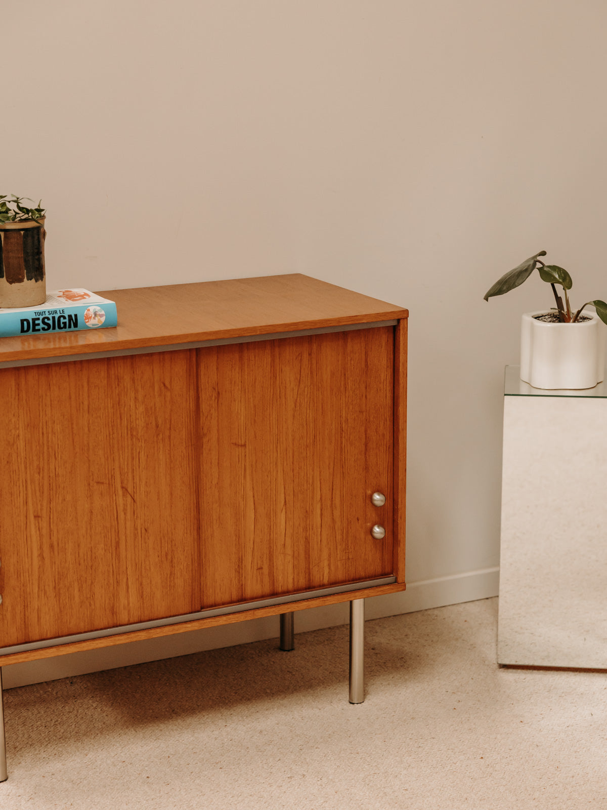 Adoptez ce buffet en teck aux lignes épurées, sublimé par des poignées rondes en métal et des pieds chromés qui lui confèrent une silhouette aérienne. Ses deux placards coulissants offrent un rangement modulable, idéal pour la vaisselle, les archives ou l'équipement multimédia discret, tandis que le bois foncé apporte une chaleur subtile. Parfait pour ancrer une salle à manger ou nuancer un salon contemporain, il crée une atmosphère élégante et apaisée.