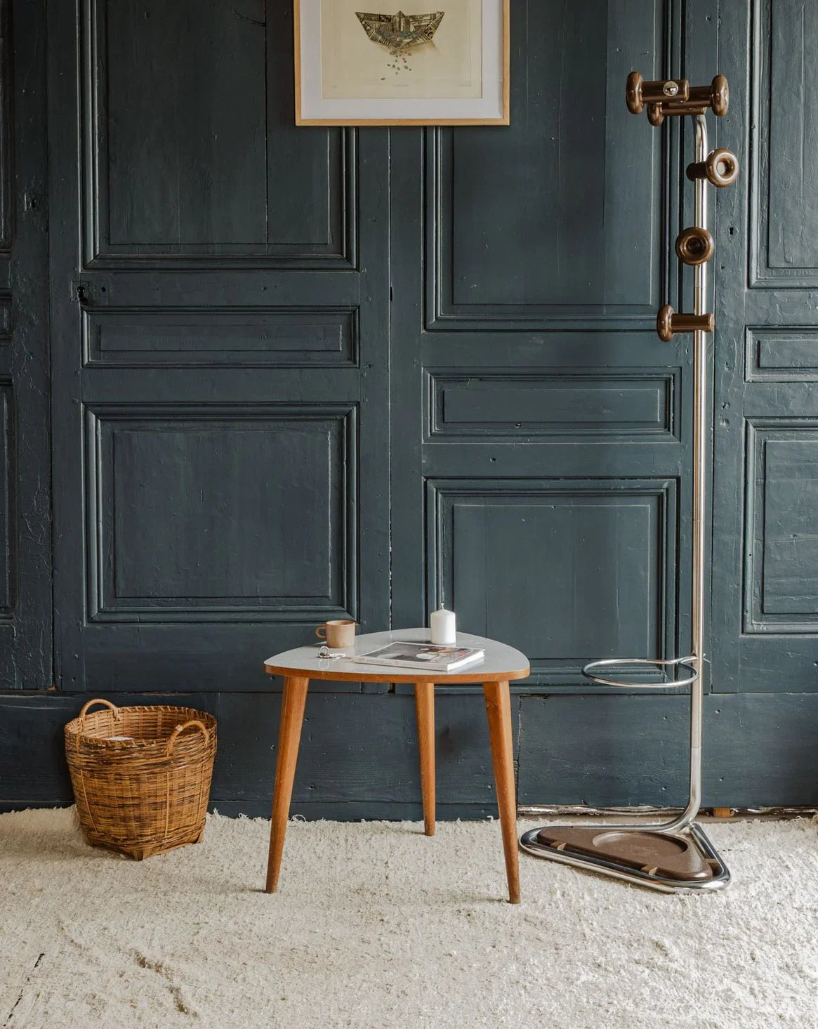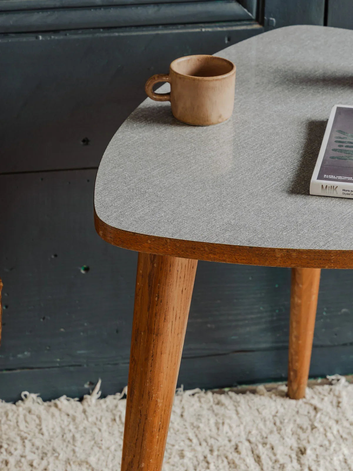 Ajoutez une touche graphique à votre intérieur avec cette table d'appoint au plateau triangulaire en bois, rehaussée d'un liseré gris élégant et soutenue par des pieds en bois. Sa silhouette s'insère naturellement dans un coin salon ou près d'un fauteuil pour accueillir une lampe, une tasse ou une plante. Le contraste du bois chaleureux et du liseré apporte une note contemporaine et raffinée à la pièce. Quelques traces du temps présentes.
