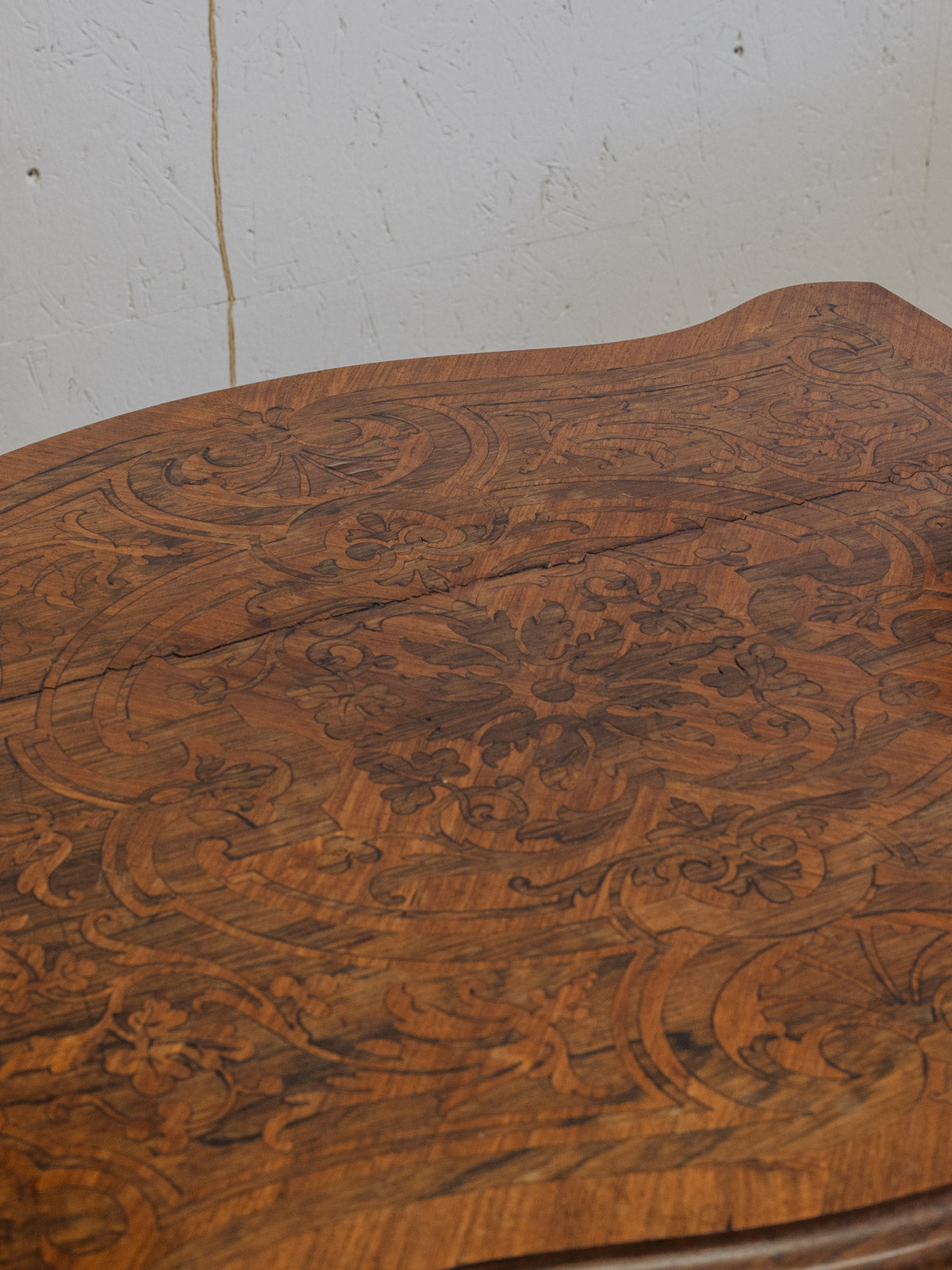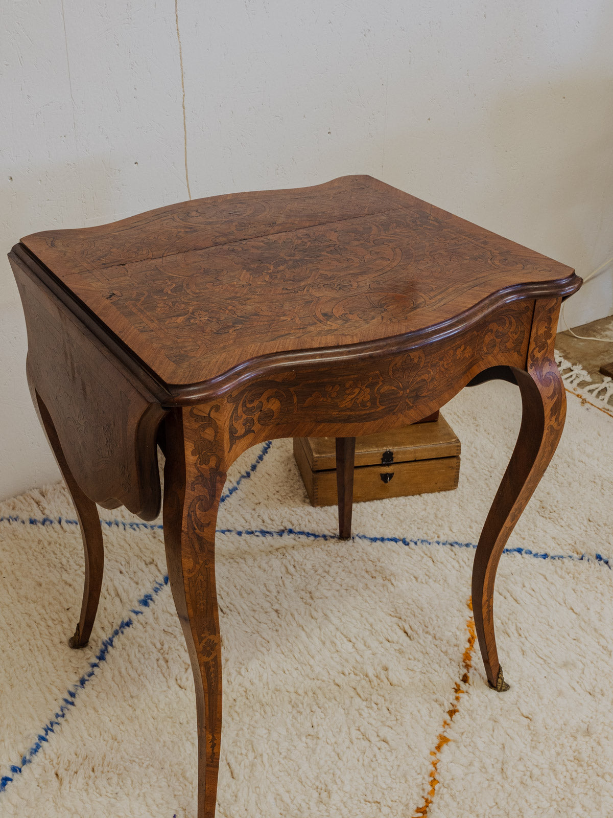 Sublimez votre intérieur avec cette table d'appoint, anciennement table à thé Napoléon III, en bois ornée de dessins floraux délicats qui lui confèrent une élégance empreinte d'histoire. Pratique au quotidien, elle se déploie via ses volets latéraux pour agrandir le plateau, tandis qu'un petit tiroir muni d'une serrure sans clé permet de ranger quelques objets. Idéale en bout de canapé, dans une entrée ou un coin salon pour une atmosphère chaleureuse et sobre. Quelques traces du temps présentes.