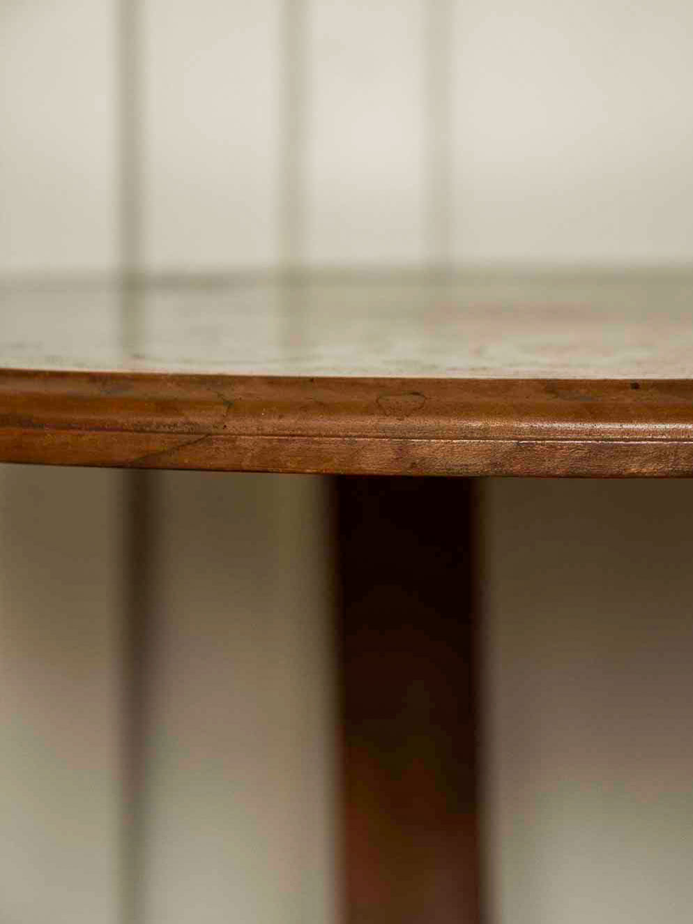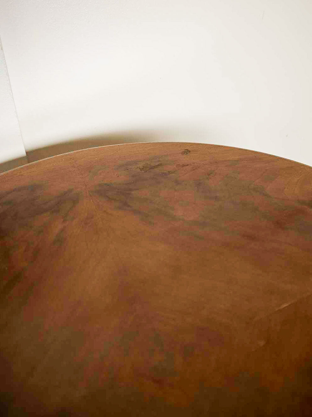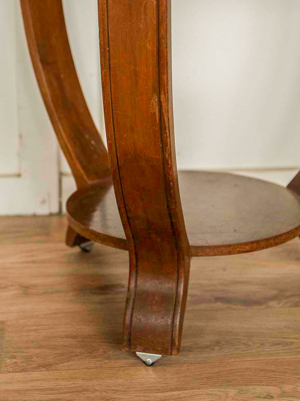 Découvrez ce guéridon sur roulettes en bois foncé au plateau rond, parfait comme table d'appoint dans un salon ou une entrée. Tripode aux pieds courbés, il s’appuie sur un petit plateau bas pratique pour poser livres ou objets, et ses roulettes discrètes permettent de le déplacer facilement. Le bois montre de belles nervures et une patine chaleureuse qui lui confèrent une présence sobre et inspirante. Format généreux en surface, idéal pour une lampe, un plateau de service ou un coin café. Des traces de dessous de verre, et traces du temps qui participent à son charme.