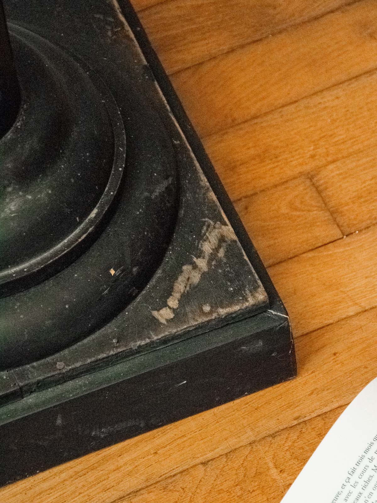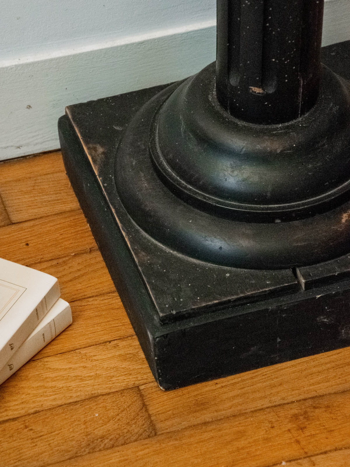 Adoptez cette sellette ancienne en bois peint noir, dont la colonne élancée et le plateau carré apportent une silhouette raffinée et graphique à votre intérieur. Compacte et verticale, elle met en valeur une plante, une lampe ou une pièce d'art, offrant une présence discrète mais affirmée dans une entrée, un salon ou une chambre. Le bois, patiné par le temps, révèle une belle matière et des trous de vers ont été traités. Quelques marques d'usage qui font son authenticité. Traces d'usures variables suivant la colonne. Vendue à l'unité, deux quantités sont disponibles.