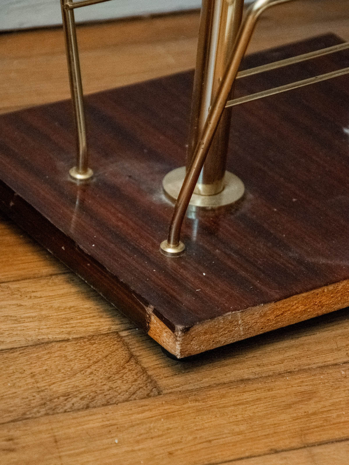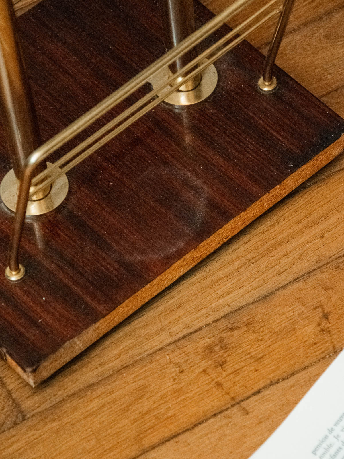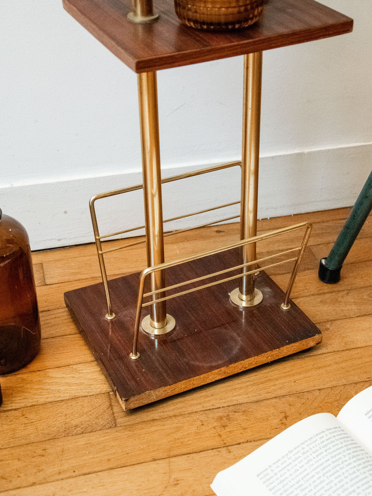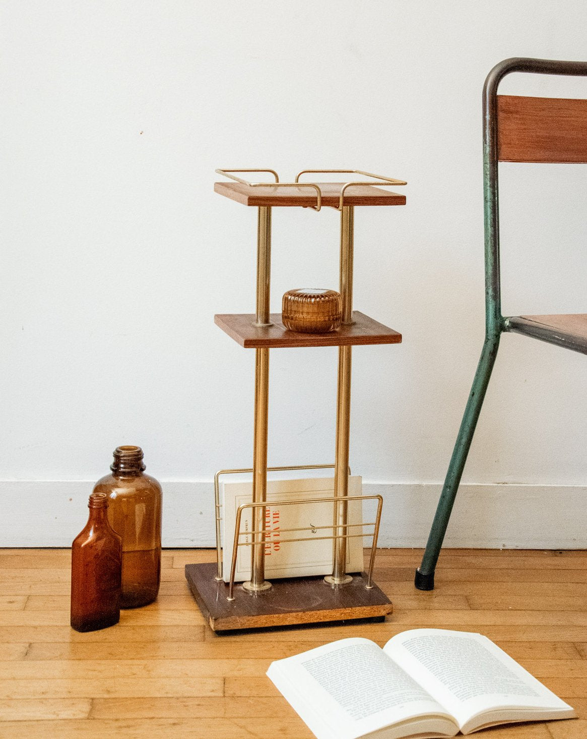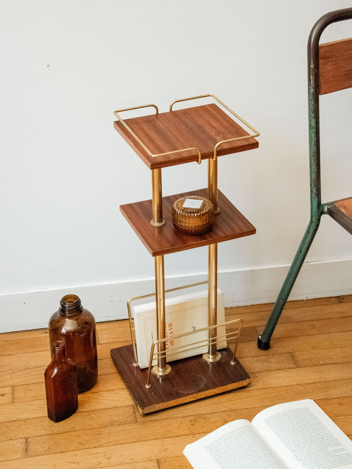 Apportez une touche vintage et lumineuse avec cette sellette en métal et formica, rehaussée d’un métal doré qui capte la lumière avec élégance. Ses étagères multiples offrent une lecture polyvalente — support de lampe, présentoir pour plantes ou console d’appoint dans un espace compact — grâce à ses proportions équilibrées. Le contraste entre la surface lisse du formica et la structure métallique crée une ambiance rétro-chic chaleureuse. Quelques marques d'usage qui font son authenticité.