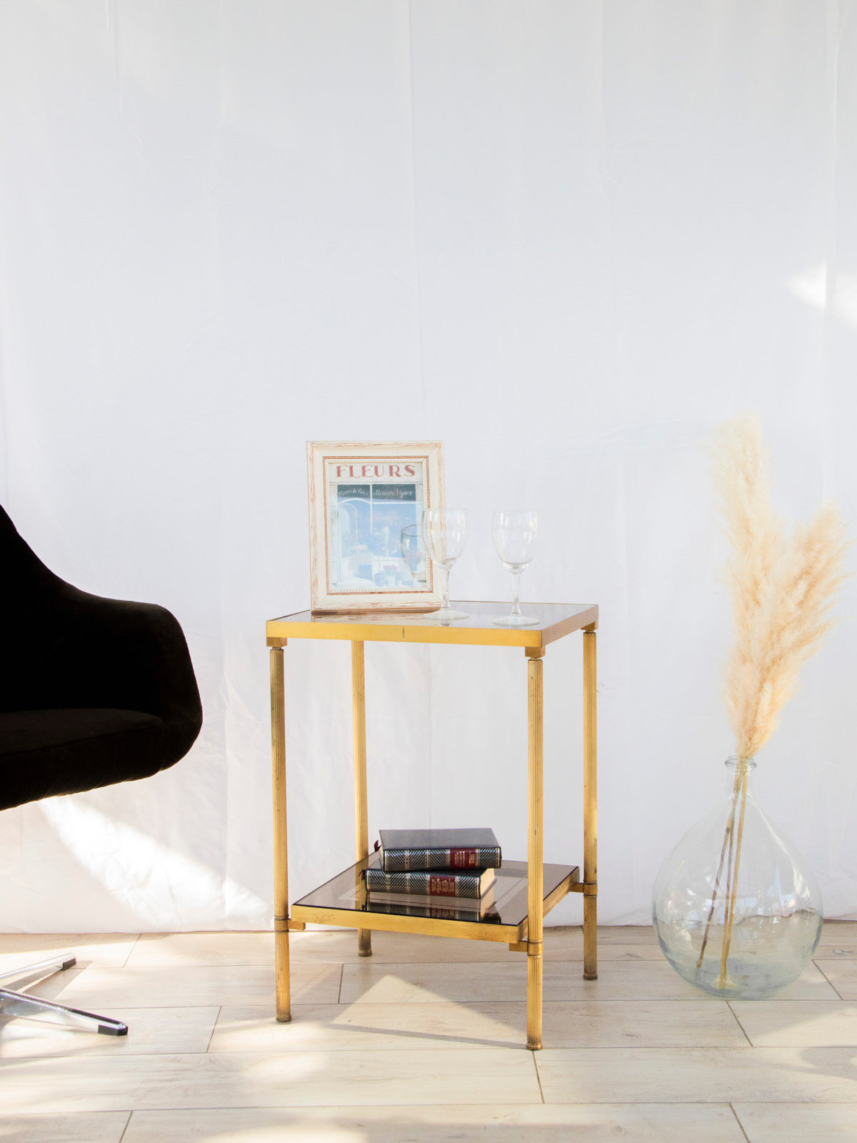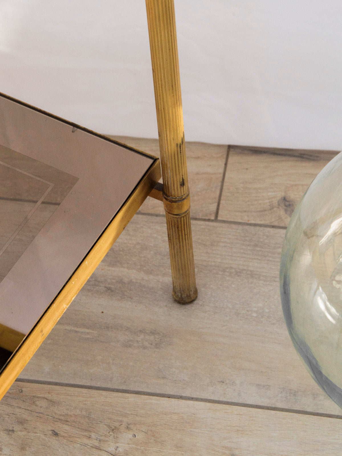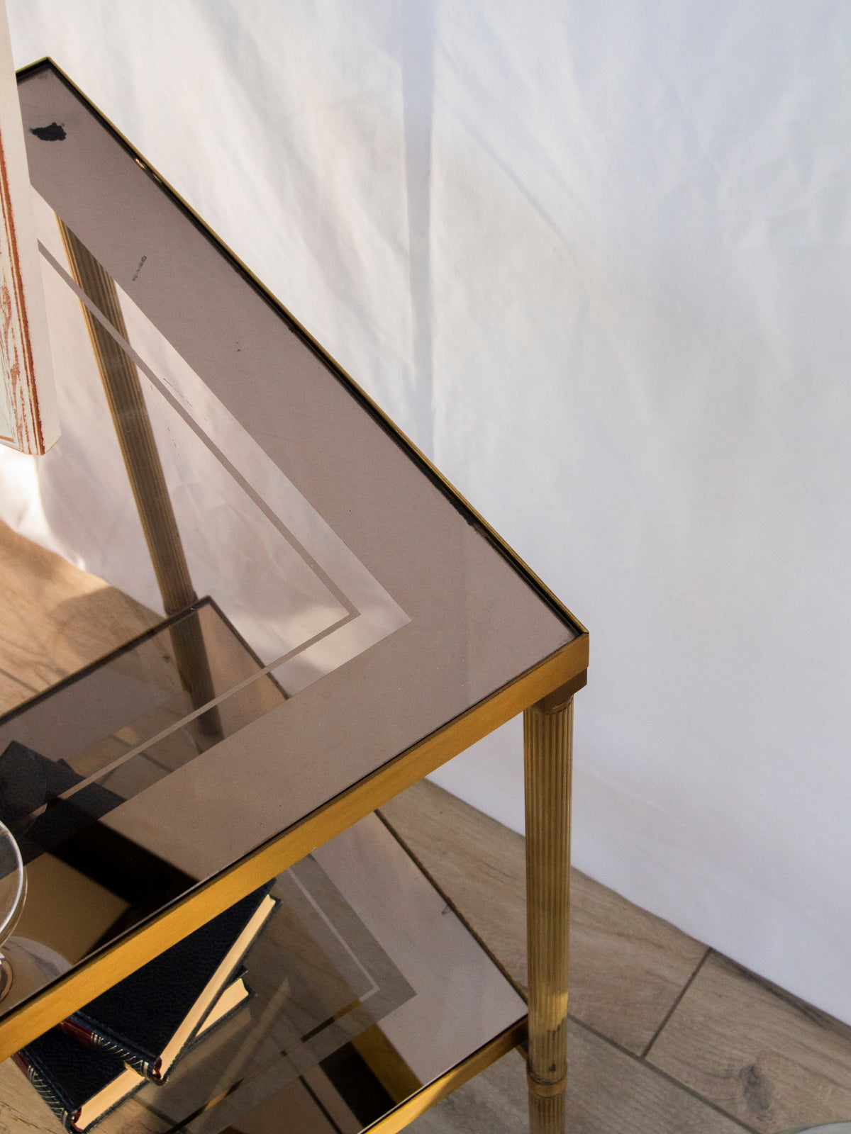 Ajoutez une touche de lumière et de raffinement avec cette table d'appoint en laiton doré, dotée de deux étagères en verre fumé encadrées d'un contour miroir. Ses proportions compactes la rendent idéale pour un coin salon ou une entrée, offrant deux niveaux pour poser lampes, livres ou objets décoratifs. Le mariage du laiton chaud et du verre fumé crée une atmosphère feutrée et contemporaine, parfaite pour une décoration élégante sans ostentation. Quelques traces du temps sur le verre et taches noires d'oxydation naturelles sur le laiton.
