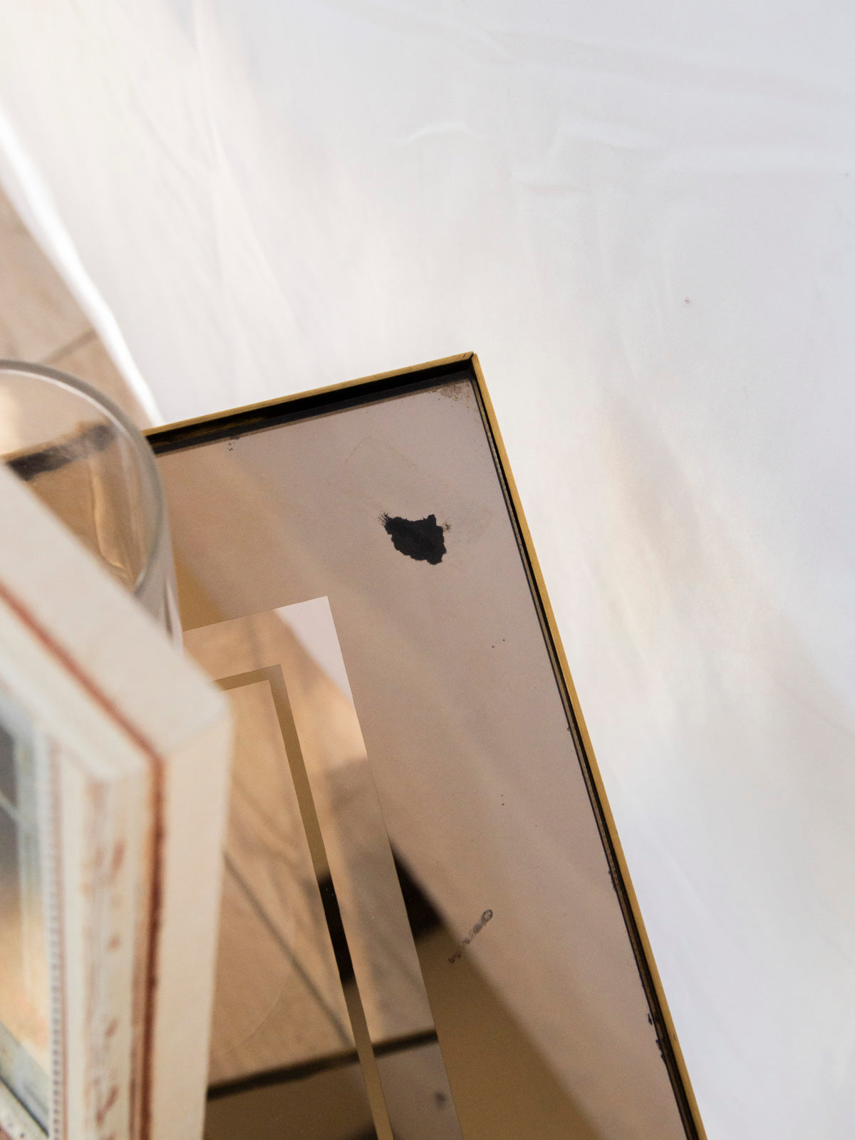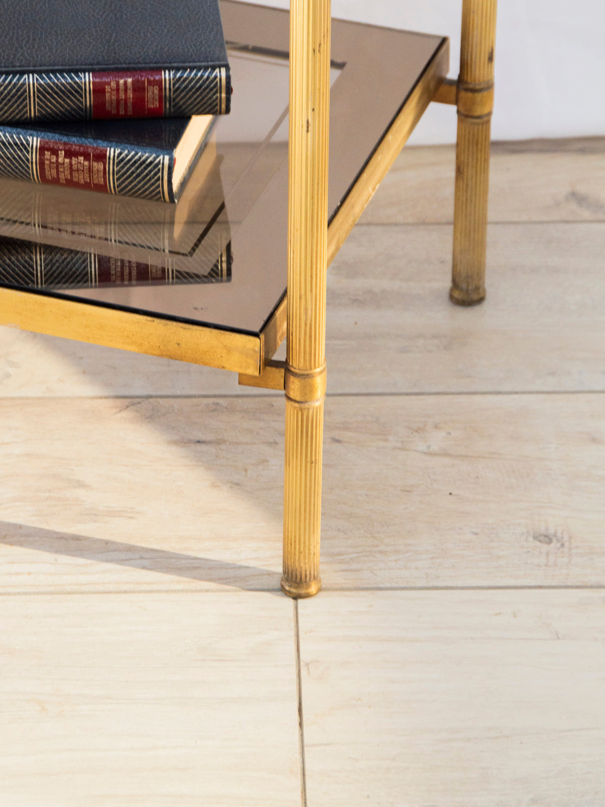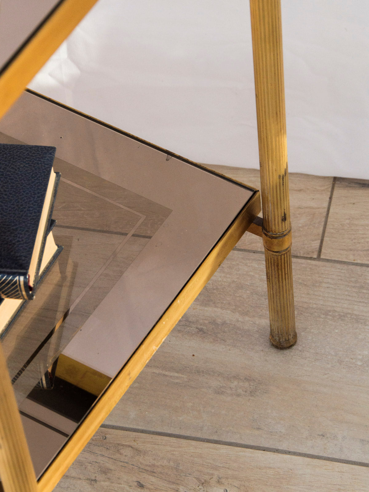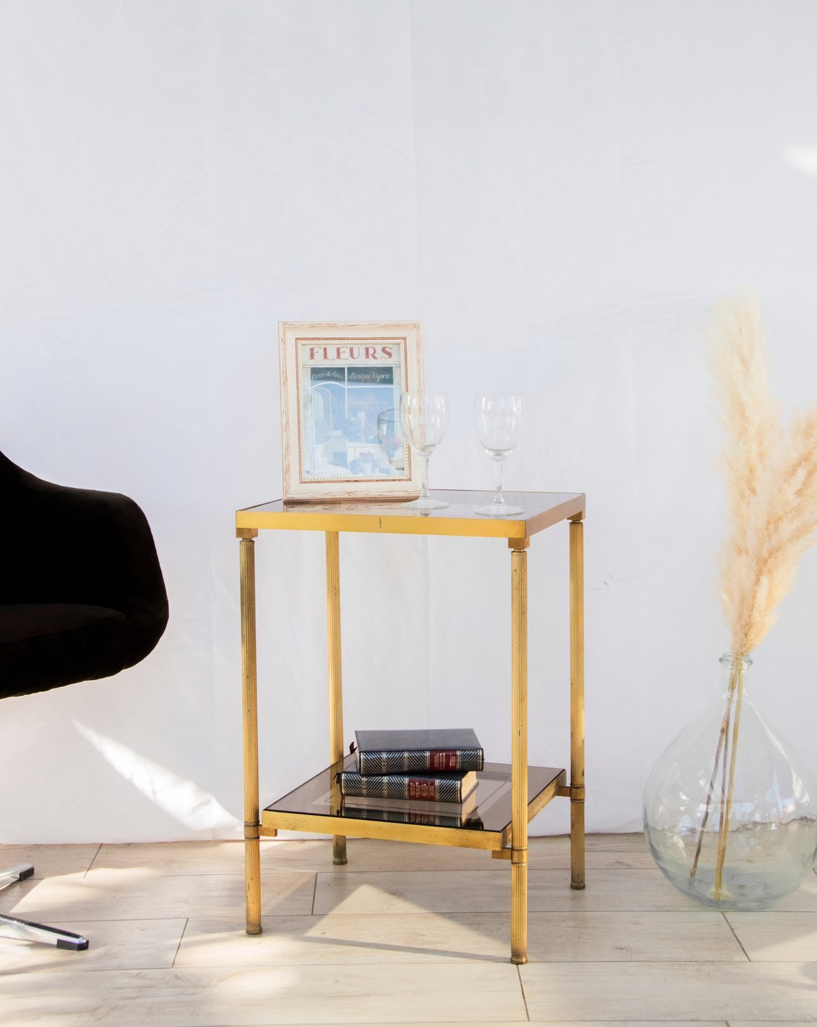Ajoutez une touche de lumière et de raffinement avec cette table d'appoint en laiton doré, dotée de deux étagères en verre fumé encadrées d'un contour miroir. Ses proportions compactes la rendent idéale pour un coin salon ou une entrée, offrant deux niveaux pour poser lampes, livres ou objets décoratifs. Le mariage du laiton chaud et du verre fumé crée une atmosphère feutrée et contemporaine, parfaite pour une décoration élégante sans ostentation. Quelques traces du temps sur le verre et taches noires d'oxydation naturelles sur le laiton.