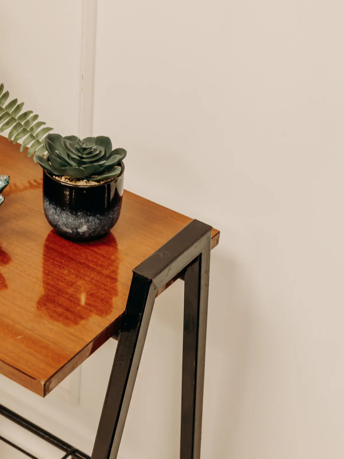Ajoutez cette console d'entrée au caractère épuré, associant une structure et une tablette en métal noir et un plaquage en bois foncé pour une élégance chaleureuse. Son gabarit étroit et allongé, prolongé par deux plateaux, permet d'optimiser un couloir ou une entrée sans encombrer l'espace, entre rangement discret et mise en scène décorative. Le contraste de matières crée une ambiance contemporaine et raffinée, parfaite pour une lampe, un vide-poche et quelques livres.