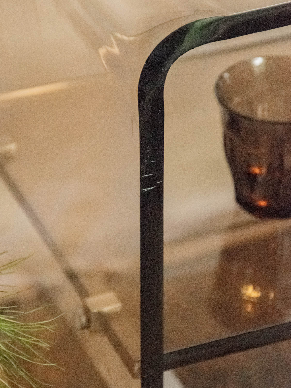 Adoptez ce meuble hi‑fi en plexiglas fumé, élégamment posé sur roulettes soutenues par réglettes en chrome qui mêlent légèreté visuelle et robustesse. Son plateau central accueille amplis et lecteurs tandis que ses proportions offrent une circulation d'air et un accès pratique aux câbles, idéal pour un salon contemporain ou un coin musique. Lignes sobres et matière translucide créent une ambiance à la fois discrète et contemporaine. Il peut également mettre en valeur vos livres et objets décoratifs, ou servir de meuble d'appoint. Légères traces du temps discrètes.