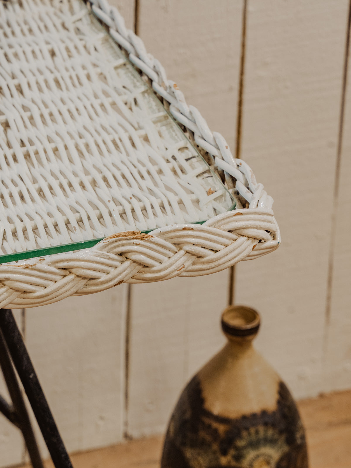 Apportez cette table d'appoint au plateau en rotin blanc surmonté d'une vitre en verre et reposant sur des pieds en métal noir, qui conjugue chaleur naturelle et lignes contemporaines. Ses proportions la rendent idéale pour un coin salon, une chambre ou une entrée, offrant une surface légère pour lampe et livres sans encombrer l'espace. Le contraste matière/métal crée une ambiance sobre et accueillante, parfaite pour un intérieur bohème-chic. Quelques traces du temps présentes.