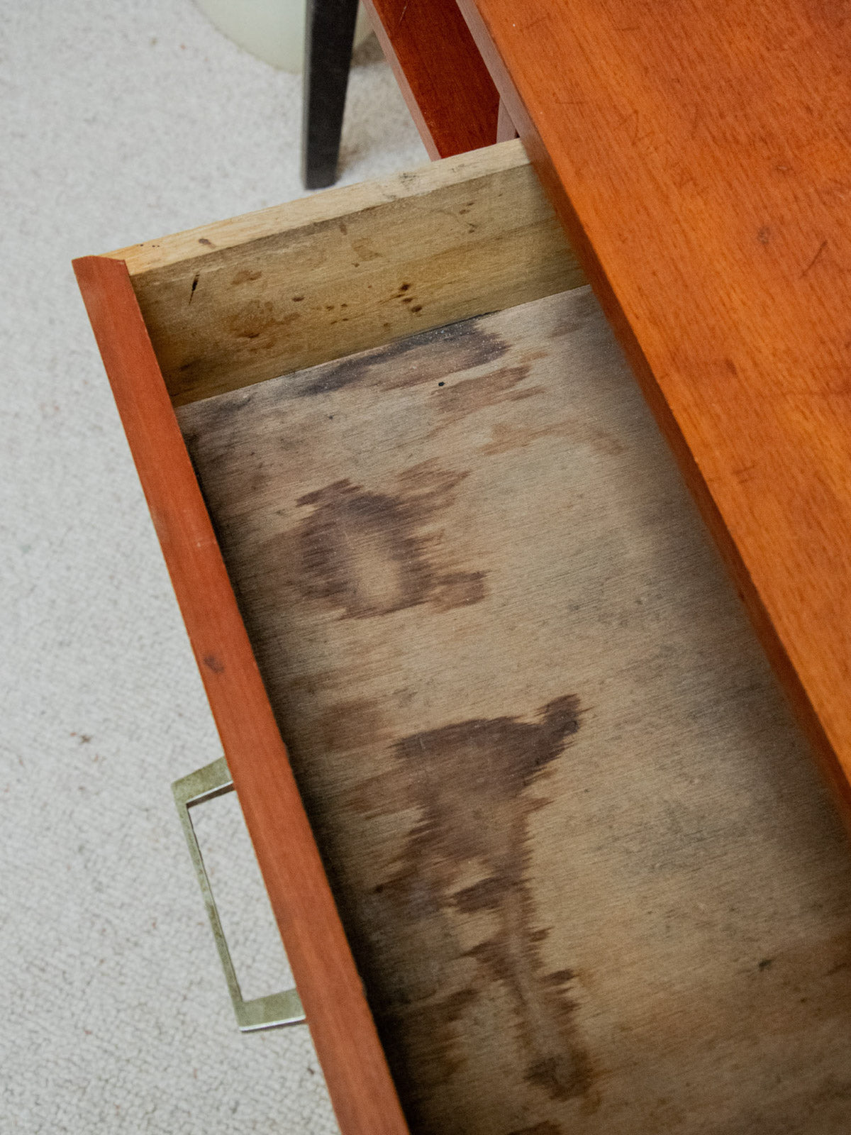 Ajoutez une touche vintage à votre intérieur avec cette console élégante des années 60. Réalisée en teck, elle se distingue par ses pieds en bois noir et sa poignée en laiton légèrement piquée, témoignant de son authenticité. Pratique, elle peut servir à la fois de table d'appoint ou de bureau d'appoint, bien que la hauteur sous le tiroir soit basse. Quelques traces sur le plateau ajoutent du caractère à ce meuble unique, parfait pour les amateurs de décoration rétro. Intérieur du tiroir usé.